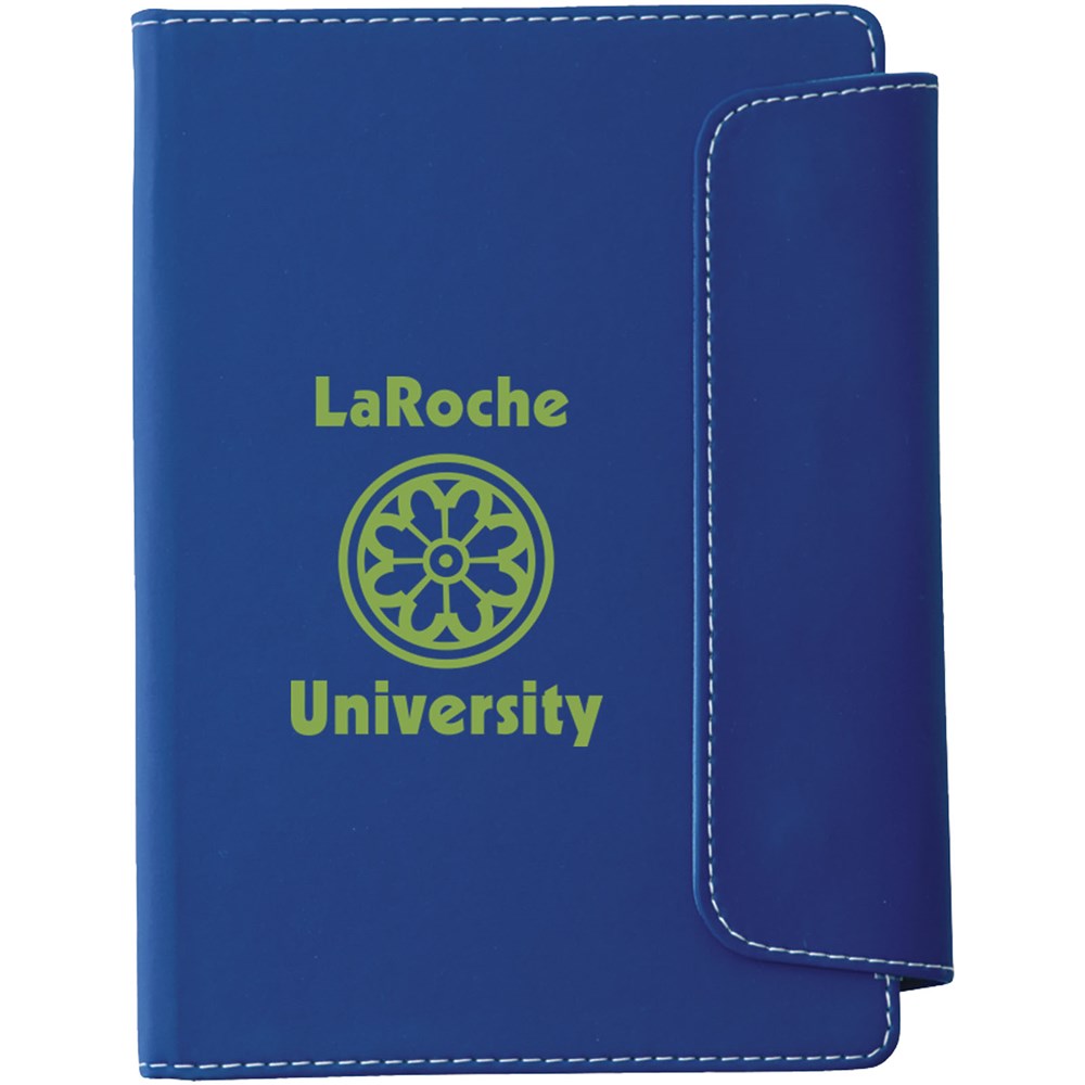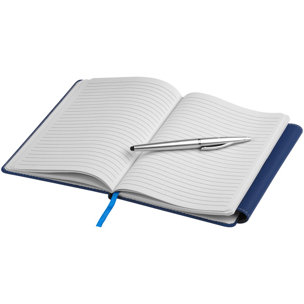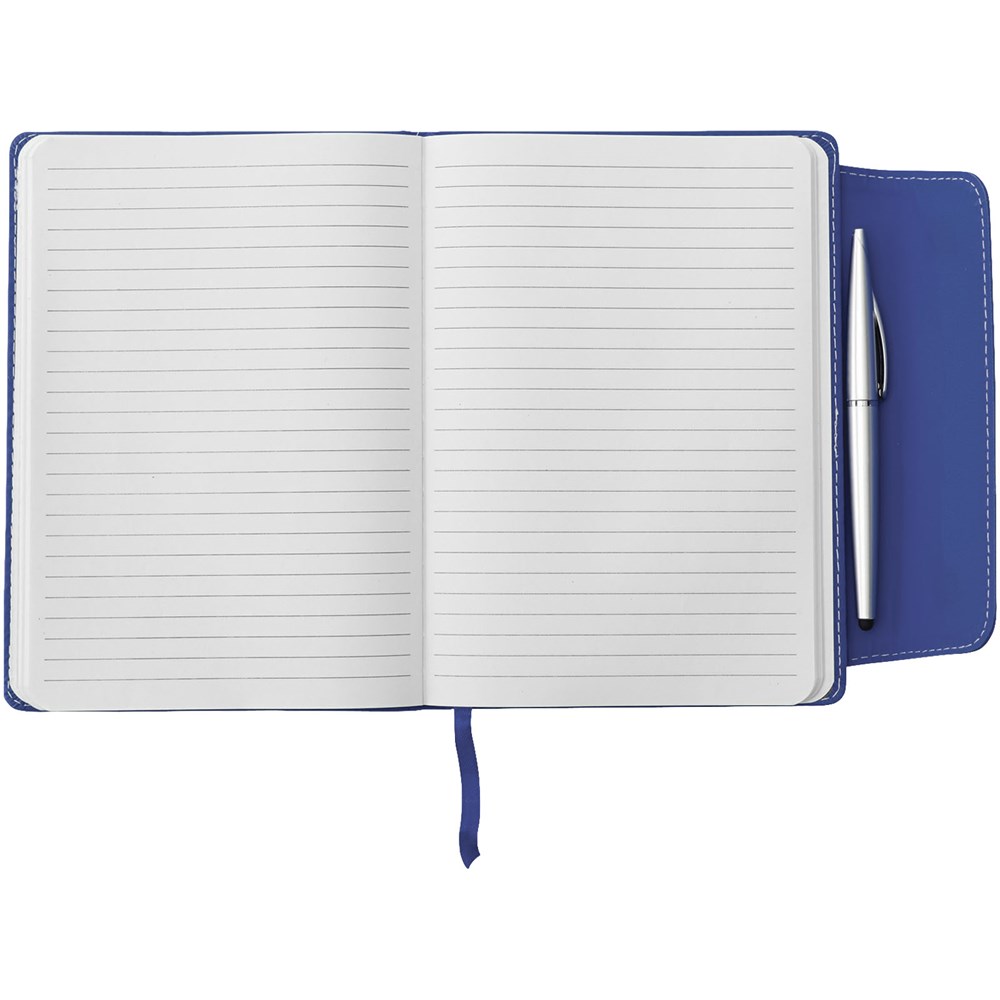 Ingebonden A5 formaat notitieboek met magneetsluiting. Met kunststof stylus balpen en 80 pagina's van 70 gram gelinieerd papier.