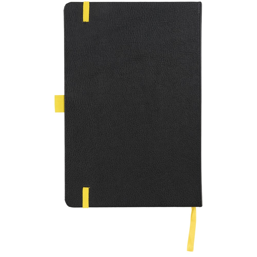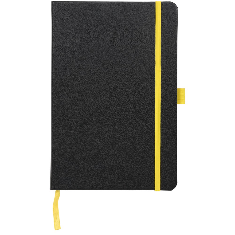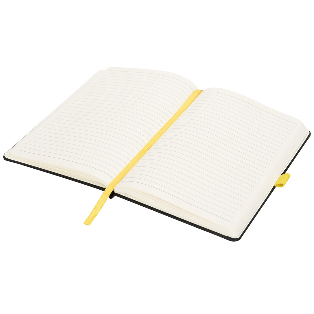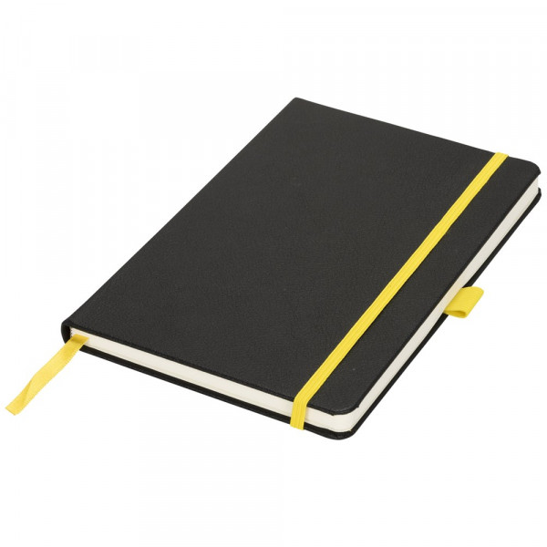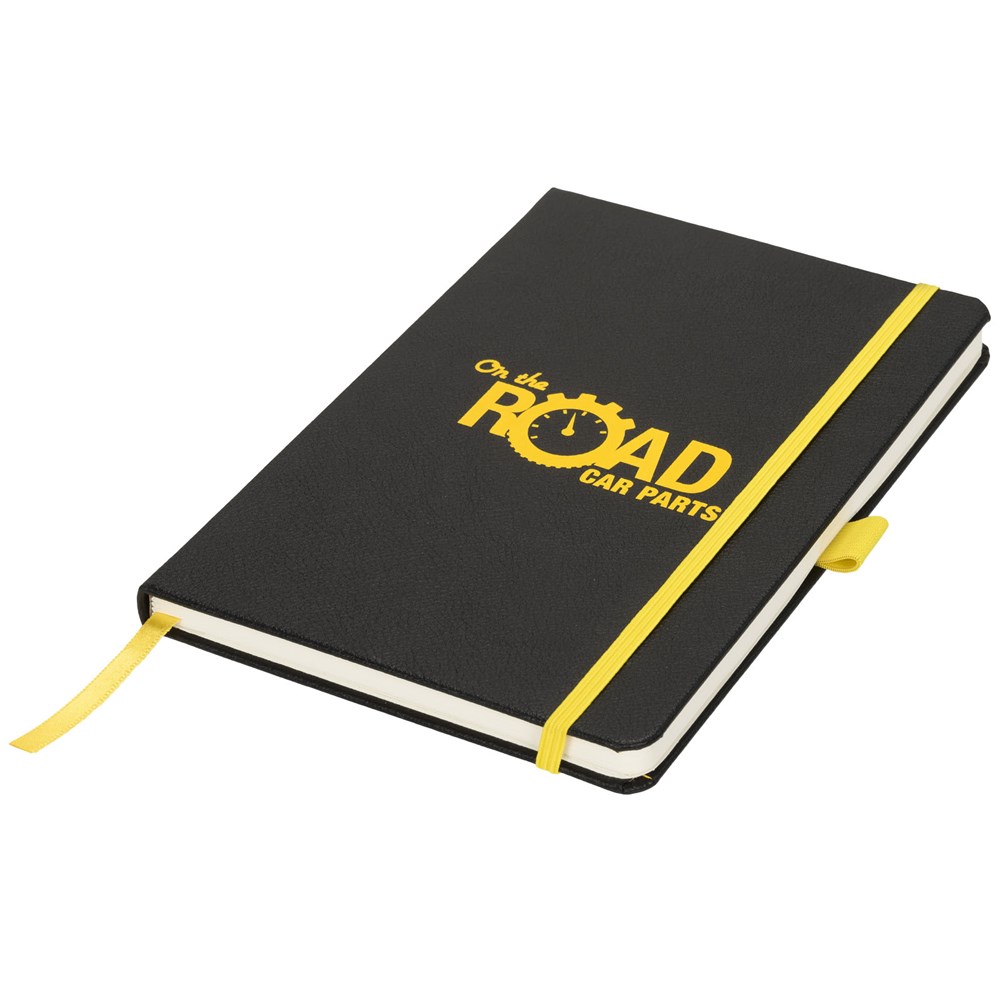 A5 formaat notitieblok met harde kaft, met uw logo of merknaam in blauw, rood, groen of geel na lasergravure. Inclusief elastische sluiting in bijpassende kleur, bladwijzer en elastisch penlusje. 80 g/m2, 80 vellen crèmekleurig lijntjespapier. Heeft tevens een uitbreidbaar vakje aan de achterkant voor kleine notitieblaadjes. Verpakt in een hoes.