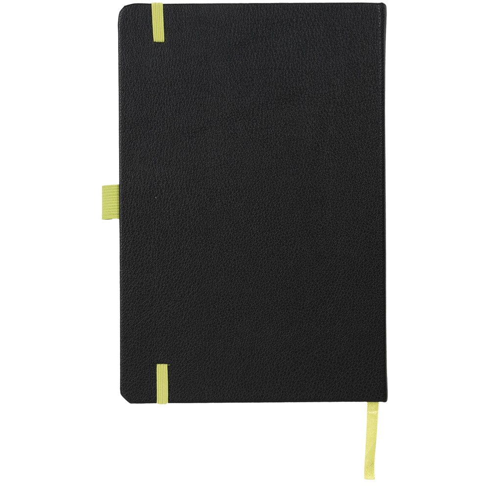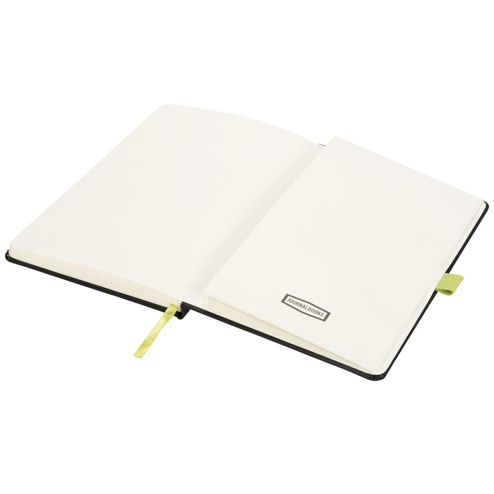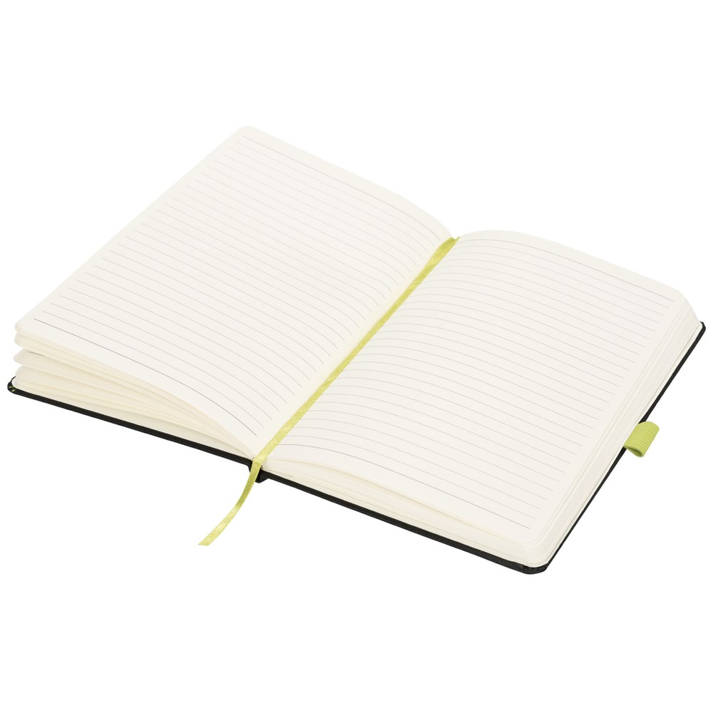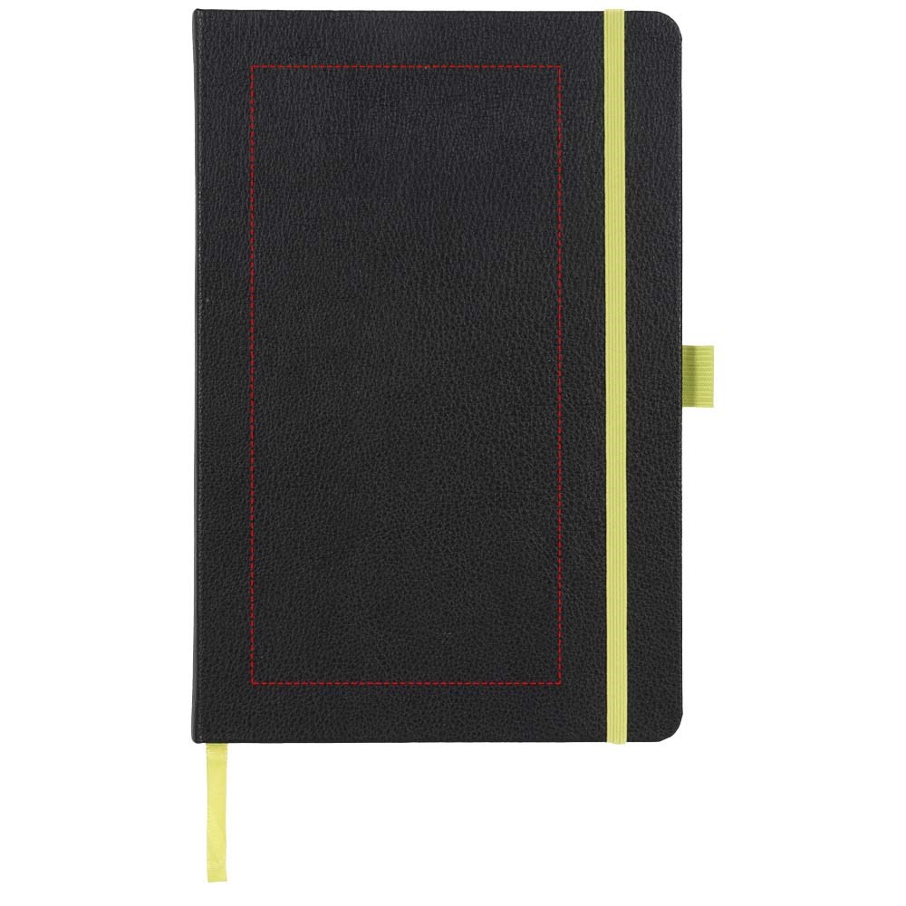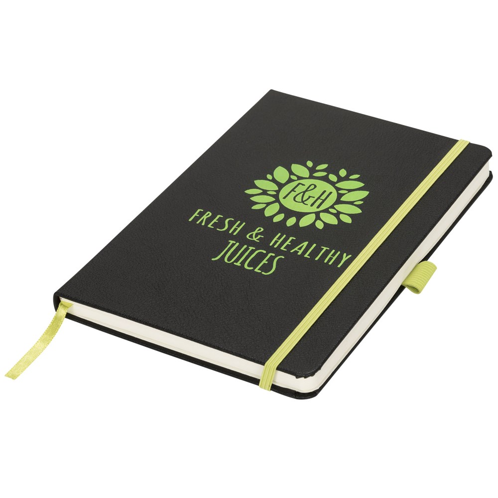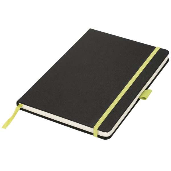 A5 formaat notitieblok met harde kaft, met uw logo of merknaam in blauw, rood, groen of geel na lasergravure. Inclusief elastische sluiting in bijpassende kleur, bladwijzer en elastisch penlusje. 80 g/m2, 80 vellen crèmekleurig lijntjespapier. Heeft tevens een uitbreidbaar vakje aan de achterkant voor kleine notitieblaadjes. Verpakt in een hoes.