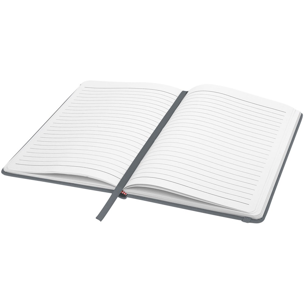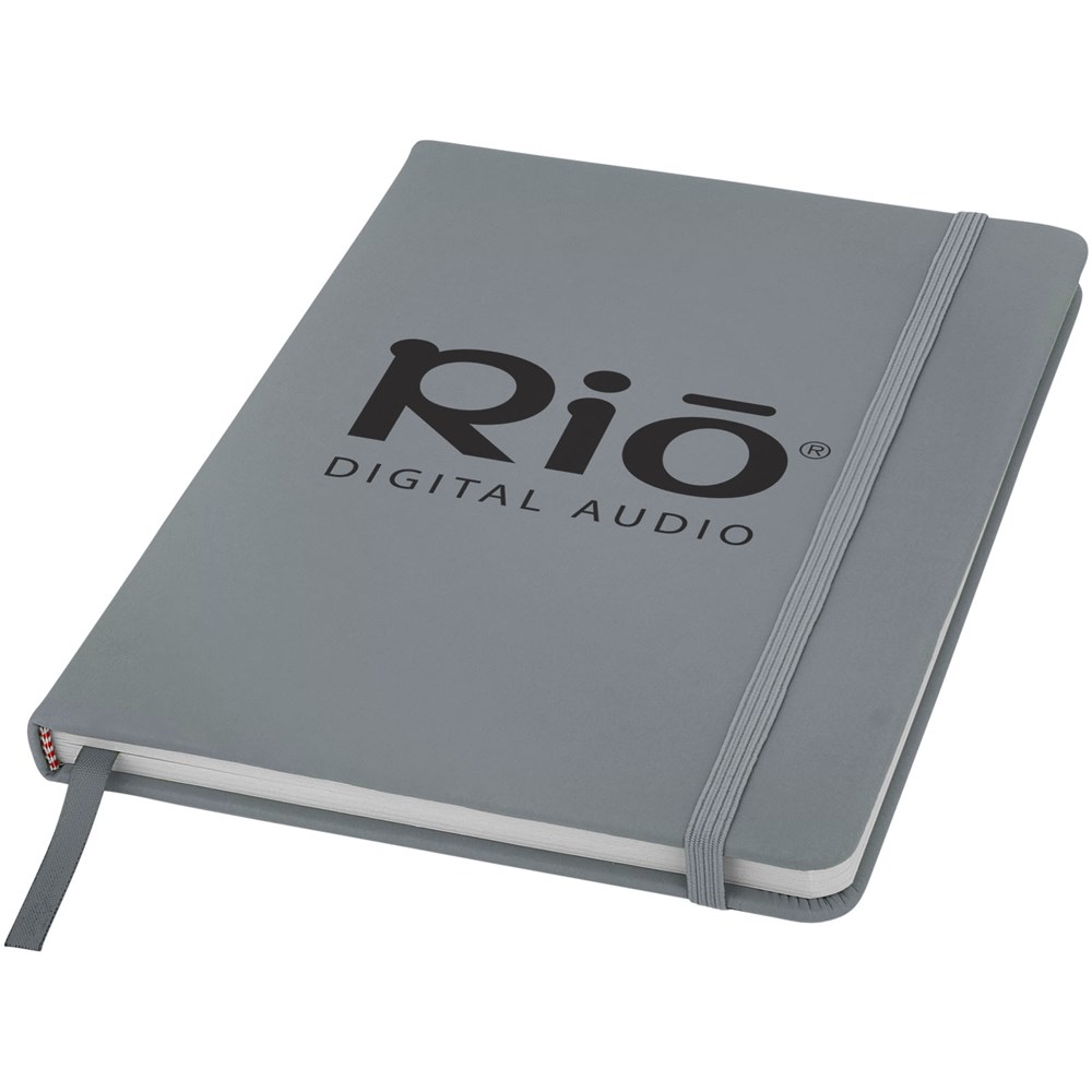 A5 formaat notitieboek met bijpassende gekleurde elastieksluiting en paginalint. 96 pagina's van 60g/m2 gelinieerd papier. Pagina's niet helder wit.