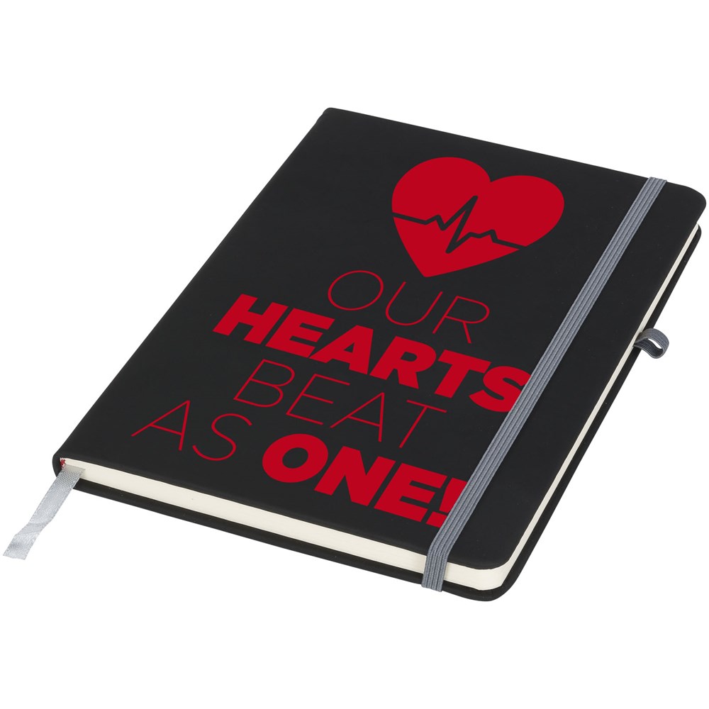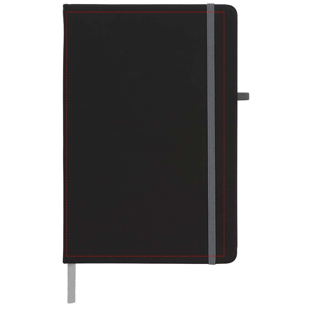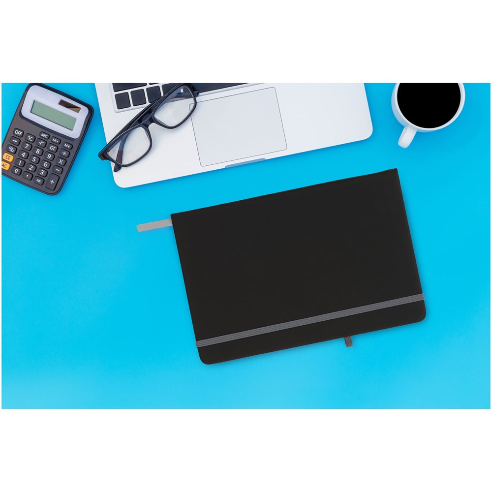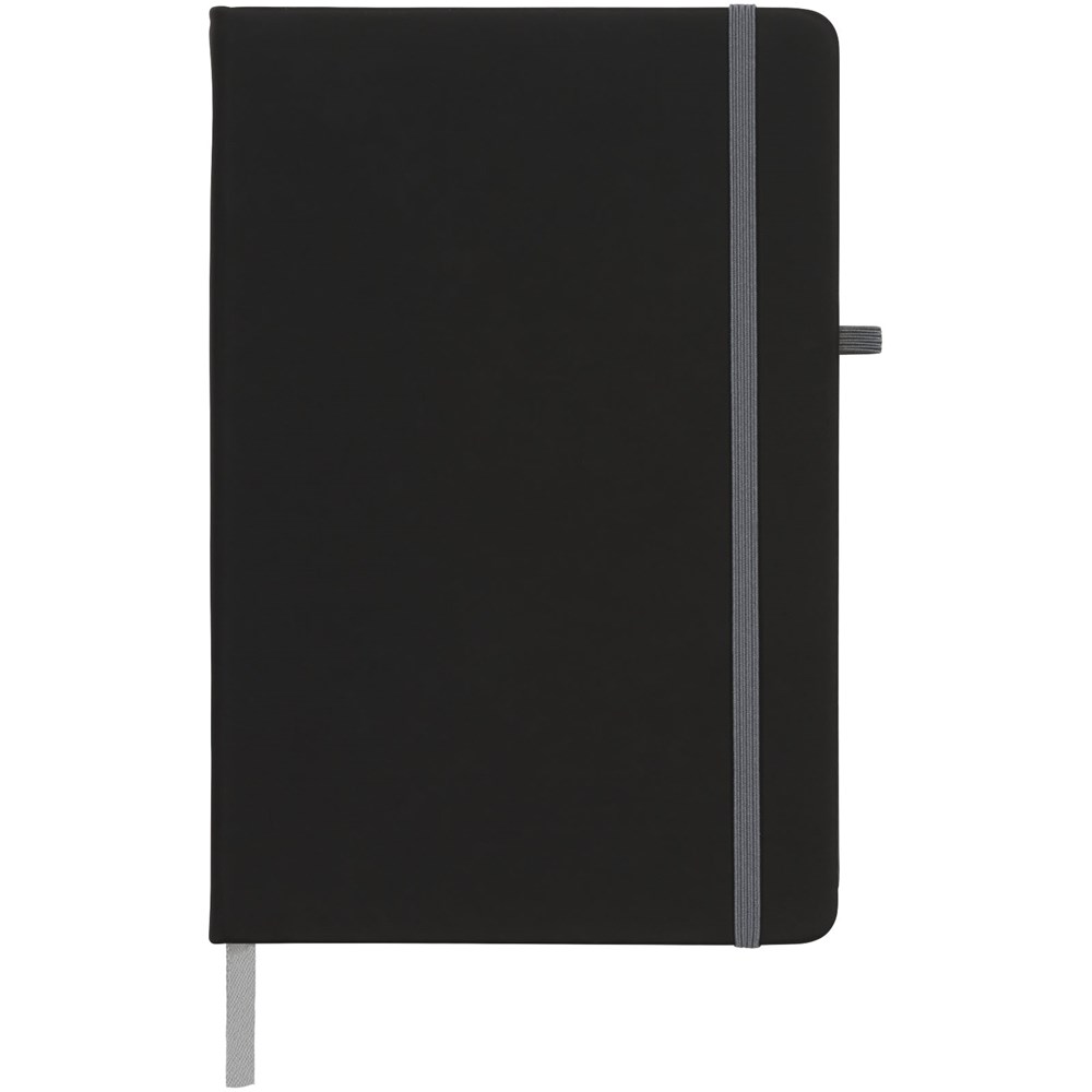 Het Noir-notitieboek heeft een zachte, zwarte omslag van PU voor een tastbare afwerking. Elk notitieboek heeft een gekleurd sluitbandje, penlus en bladwijzer. Het notitieboek bevat 96 bladen (70g/m2) crèmekleurig lijntjespapier.