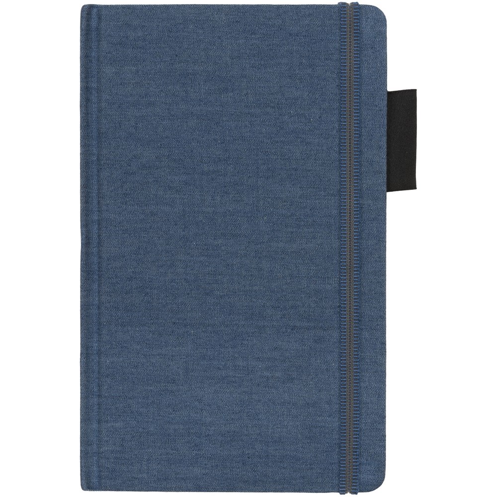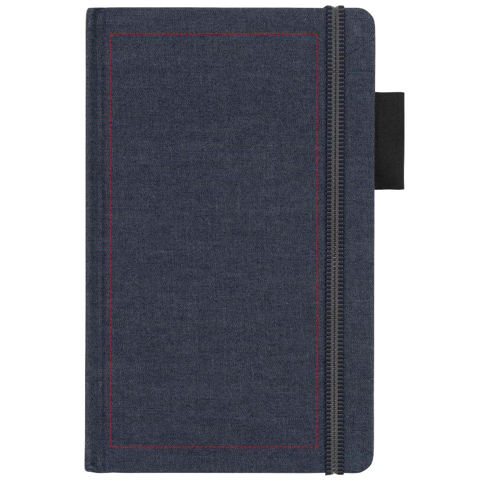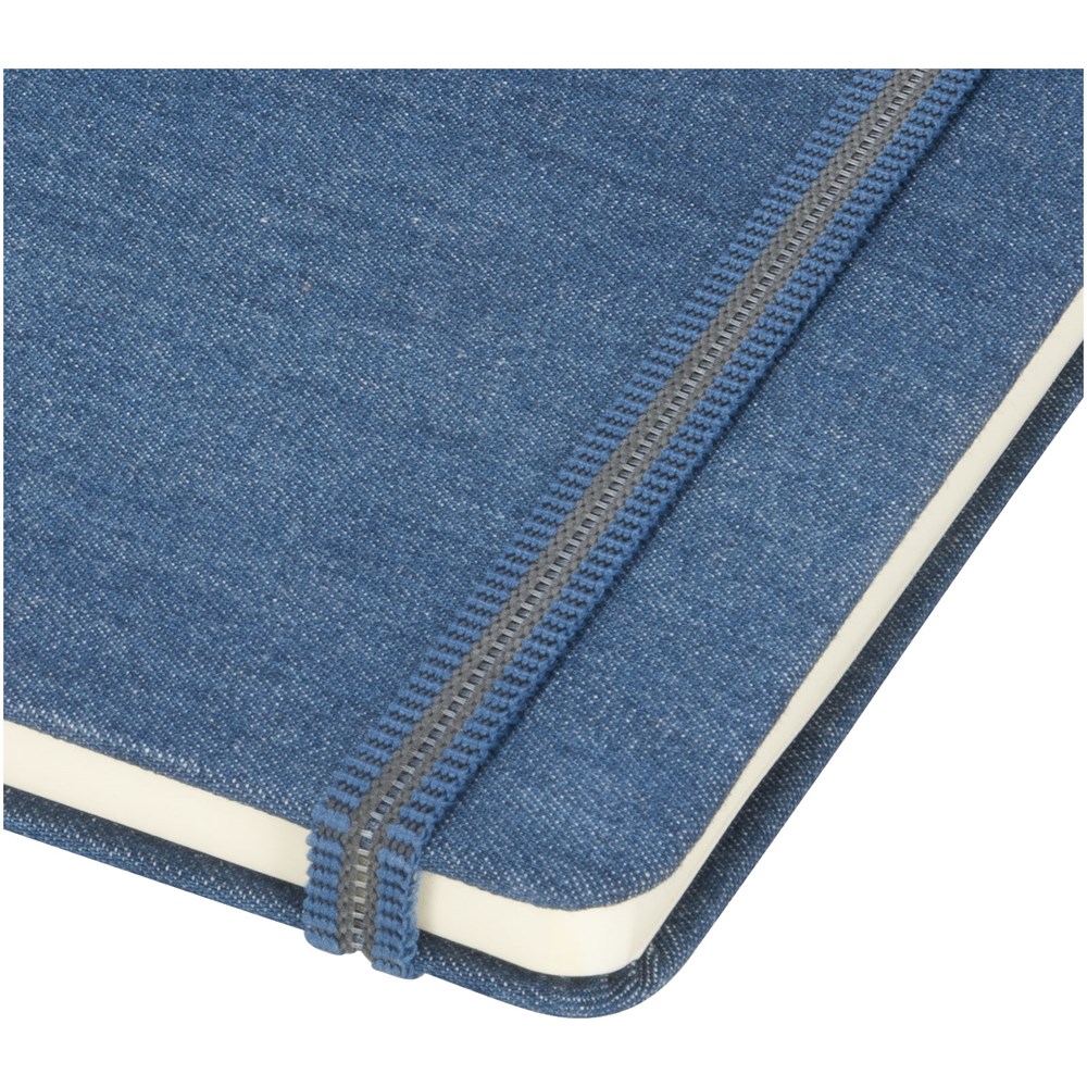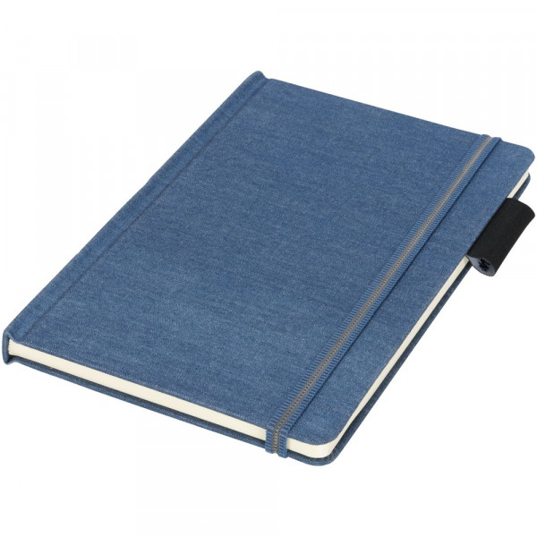 A5-formaat notitieboek van jeansstof met 80 bladen (80gsm) crèmekleurig lijntjespapier, speciaal ontworpen elastische sluiting, bladwijzer en penlus. Gepresenteeerd in een geschenkverpakking.