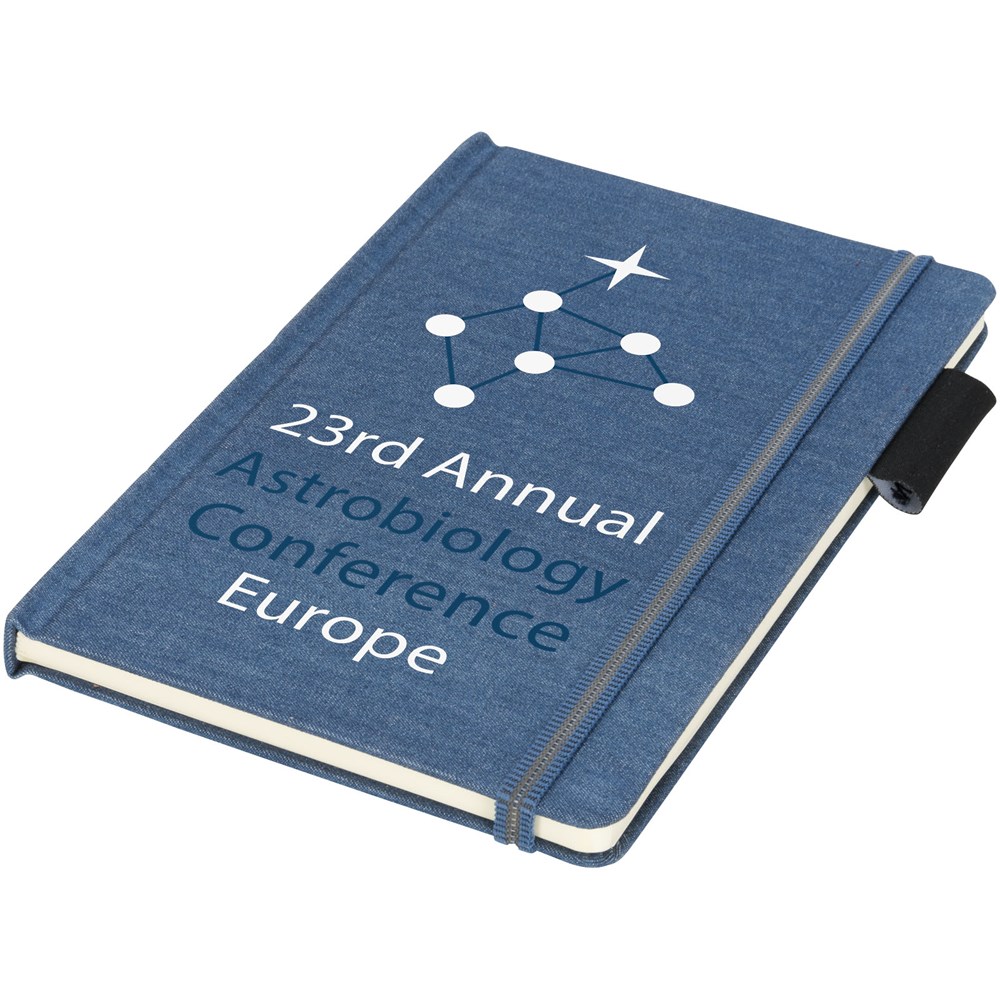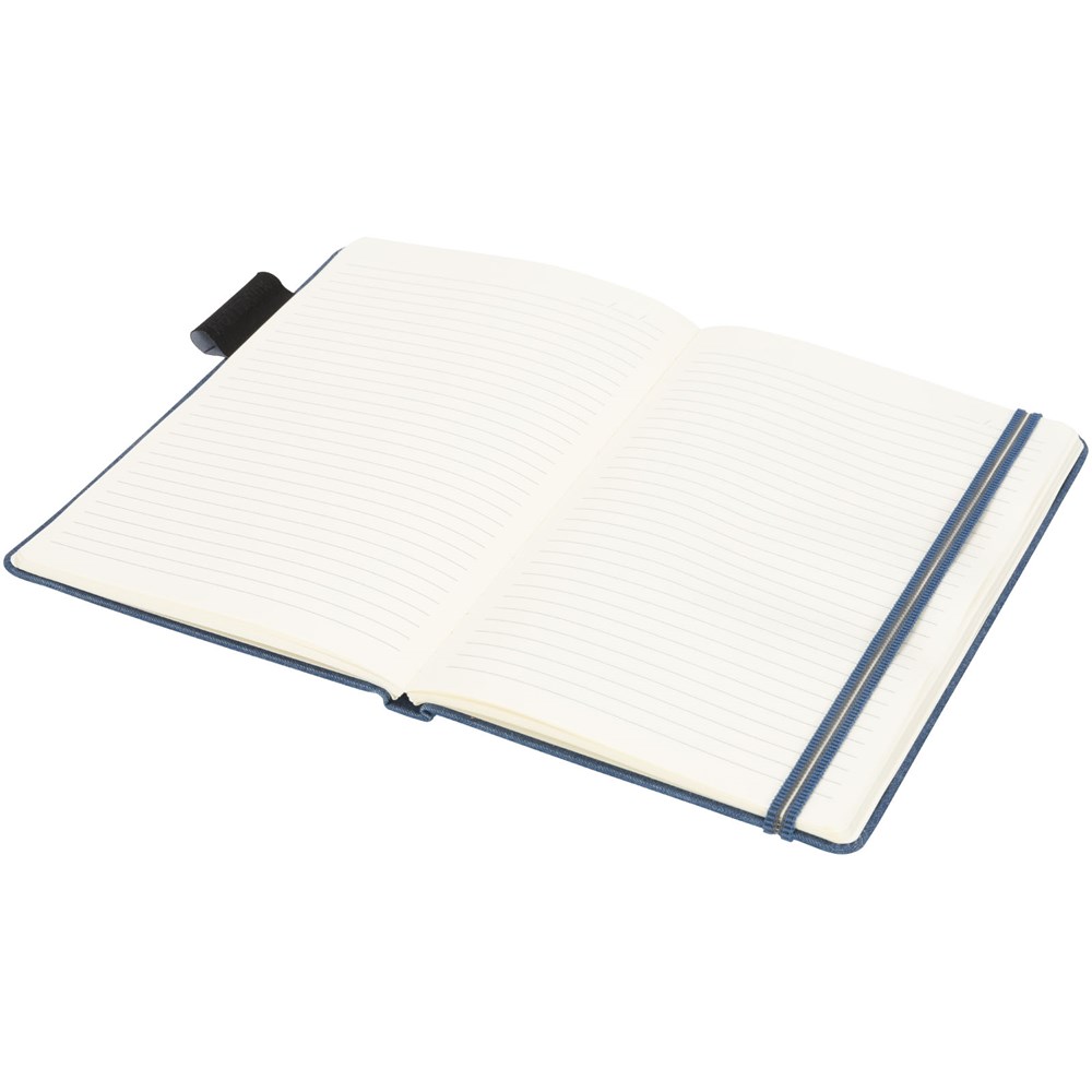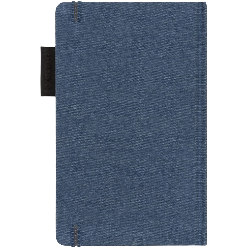 A5-formaat notitieboek van jeansstof met 80 bladen (80gsm) crèmekleurig lijntjespapier, speciaal ontworpen elastische sluiting, bladwijzer en penlus. Gepresenteeerd in een geschenkverpakking.