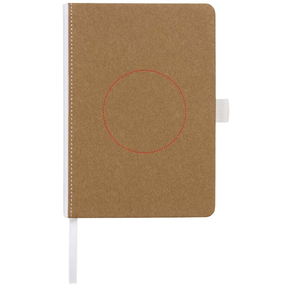 Kartonnen notitieboek met stoffen rug en naturel-look. Beschikt over 80 (70gsm) blanco pagina, een bladwijzer en penlus.