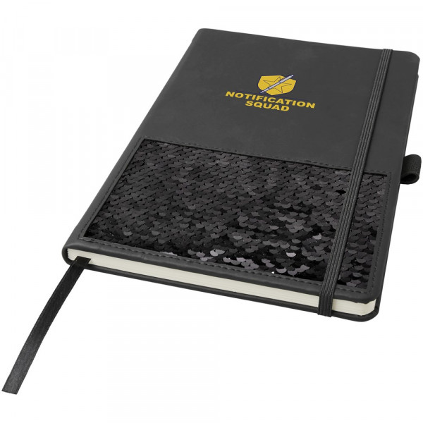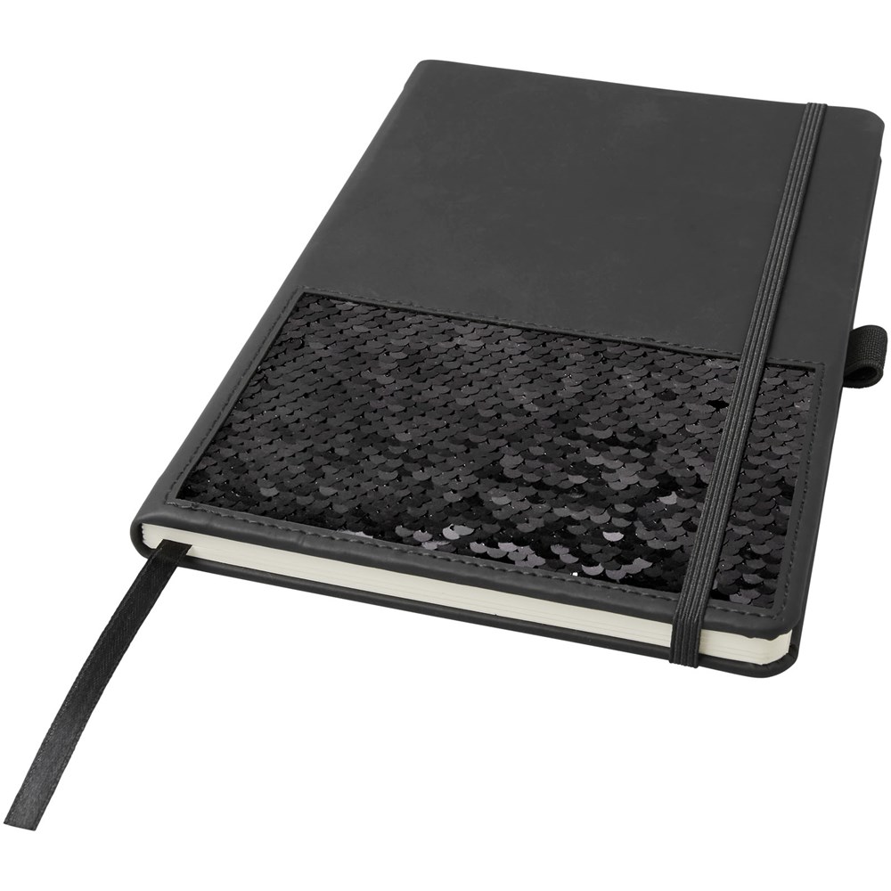 Notitieboekje met omkeerbare pailletten in zwart en zilver, geleverd in een zwarte luxe hoes. Specificaties: kaft (thermo PU): 15,6 cm x 21,2 cm, 70 g/m2 papier, 80 vellen crèmepapier, gelinieerde indeling, elastische sluiting, leeslint en een pennenlus.