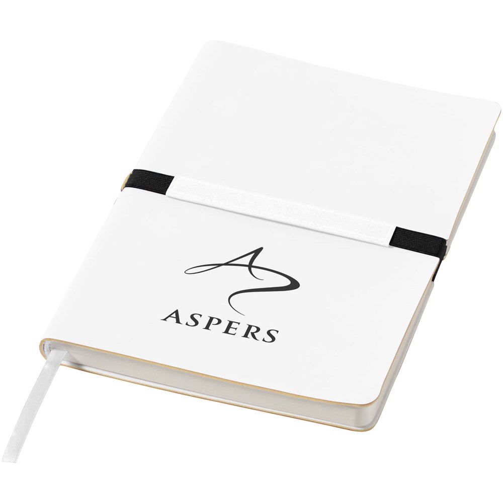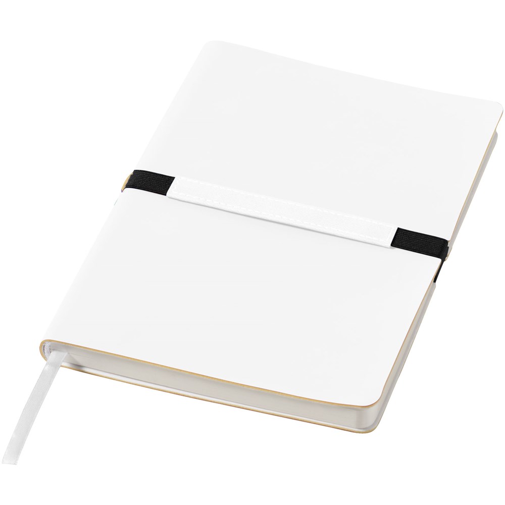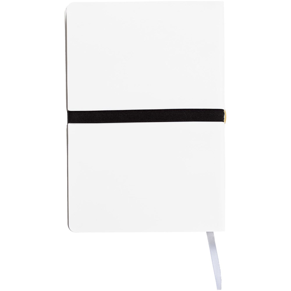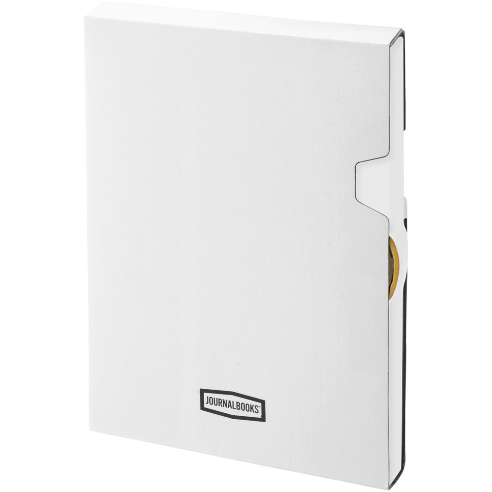 Mooi design A5 notitieboek met geheel eigen decoratiemogelijkheid op een speciaal gedeelte van de stevige, aan de rug bevestigde elastiekband. 96 pagina's van 80 gram gelinieerd papier. Geleverd in een Journalbooks geschenketui.