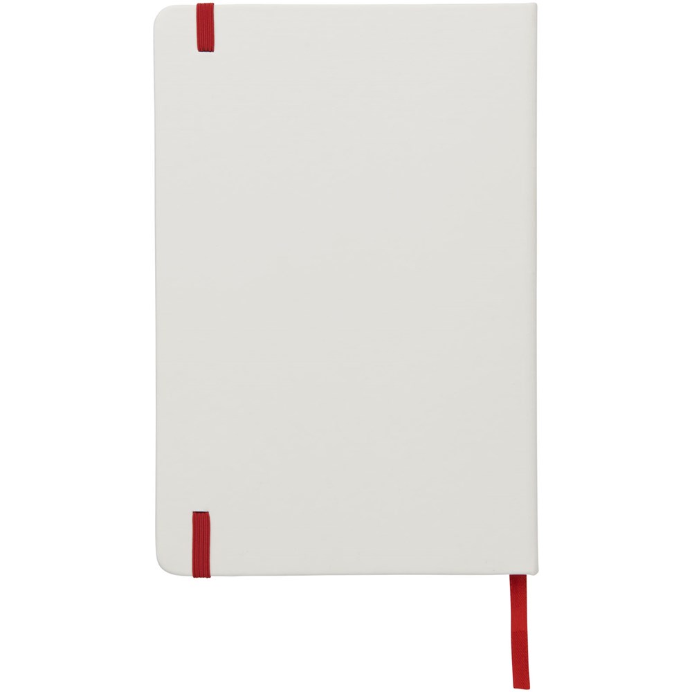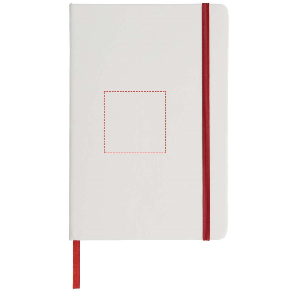 Witte A5 notitieboek met gekleurde elastische sluiting en lint. Inclusief 80 vellen (60 g / m2) gelinieerd papier. Digitaal printen mogelijk op omslag.