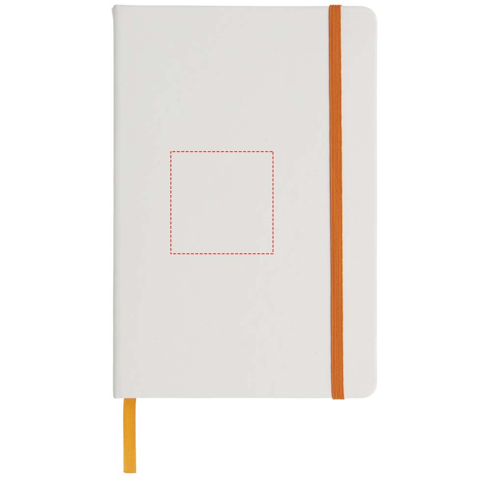 Witte A5 notitieboek met gekleurde elastische sluiting en lint. Inclusief 80 vellen (60 g / m2) gelinieerd papier. Digitaal printen mogelijk op omslag.