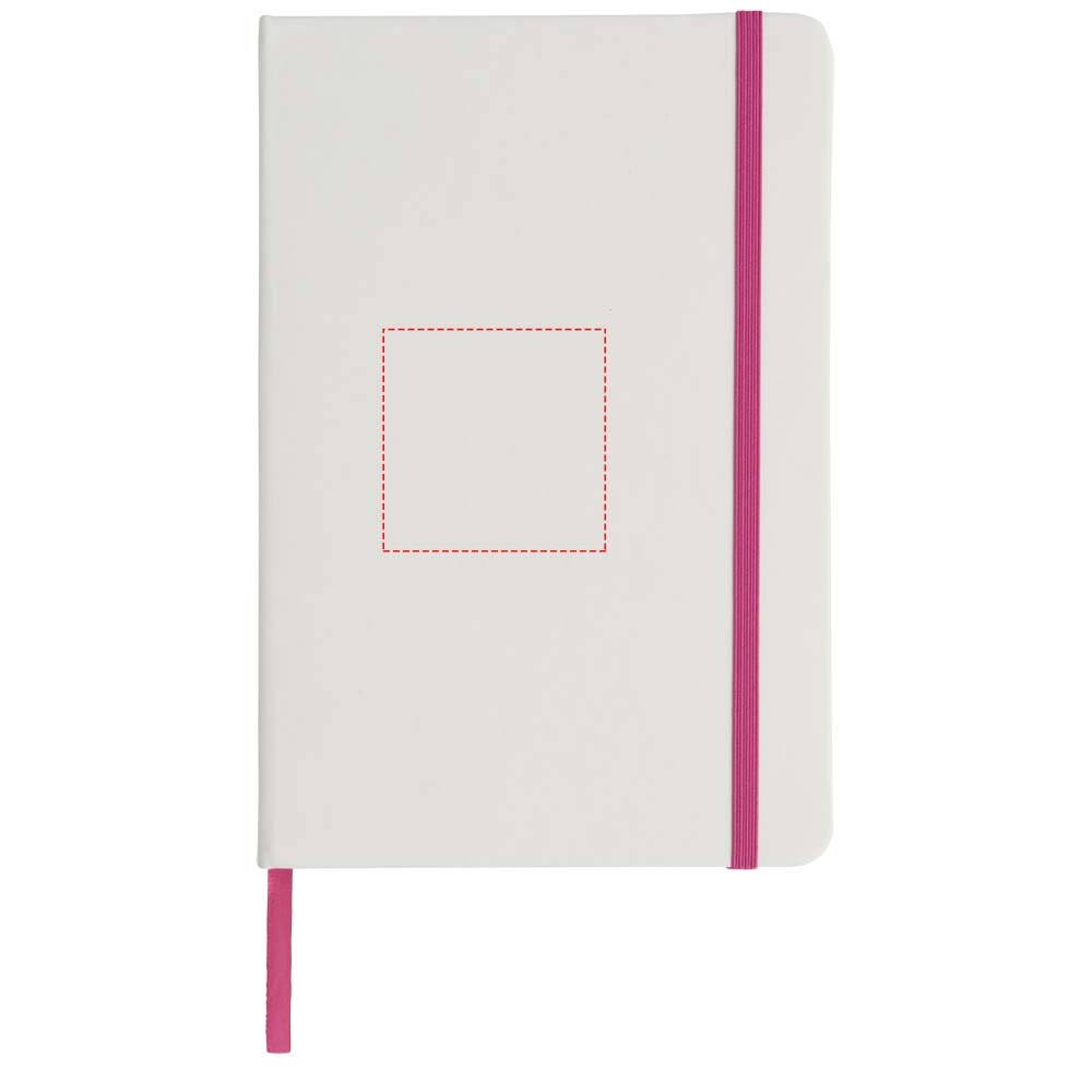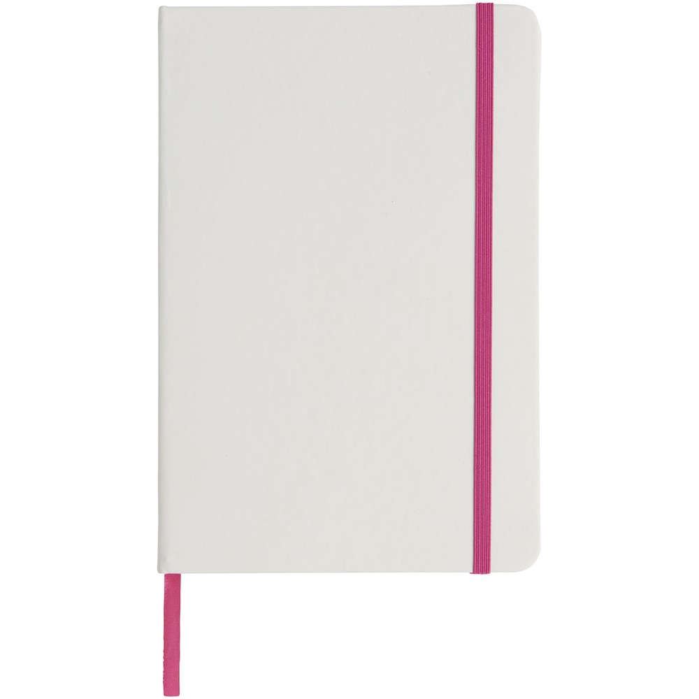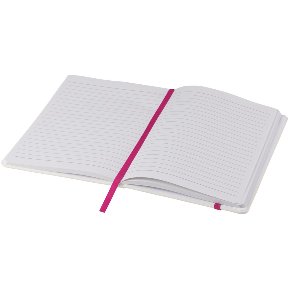 Witte A5 notitieboek met gekleurde elastische sluiting en lint. Inclusief 80 vellen (60 g / m2) gelinieerd papier. Digitaal printen mogelijk op omslag.
