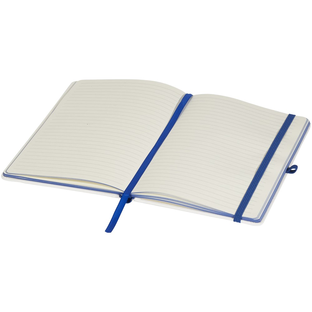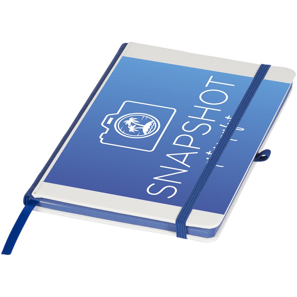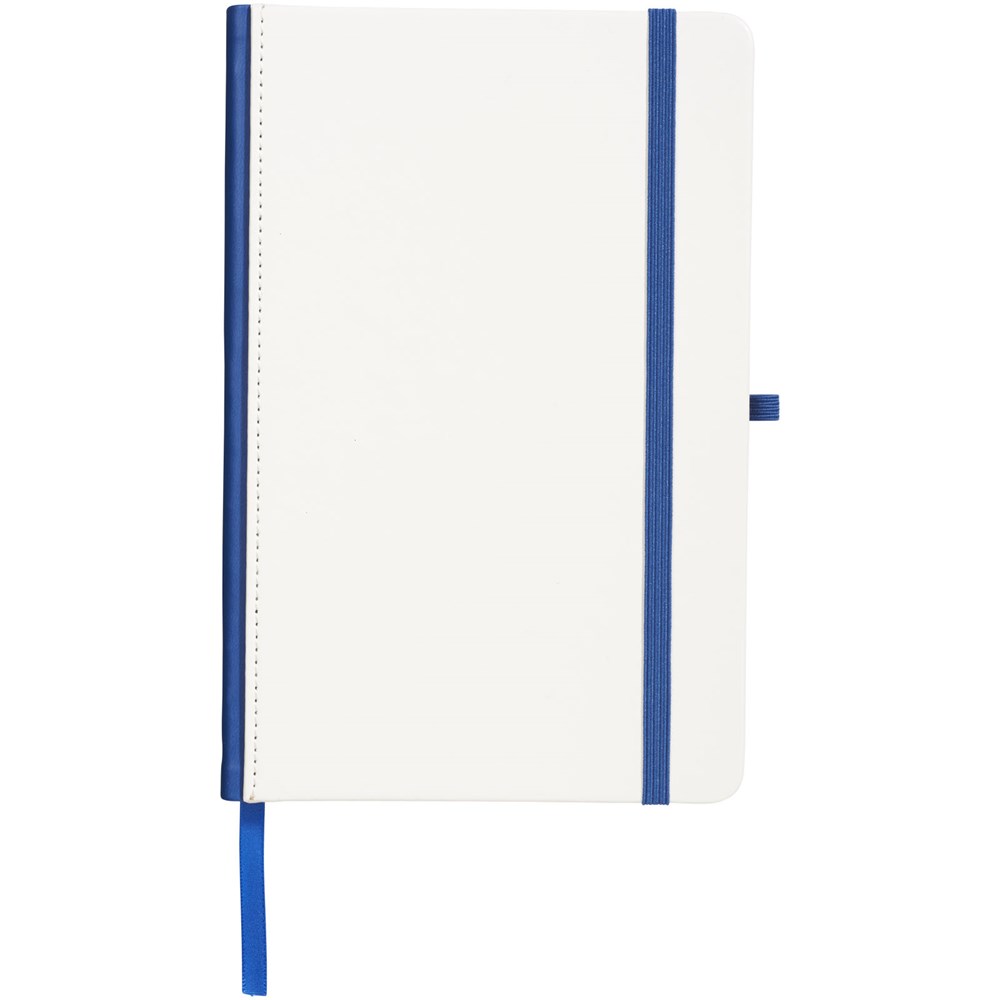 Wit hardcover A5 notitieboek met PU coating en een gekleurde rug. Ideaal voor volledig dekkend digitaal afdrukken. Met elastische sluiting in bijpassende kleur, lint als bladwijzer en elastische penlusje. 80 g/m2, 80 vellen crèmekleurig lijntjespapier.