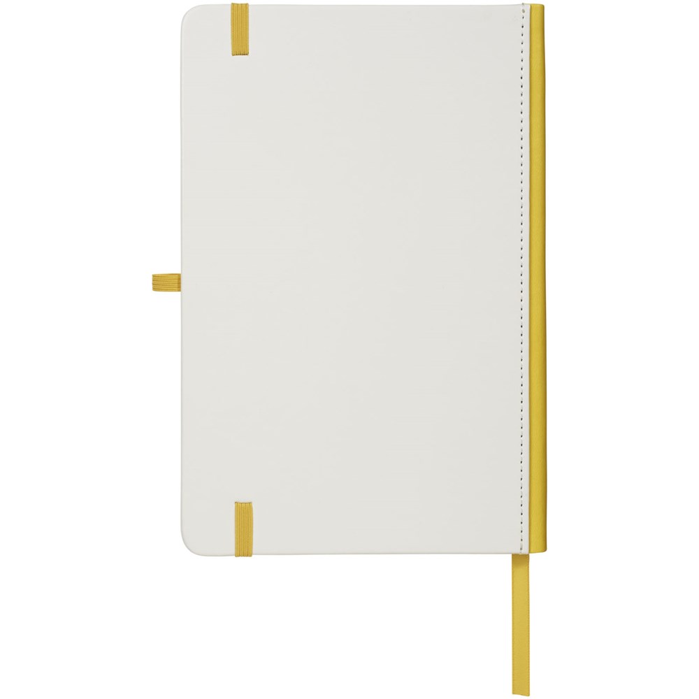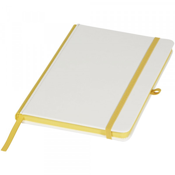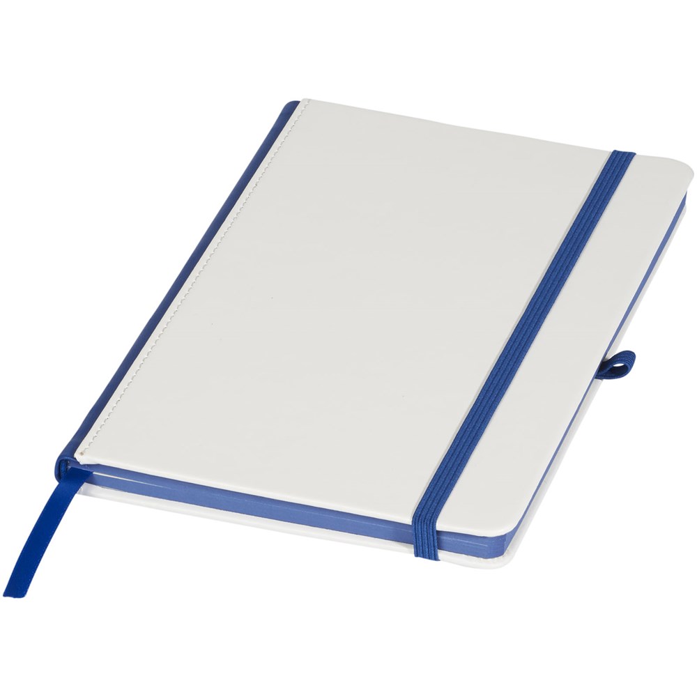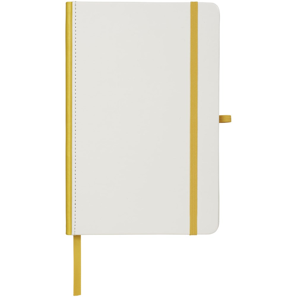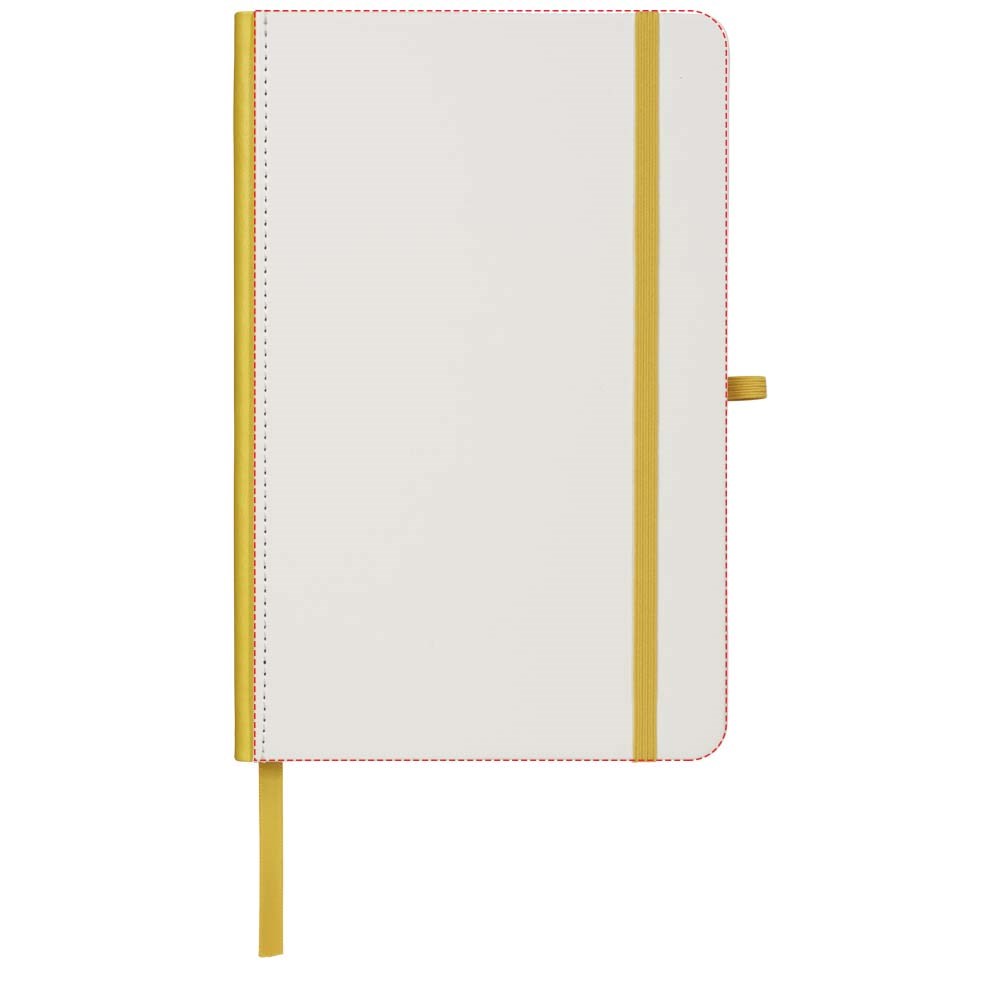 Wit hardcover A5 notitieboek met PU coating en een gekleurde rug. Ideaal voor volledig dekkend digitaal afdrukken. Met elastische sluiting in bijpassende kleur, lint als bladwijzer en elastische penlusje. 80 g/m2, 80 vellen crèmekleurig lijntjespapier.