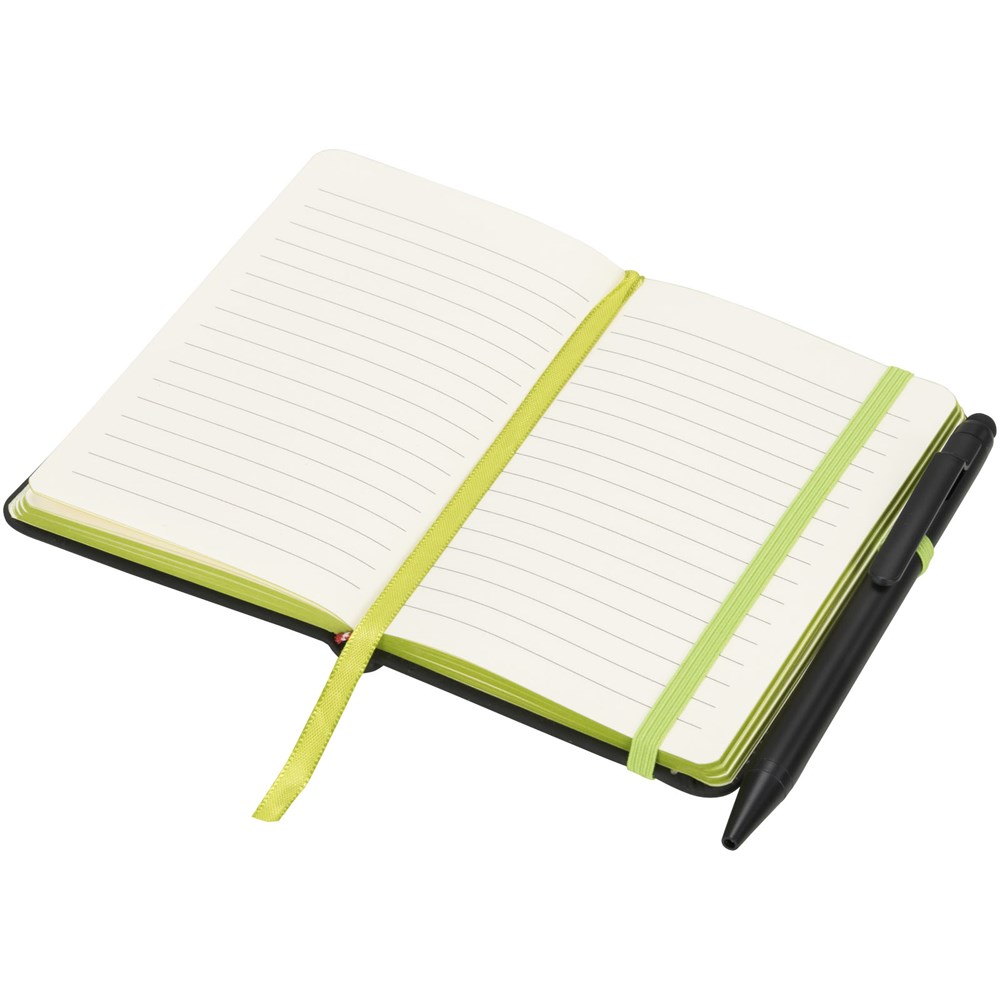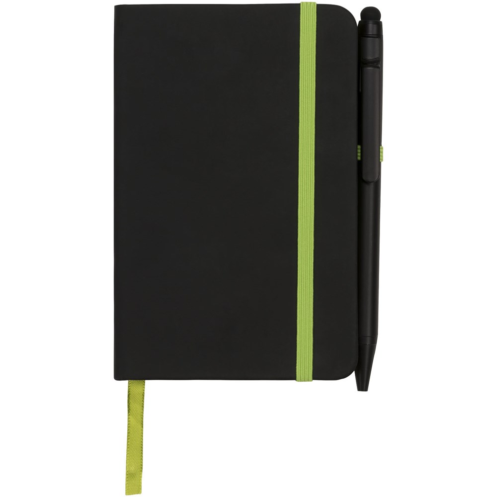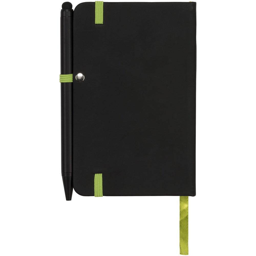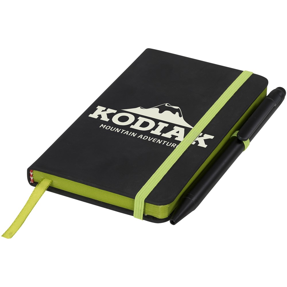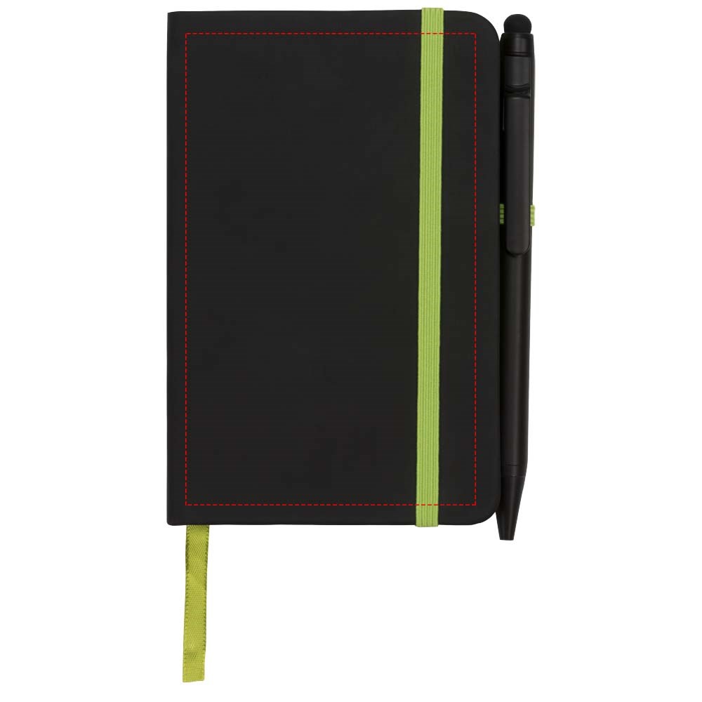 Modern en stijlvol zwart notitieboek met een zachteomslag. Voorzien van gekleurde randen bladwijzer, penlus en sluitband in een bijpassende kleur. Inclusief effen zwarte stylus balpen. Bevat 96 bladen (70g/m2) crèmekleurig gelinieerd papier.