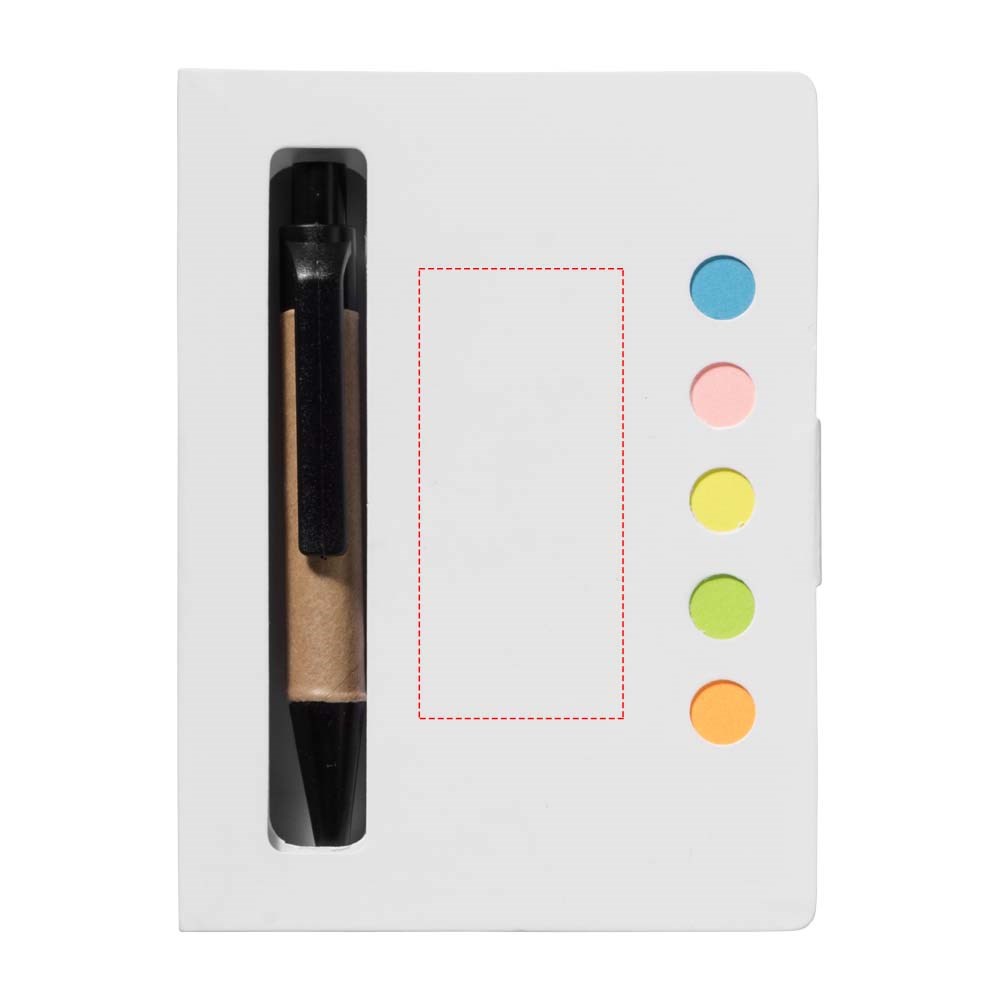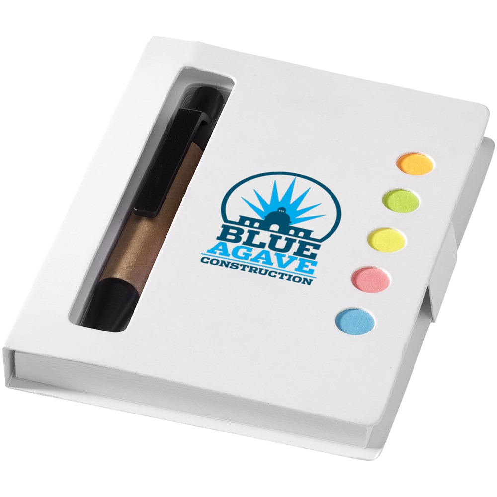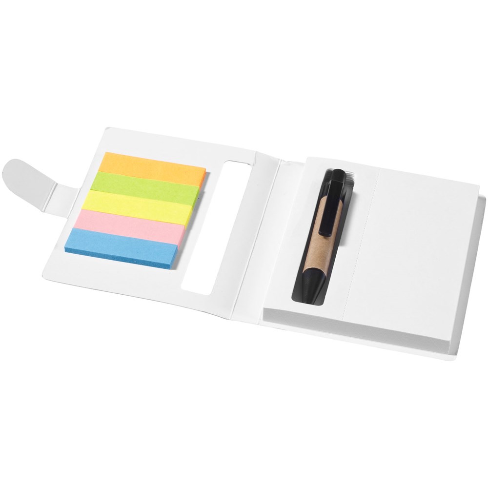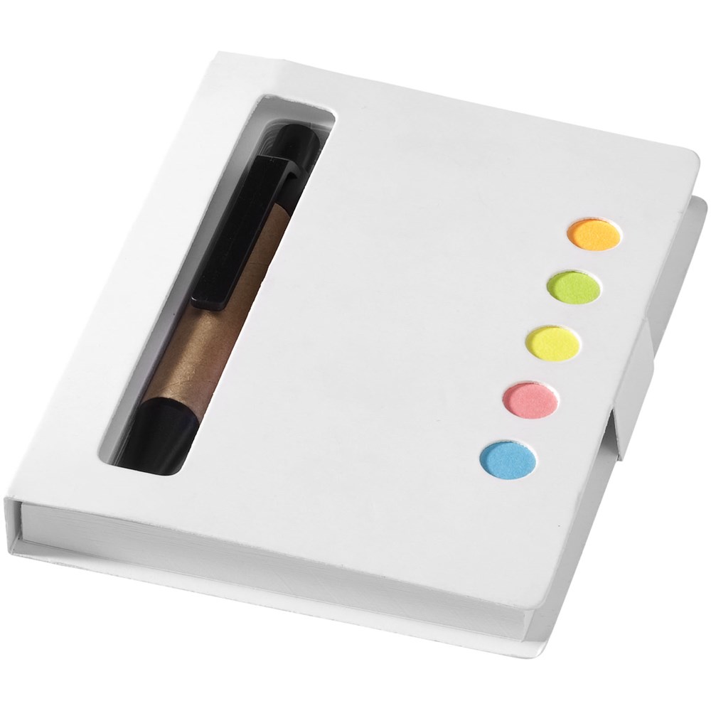 Notitieblok van 80 pagina's met balpen en sticky notes in meerdere kleuren.