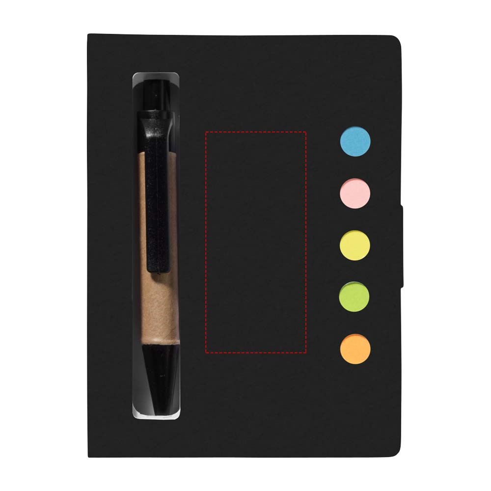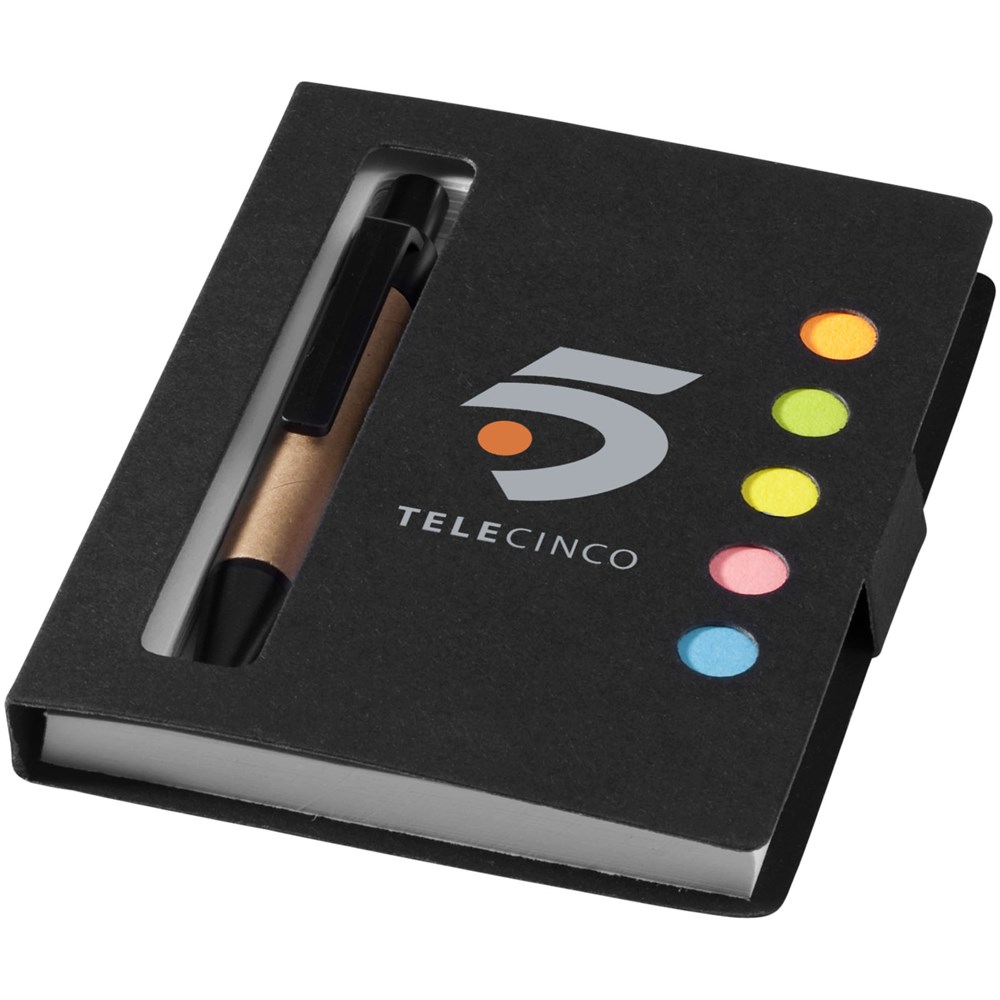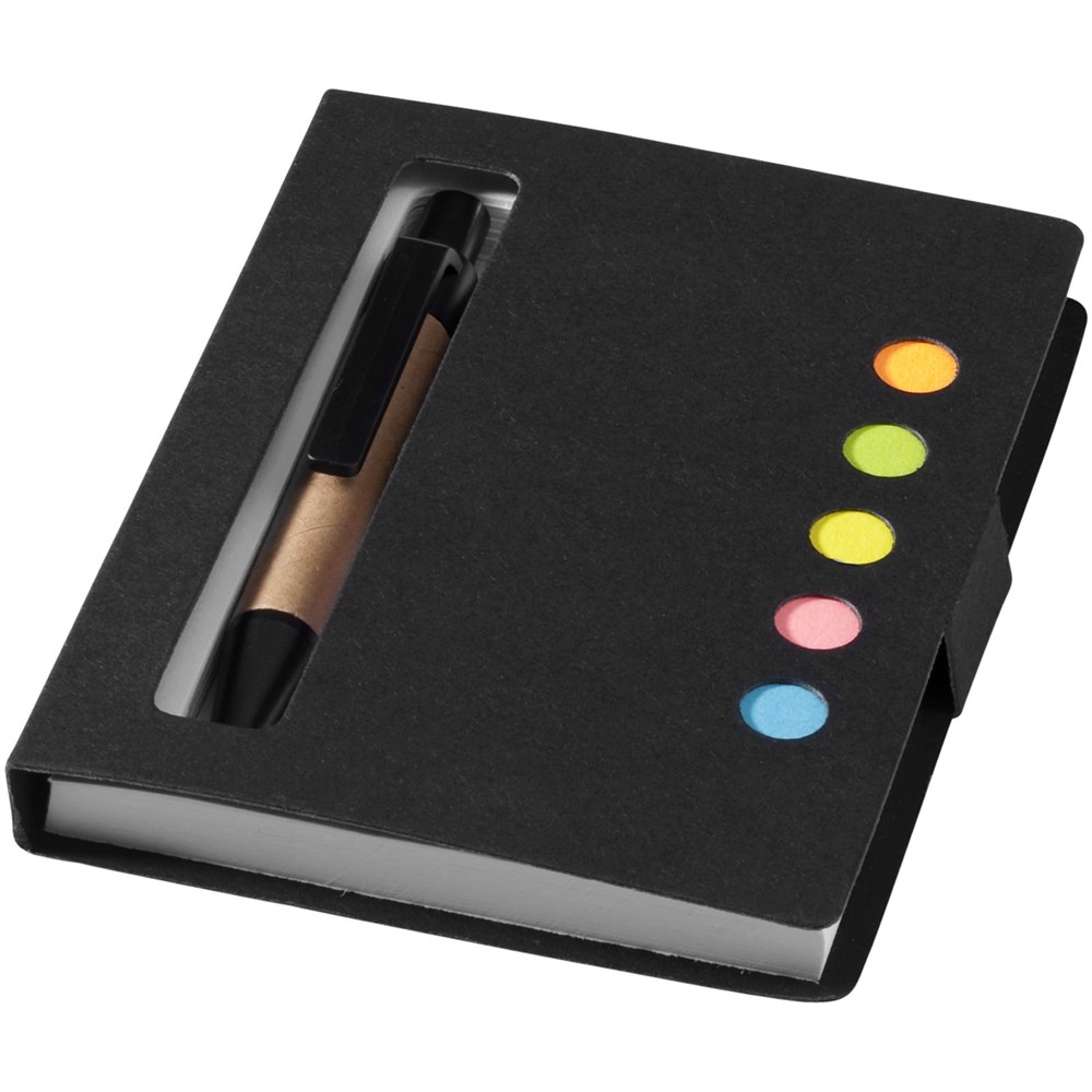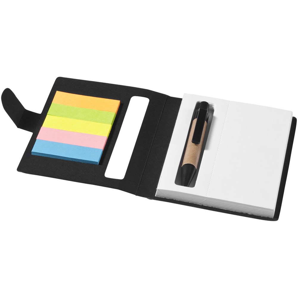 Notitieblok van 80 pagina's met balpen en sticky notes in meerdere kleuren.