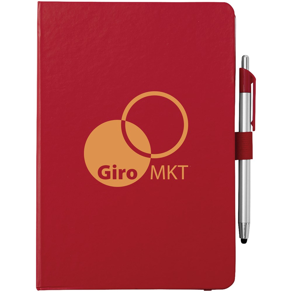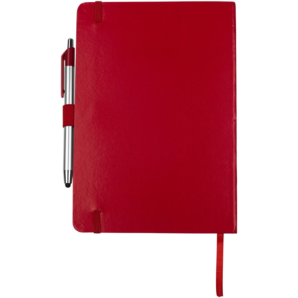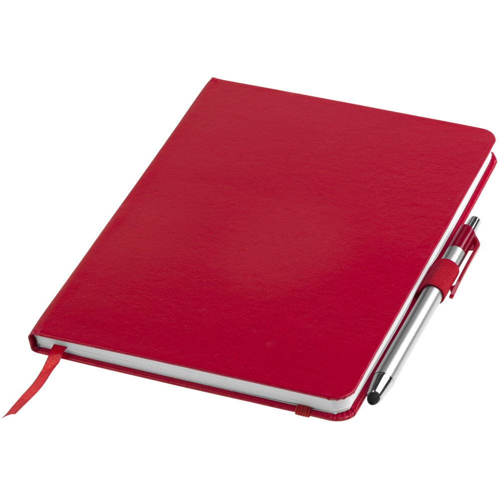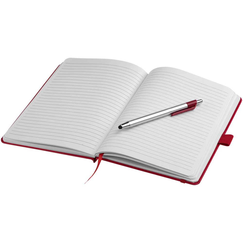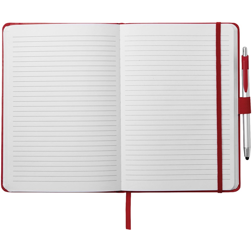 Ingebonden notitieboek met elastieksluiting en paginalint in dezelfde kleur. Met kunststof stylus balpen, pen apart verpakt en 80 pagina's van 70 gram gelinieerd papier.