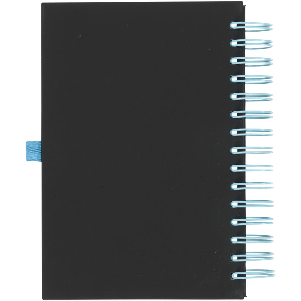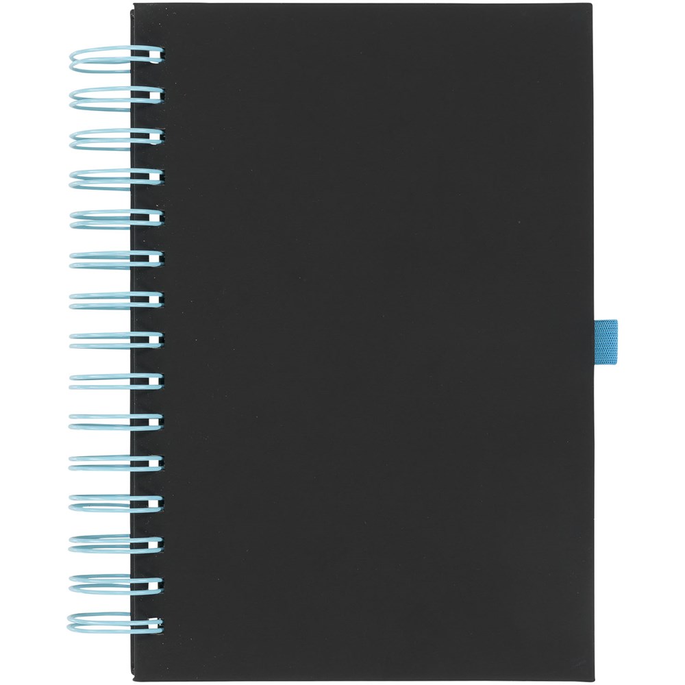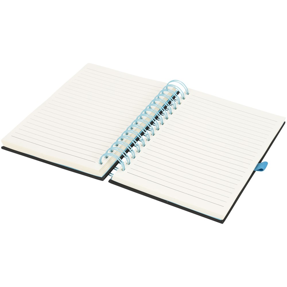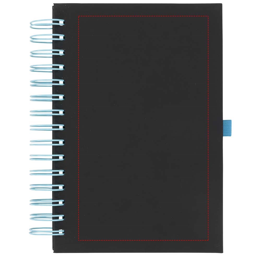 Een nieuwe toevoeging aan ons populaire assortiment notebooks. Deze veelzijdige nieuwe notebook heeft een gladde zwarte PU-cover, met felgekleurde dikke ringband en bijpassende pennenlus. Inclusief 160 vel (70 g / m2) crèmekleurig papier.