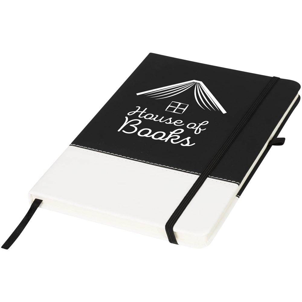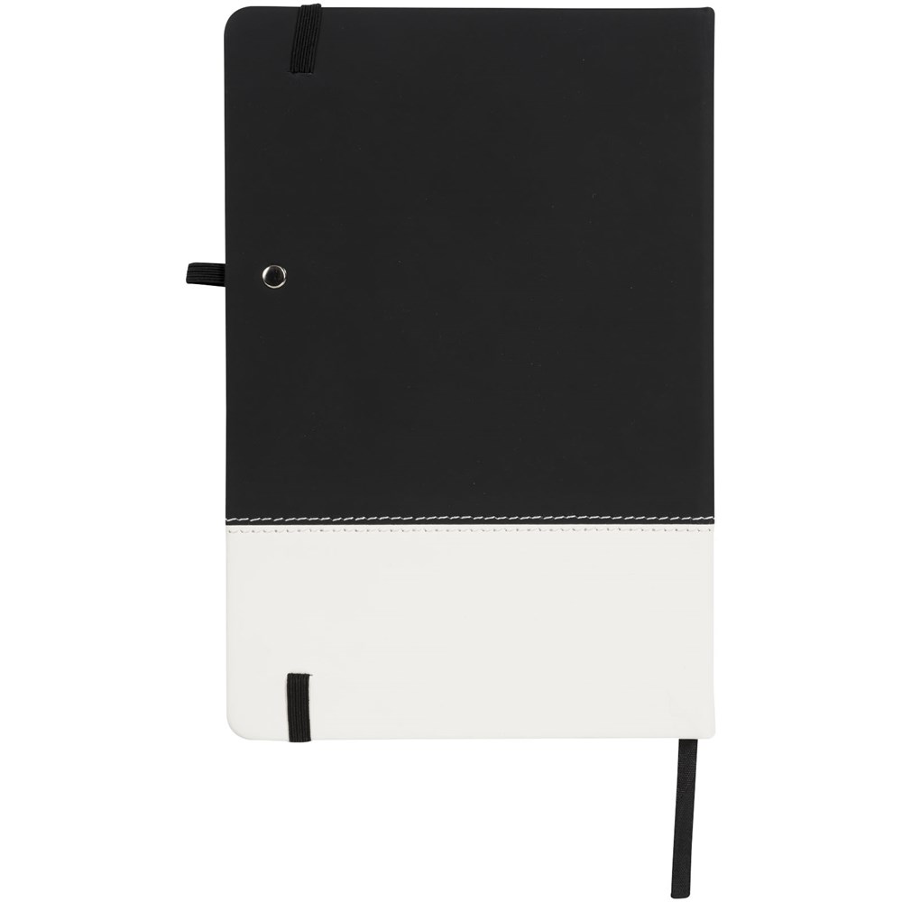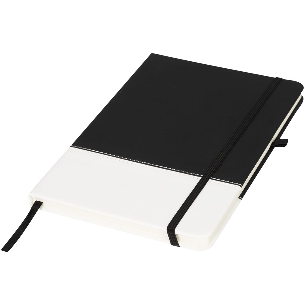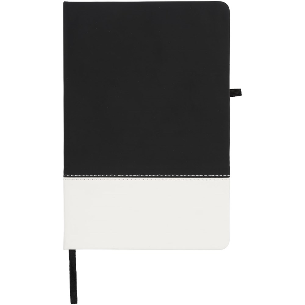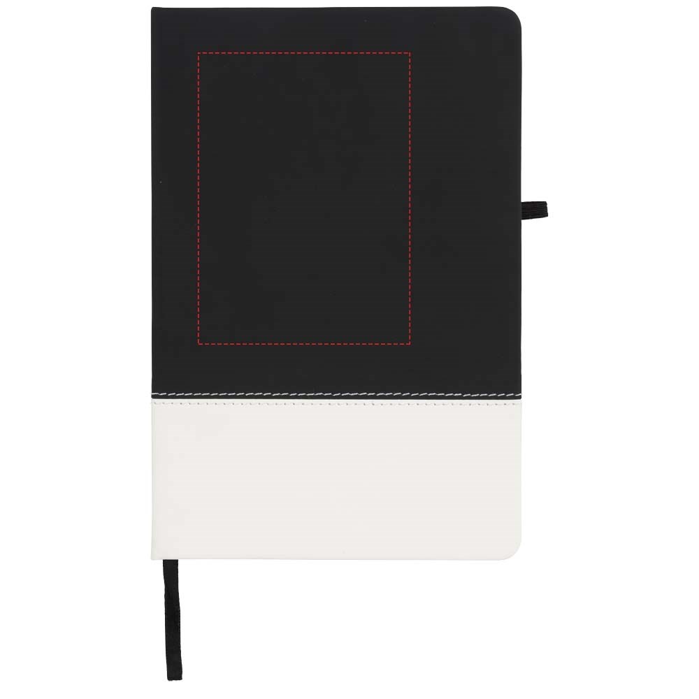A5 notitieblok met omslag met kleurenblokken in twee tinten. Omvat 80 bladen (70g/m2) gelinieerd papier.