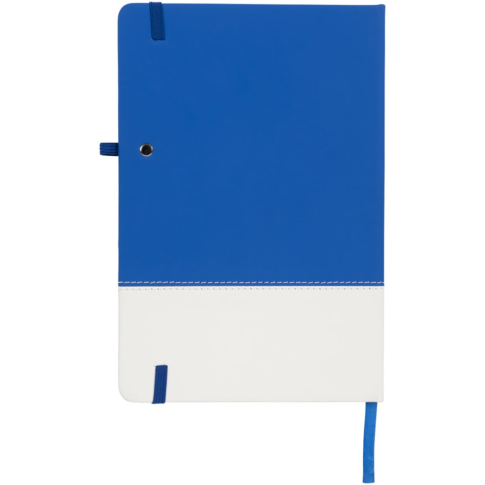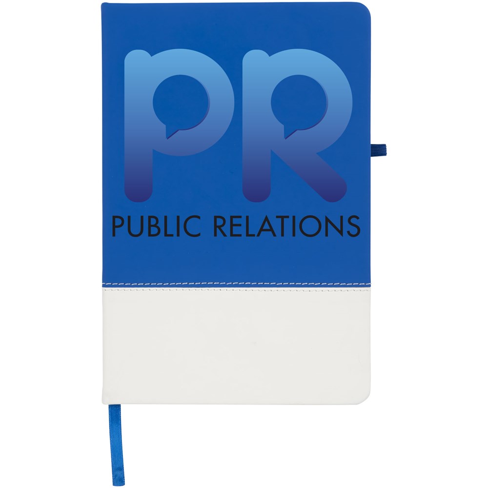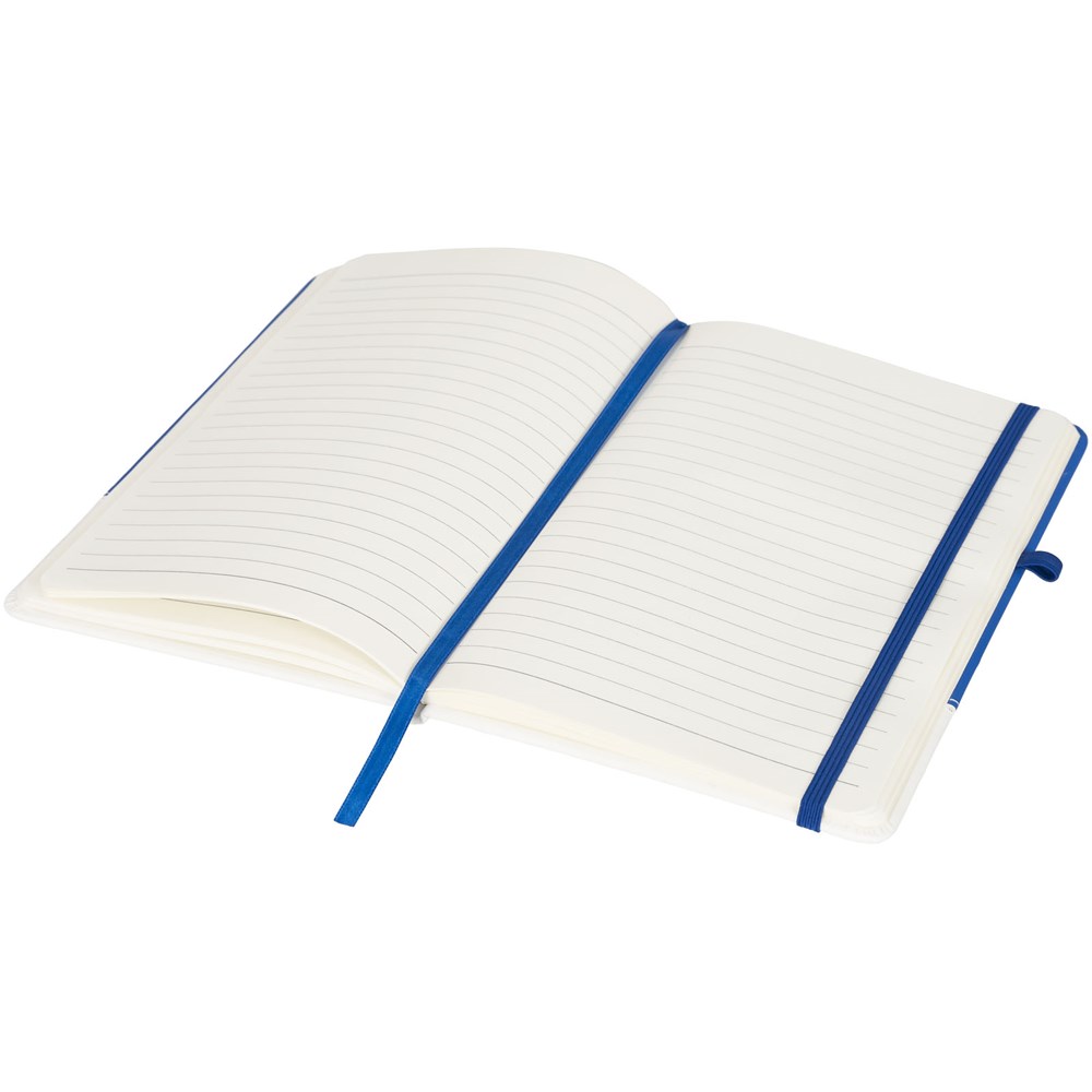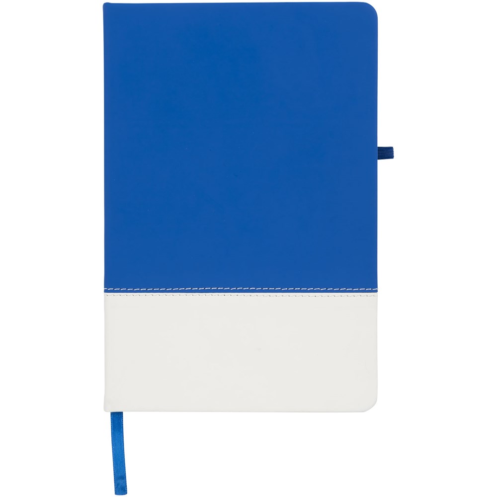 A5 notitieblok met omslag met kleurenblokken in twee tinten. Omvat 80 bladen (70g/m2) gelinieerd papier.