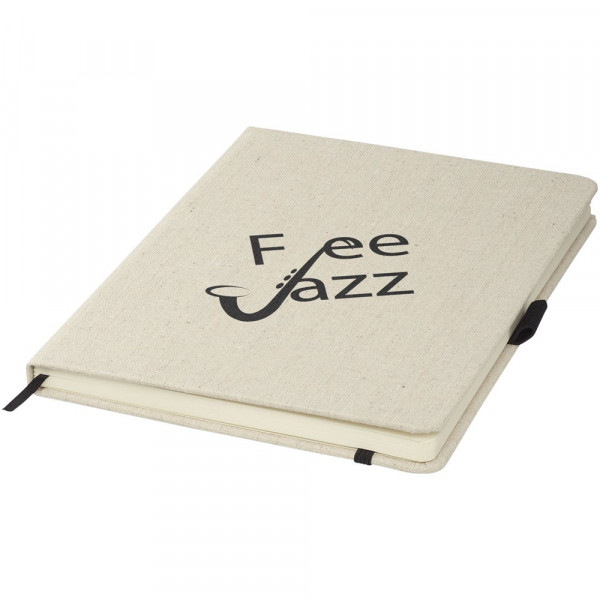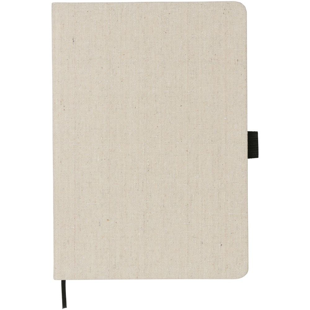 A5 formaat canvas notitieboekje met gekleurde elastieksluiting en paginalint. Een elastische penlus en 80 pagina's van 70 gram met gelinieerd papier.
