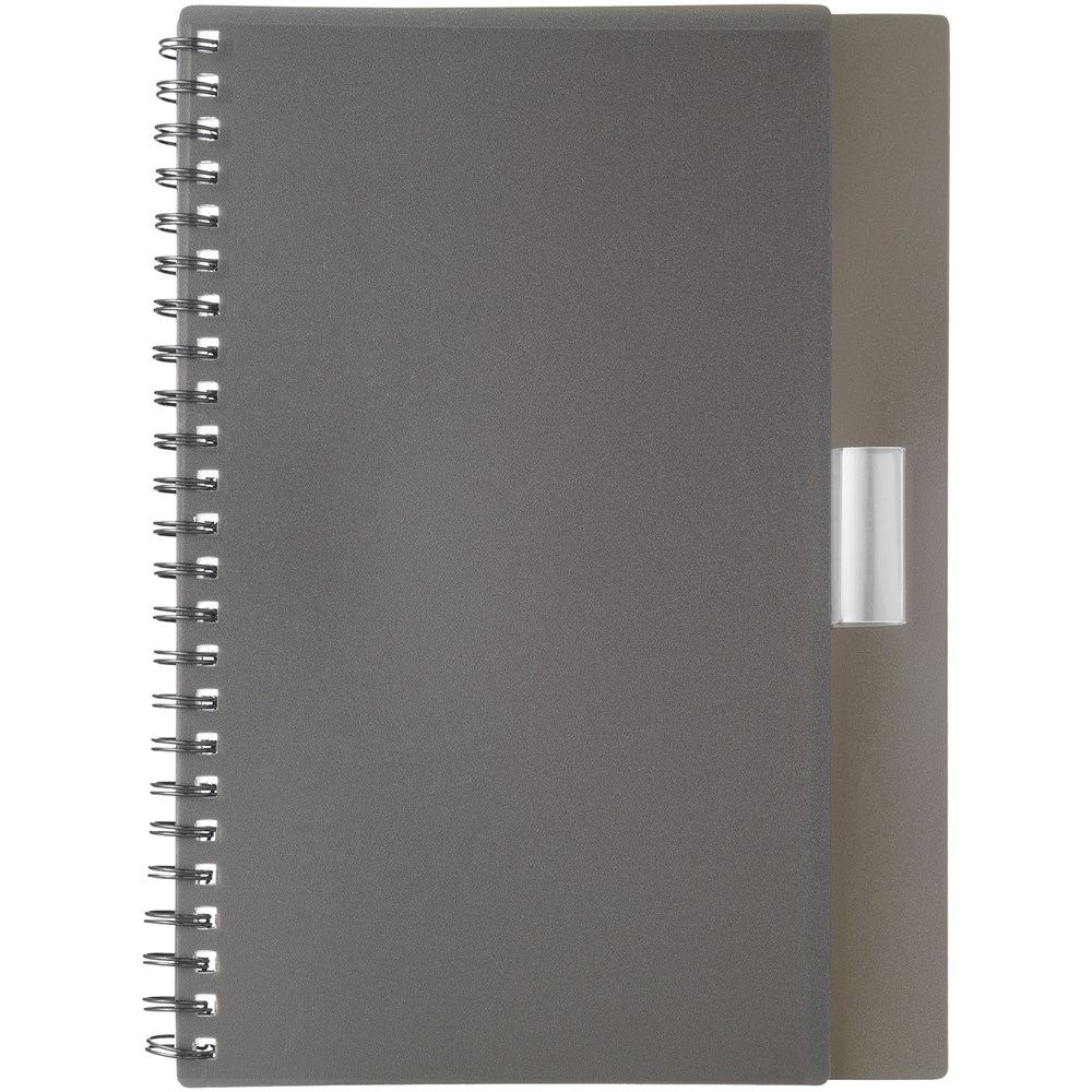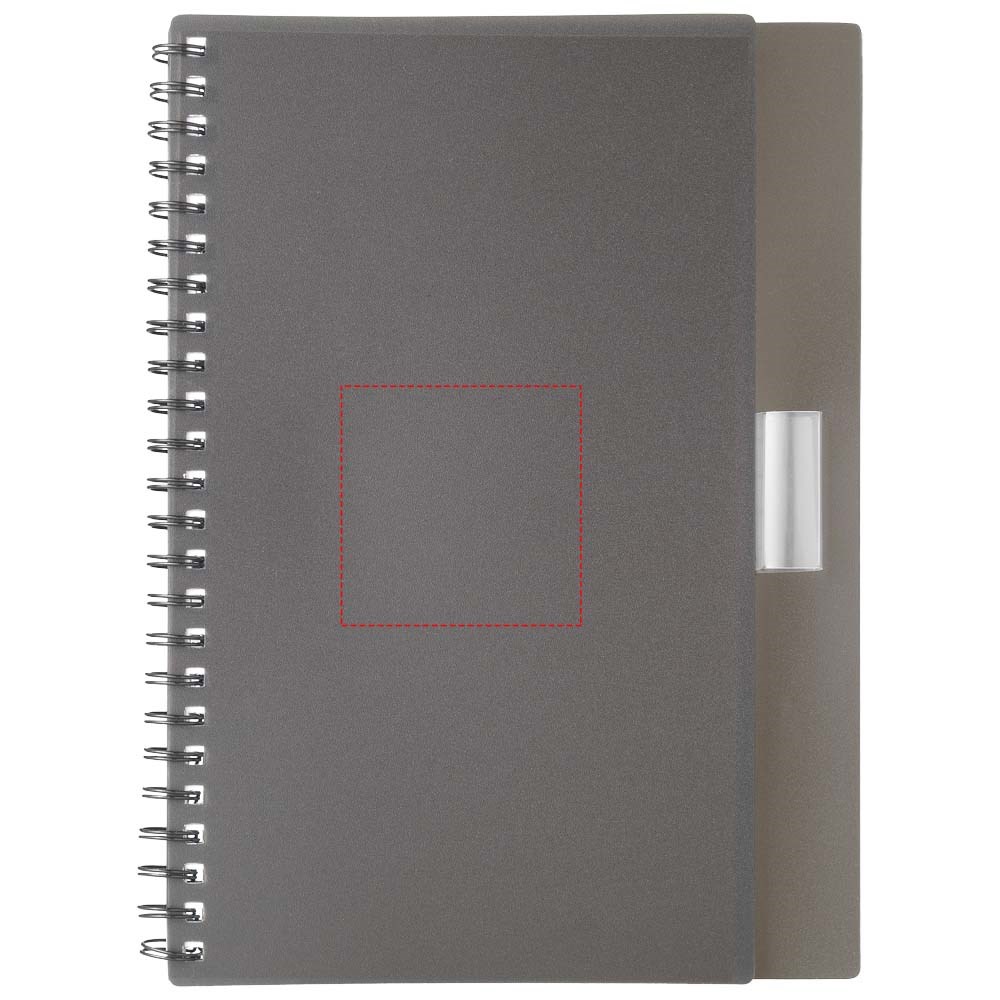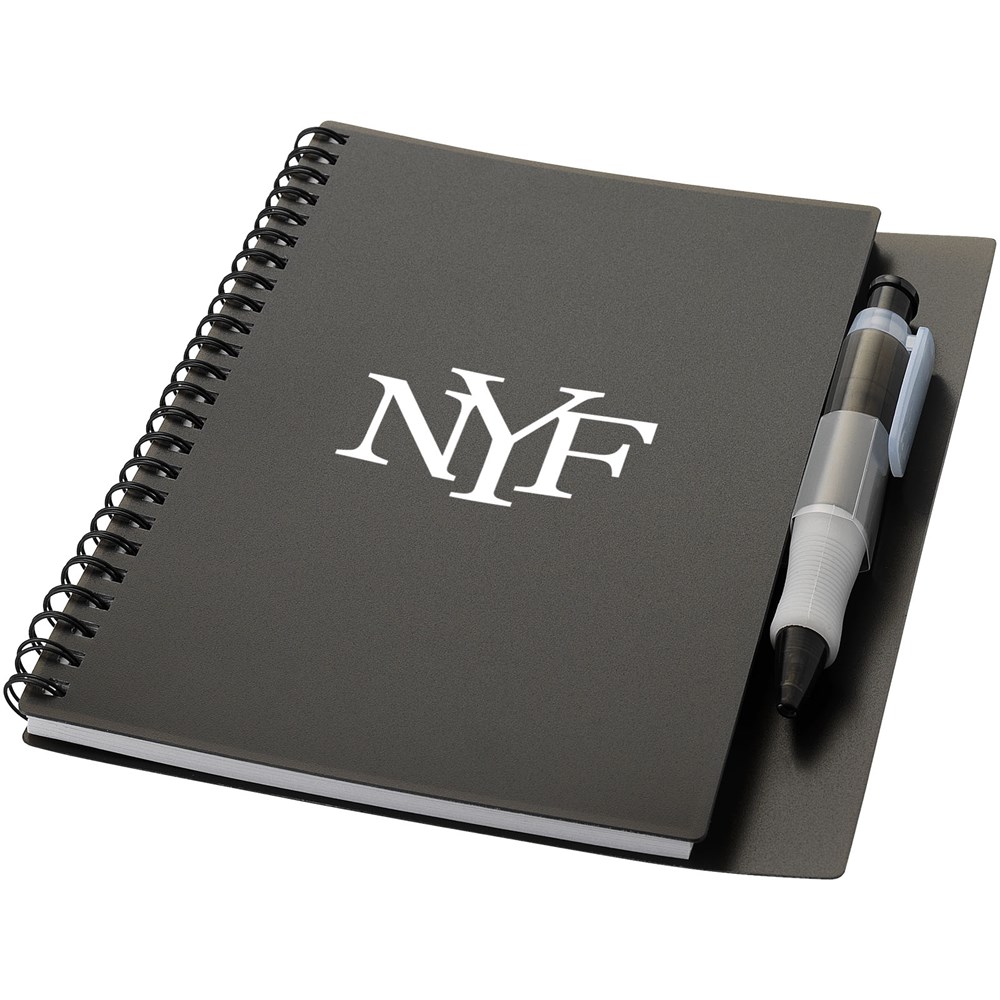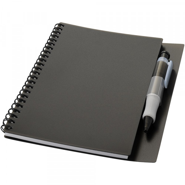 A5 formaat notitieboek met 80 pagina's gelinieerd papier, met balpen in bijpassende kleur en soft touch greep.