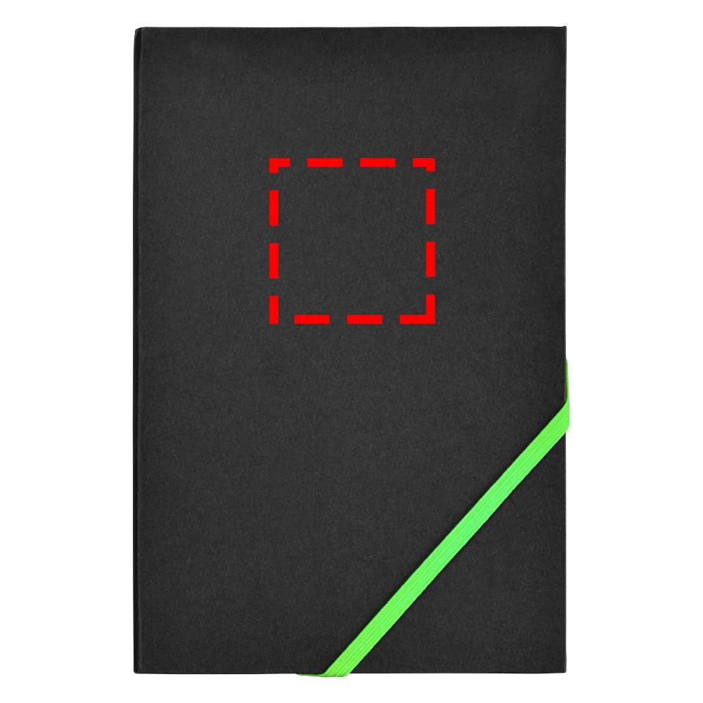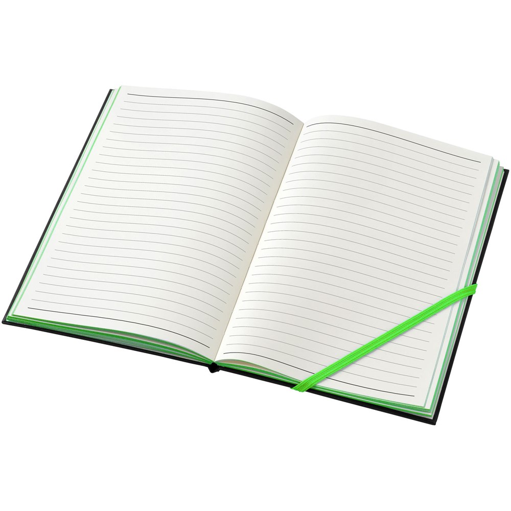 A5 formaat notitieboek met 80 pagina's van 70 gram gelinieerd papier met diagonale elastieksluiting en rand in spetterende neonkleuren.