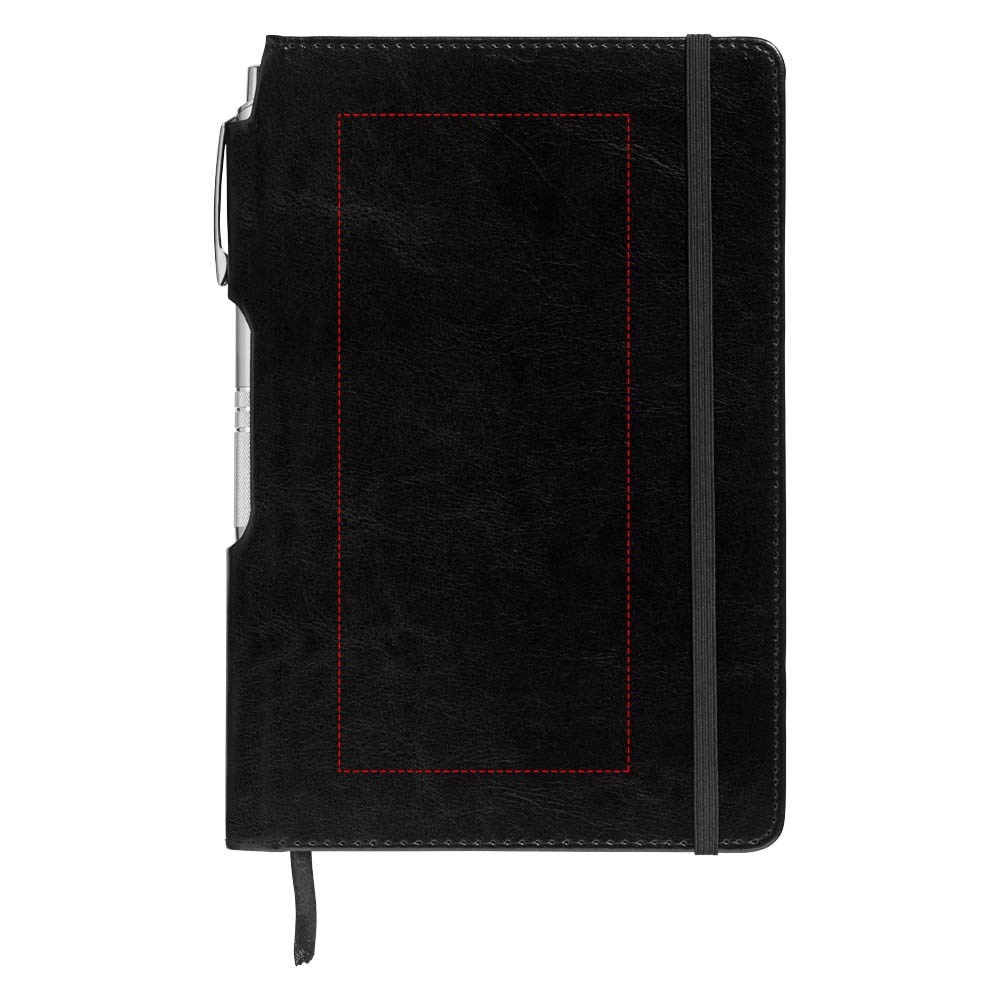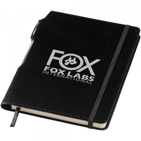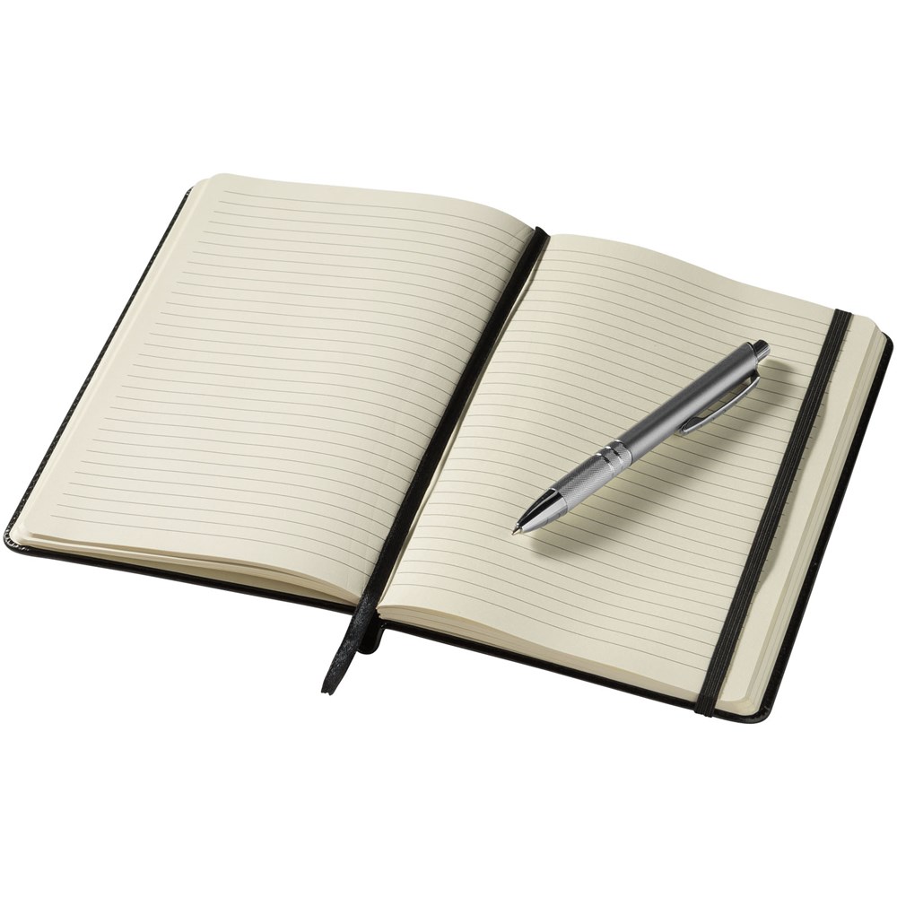 A5 formaat notitieboek met 80 pagina's van 70 gram gelinieerd papier, paginalint en elastieksluiting in bijpassende kleur en zilverkleurige balpen in de binding.
