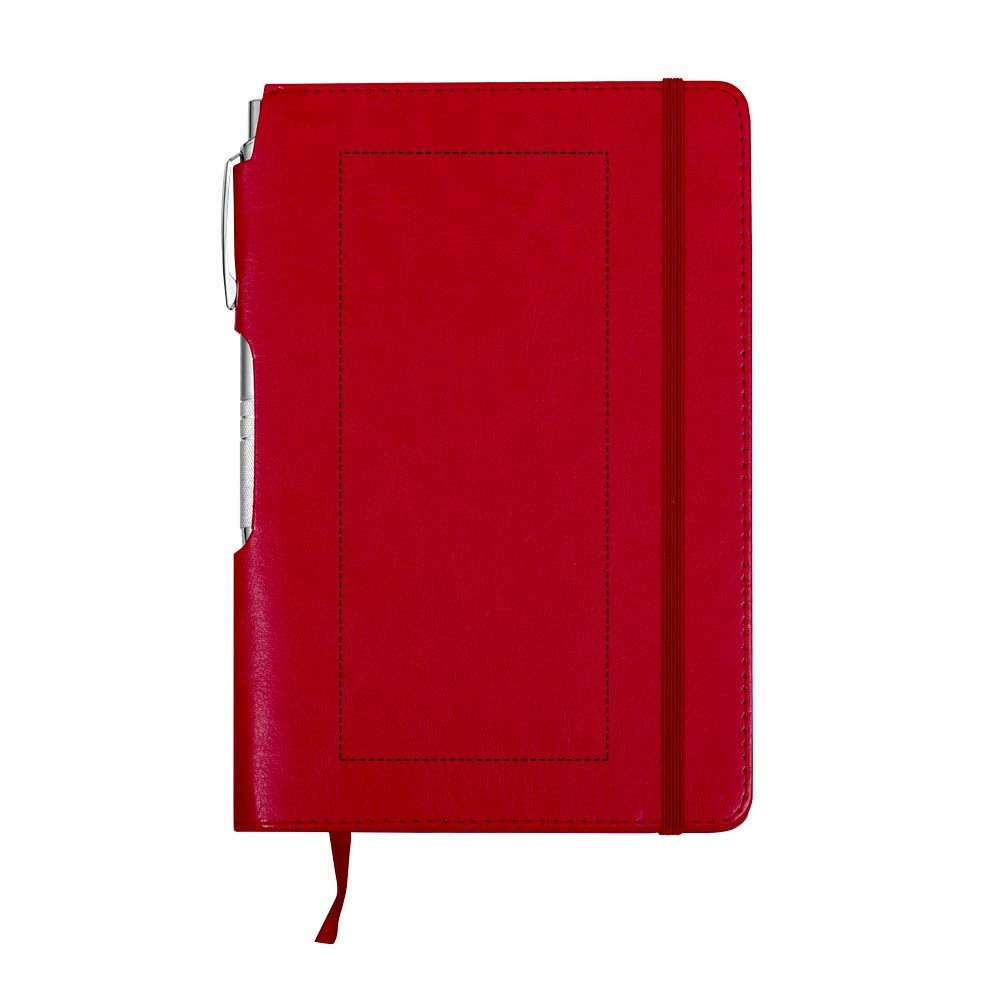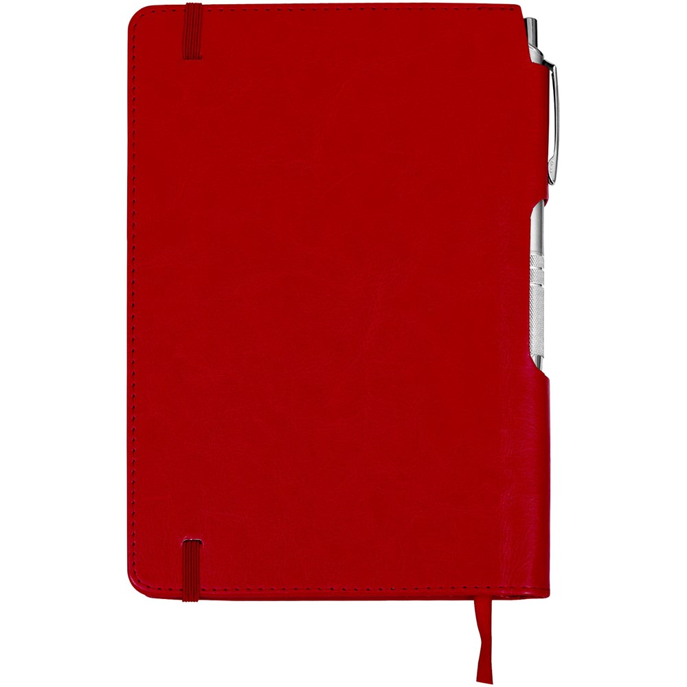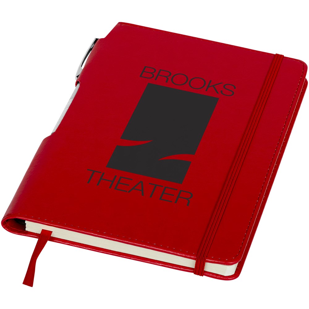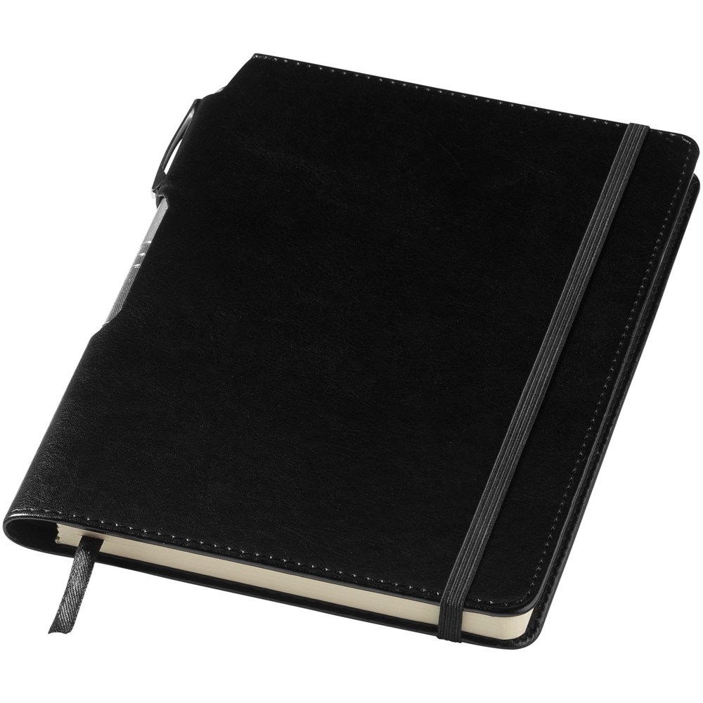 A5 formaat notitieboek met 80 pagina's van 70 gram gelinieerd papier, paginalint en elastieksluiting in bijpassende kleur en zilverkleurige balpen in de binding.