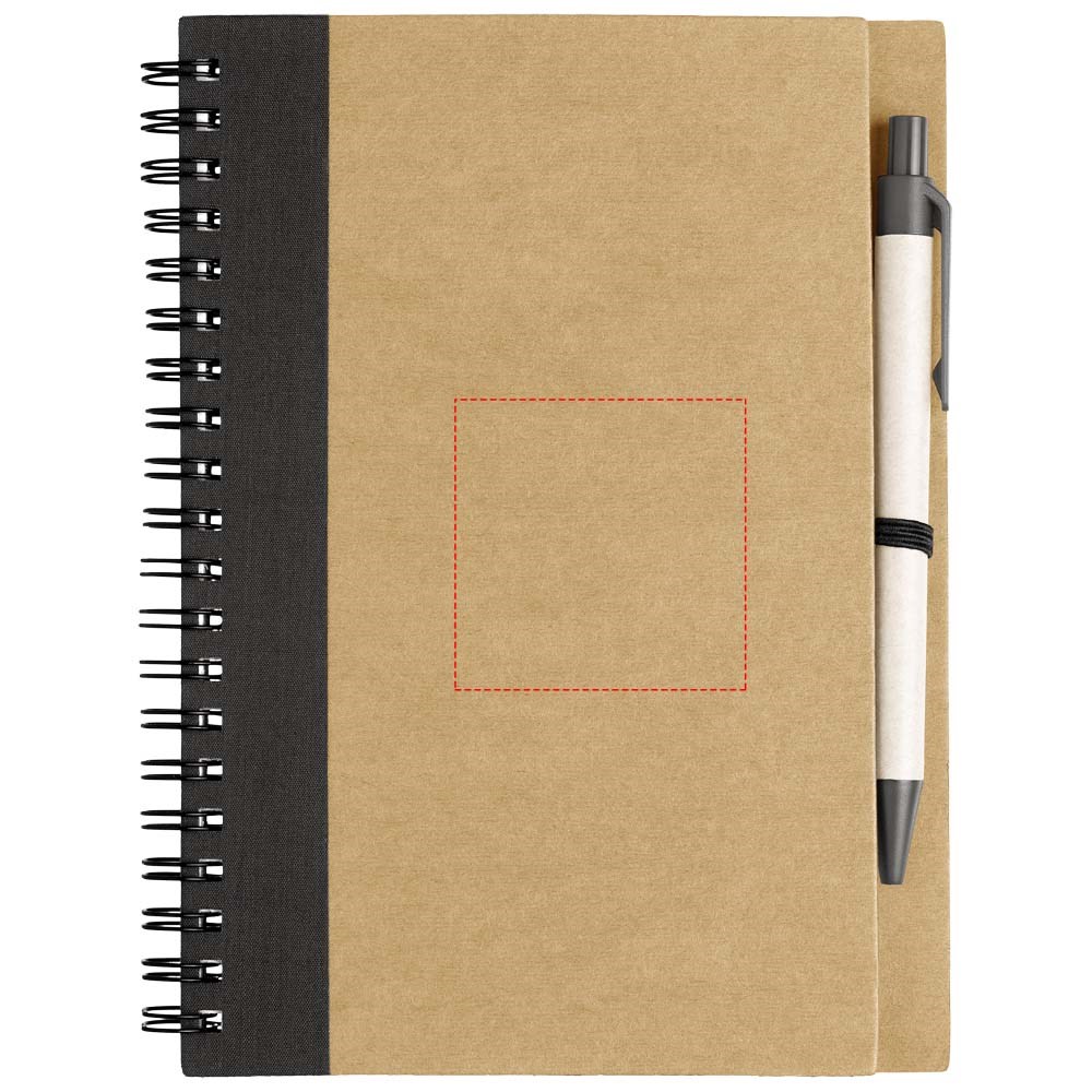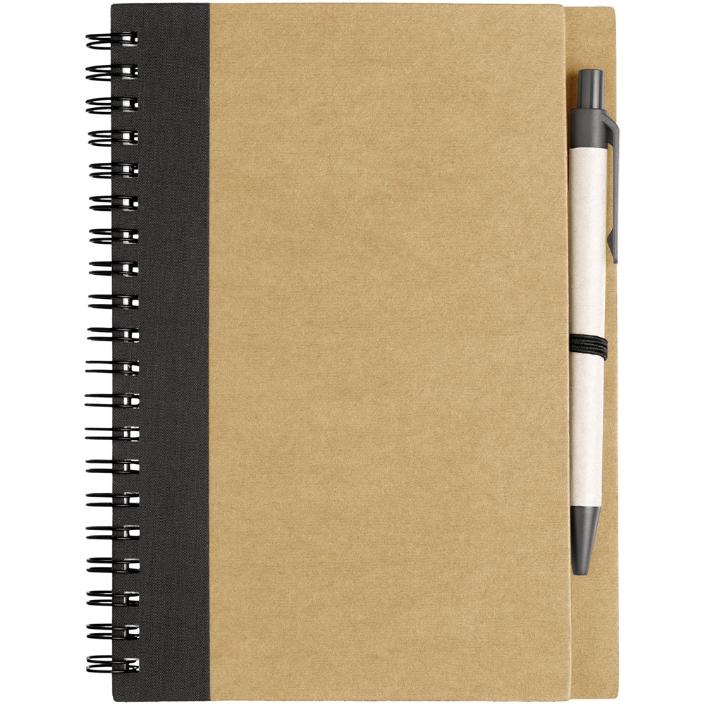 Notitieboek met omslag van gerecycled papier met 60 vellen gerecycled lijntjespapier en bijpassende pen. Notitieboek en pen samen verpakt.