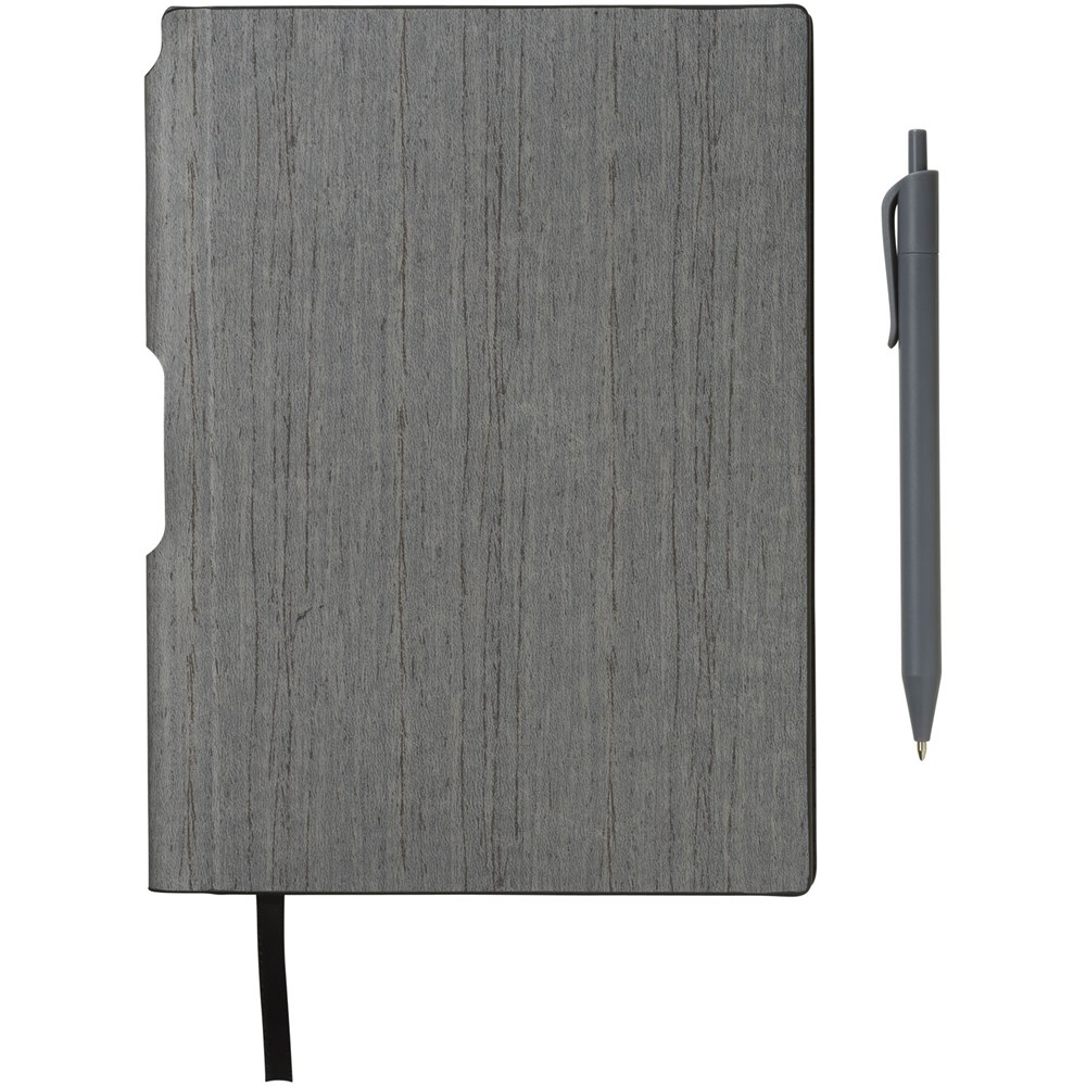 Ingebonden A5 formaat notitieboek met 80 pagina's van 70 gram gelinieerd papier. Bijpassende kunststof balpen in de binding.