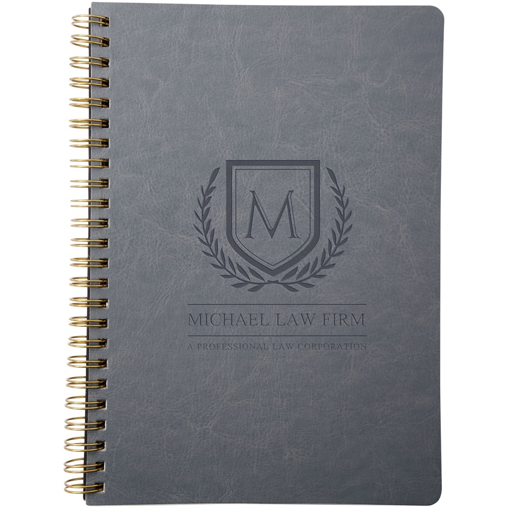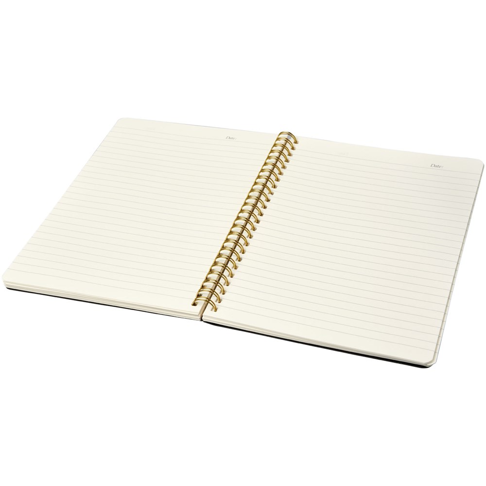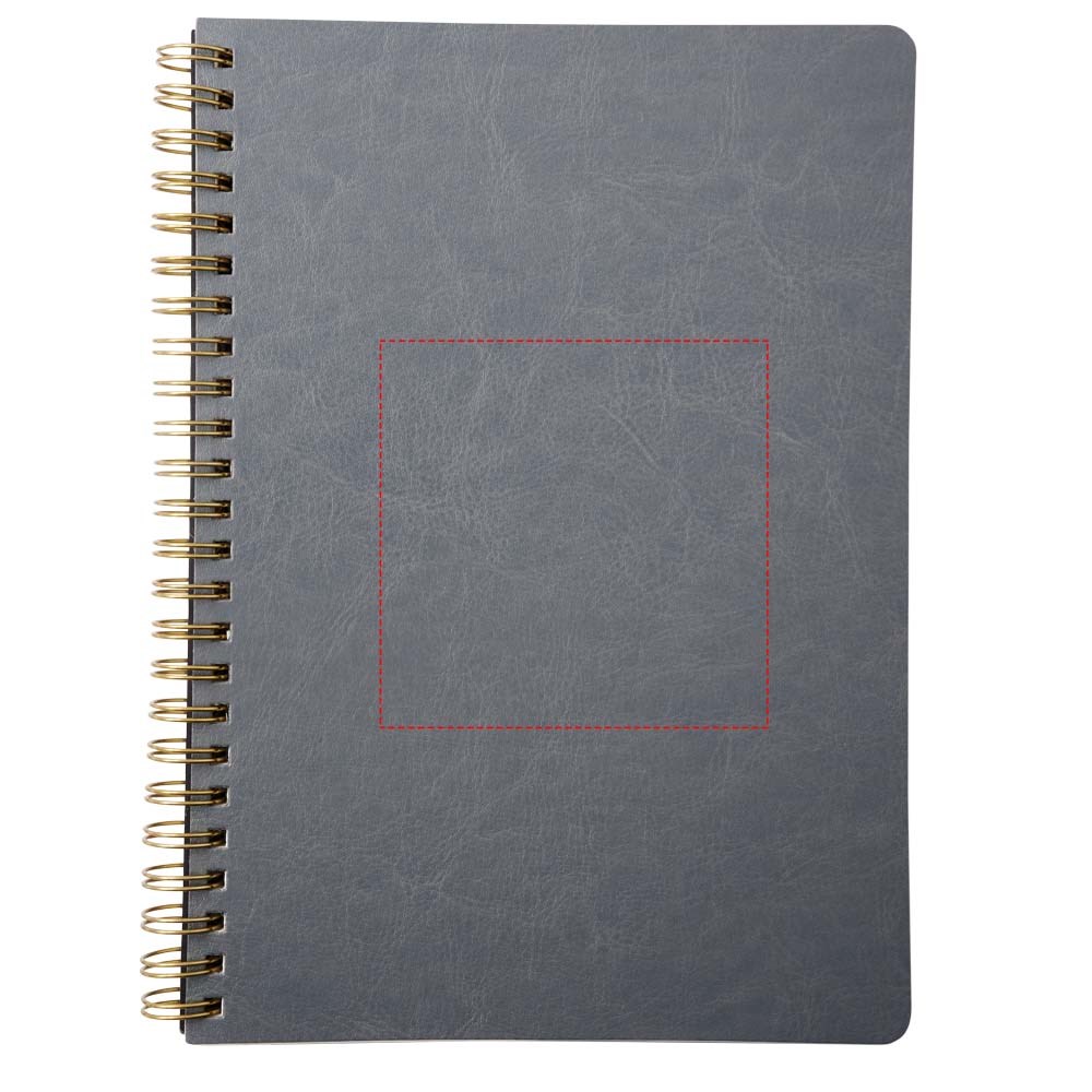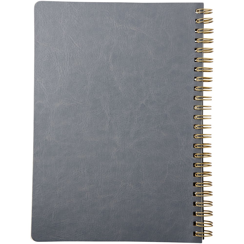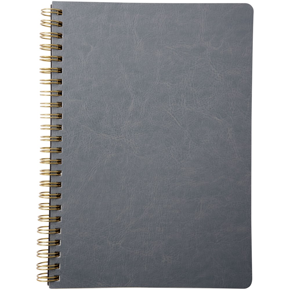 Lederlook A5 schrift met spiraal in runderhuid thermo PU en afgeronde hoeken. De kaft van het notitieboekje (15 cm x 21 cm) heeft 96 vellen gelinieerd crèmepapier in 70 g/m2.