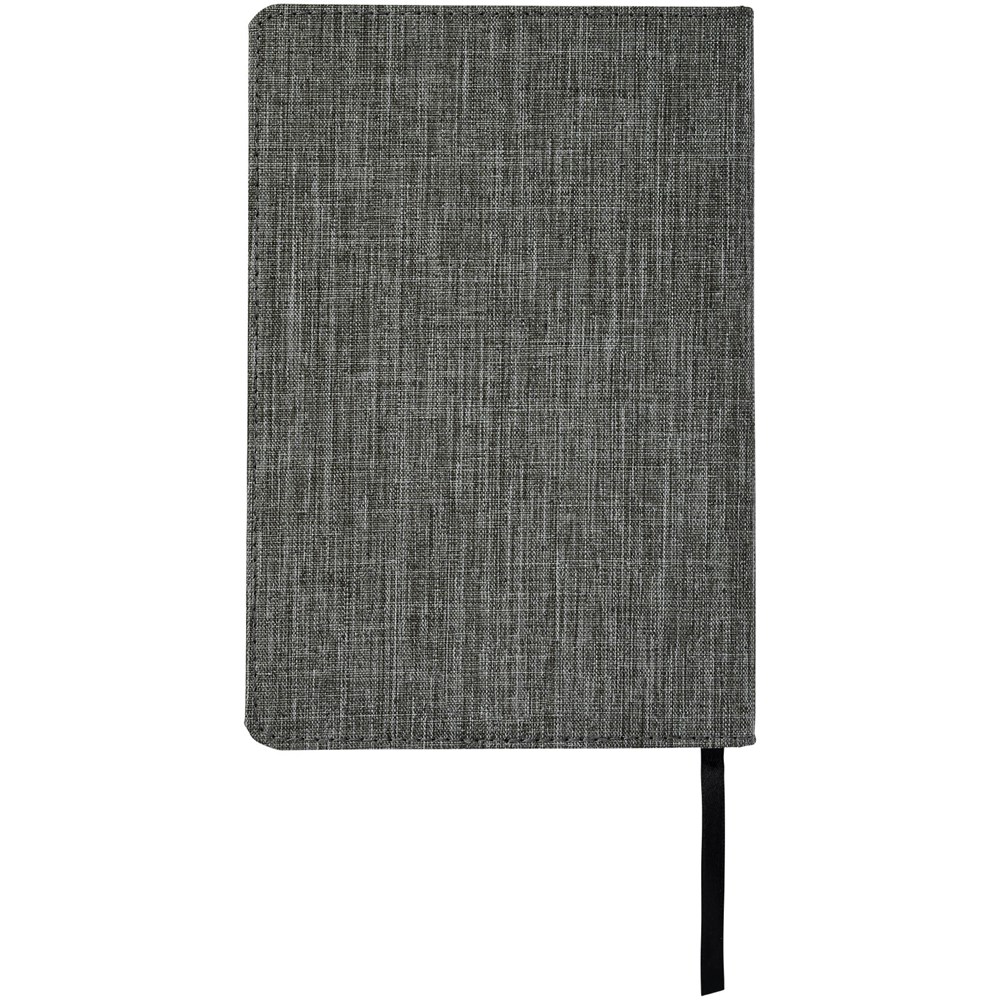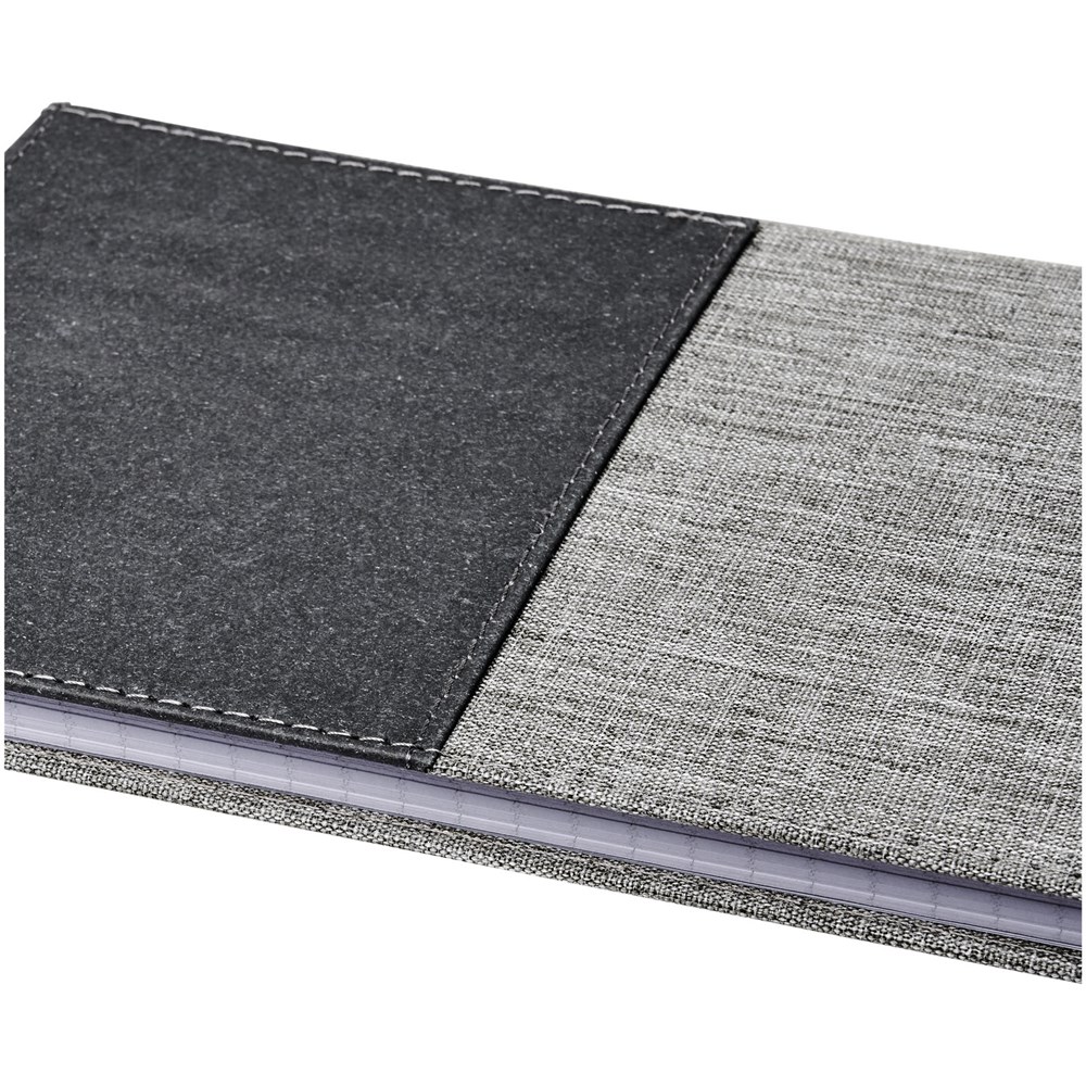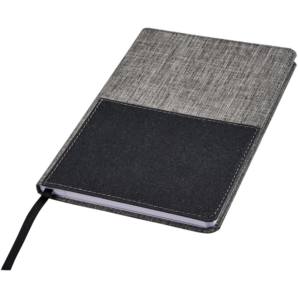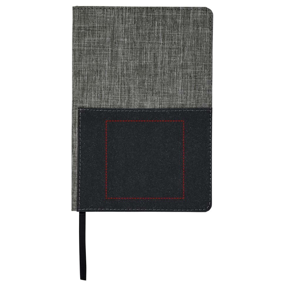 A5-formaat notitieboekje met grijze, heathered omslag gemaakt van post-consument kunststof (70%), karton van gerecycled papier (100% gerecycled) en pocket van 100% pre-consument lederen restjes. In de pocket kunnen een smartphone, balpen en andere kleine voorwerpen worden opgeborgen. Het notitieboekje is voorzien van 80 vellen, 80 gsm gelinieerd crèmekleurig papier en is verpakt in een naturelkleurige sleeve.