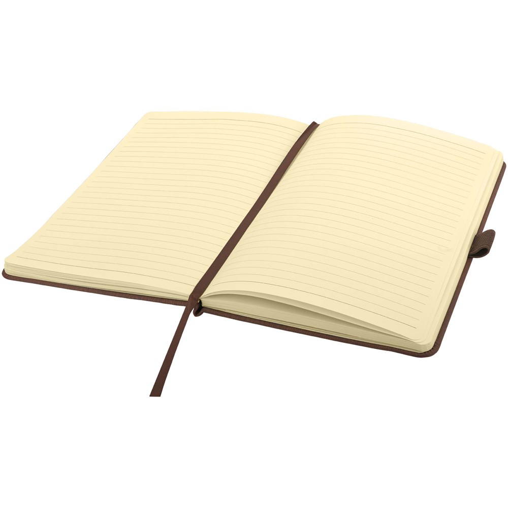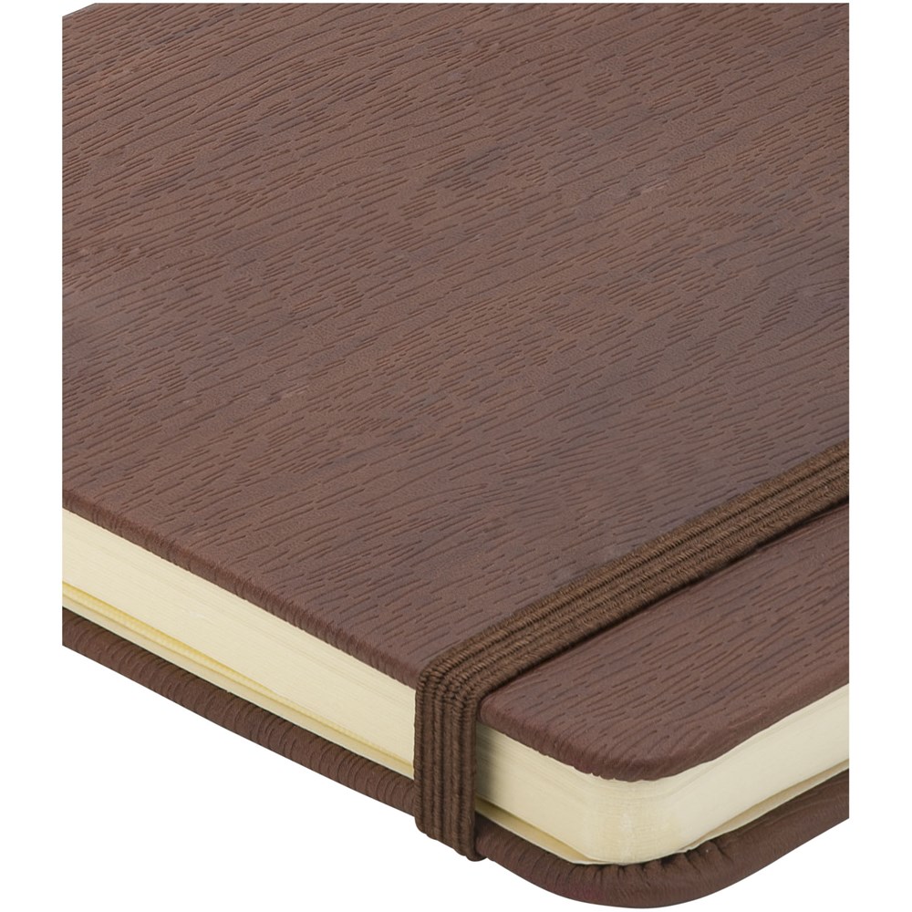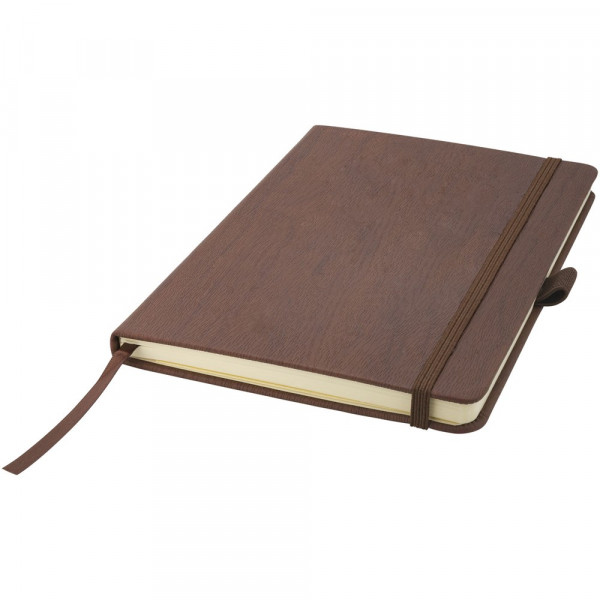 Mooie hout-look notebook voor debossing van een logo of slogan. Elastieksluiting in de kleur van het notitieboek, pen lus en lint markering. Tevens aan de acherijzde binnenkant een pouch om kleine notities in te bewaren. 80 pagina's van 80 gram gelineerd papier. Geleverd in een zwarte geschenkverpakking.