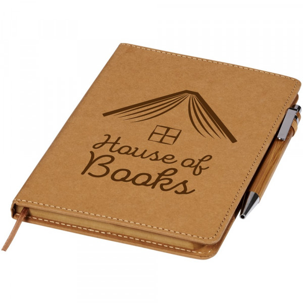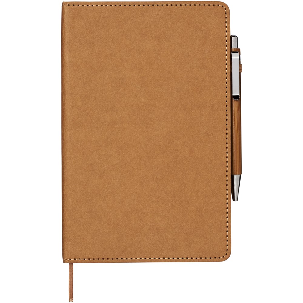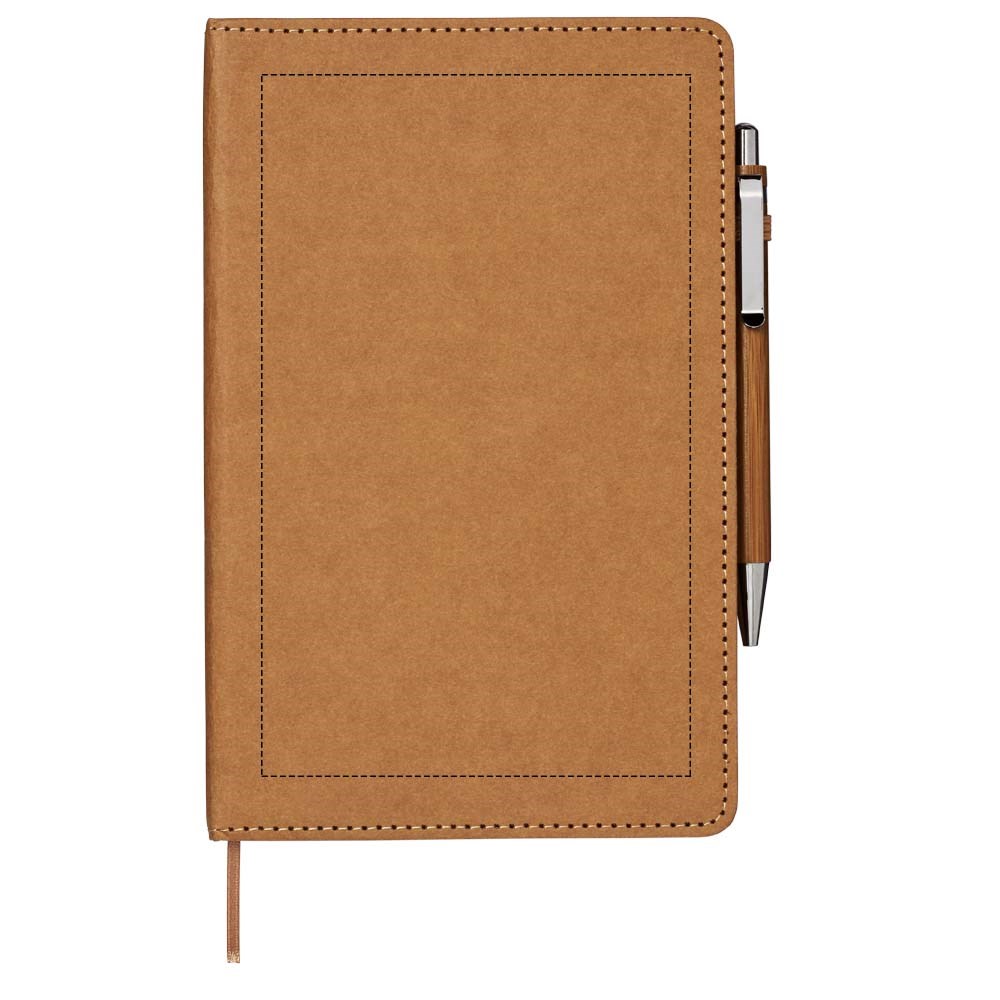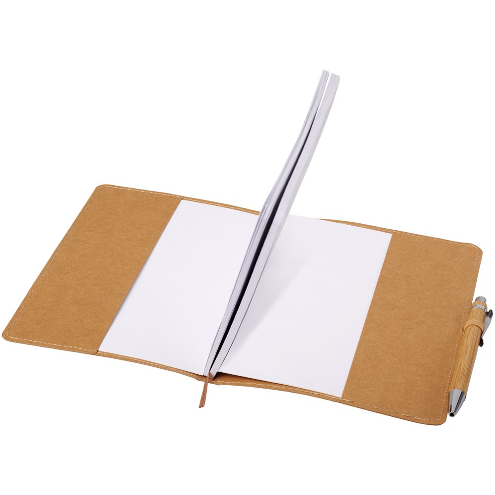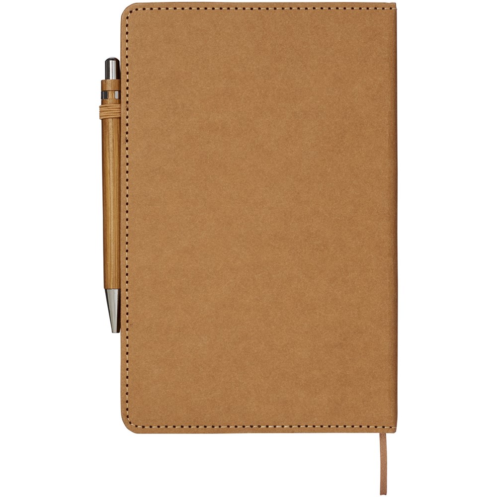 Notitieboekje met een omslag van afwasbaar kraftmateriaal dat eruit ziet als papier, aanvoelt als papier, maar waterbestendig, duurzaam en stevig is. Een handig formaat voor wie liever een kleiner notitieboekje gebruikt. Inclusief bamboebalpen met zwarte navulbare inktvulling.