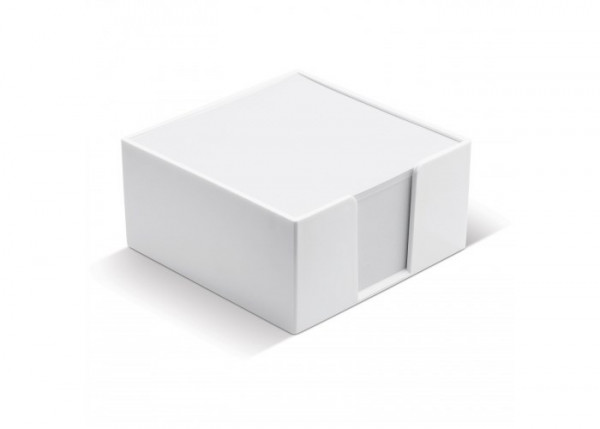 Kubushouder met wit papier. Bedrukking op de zijkanten. Enkelbladsbedrukking mogelijk. Circa 320 houtvrije blaadjes. Wordt per stuk geseald.