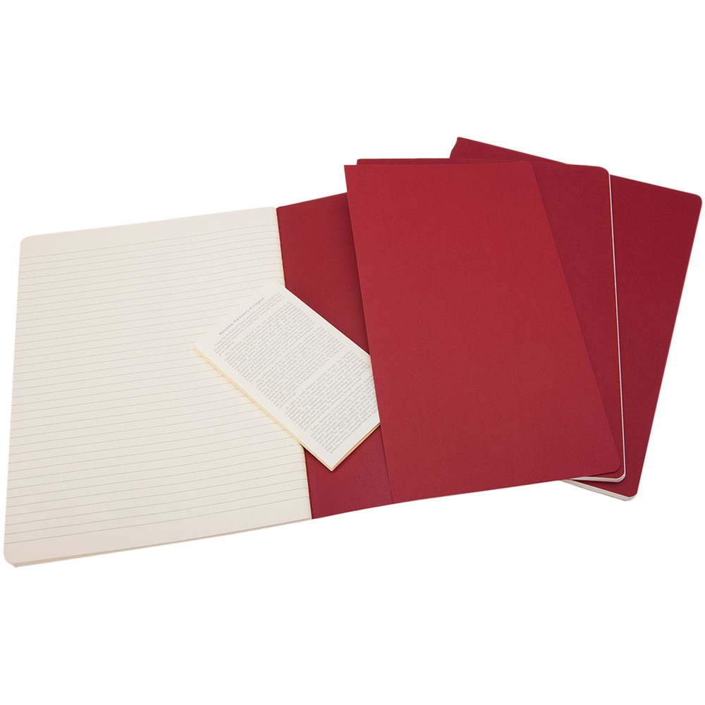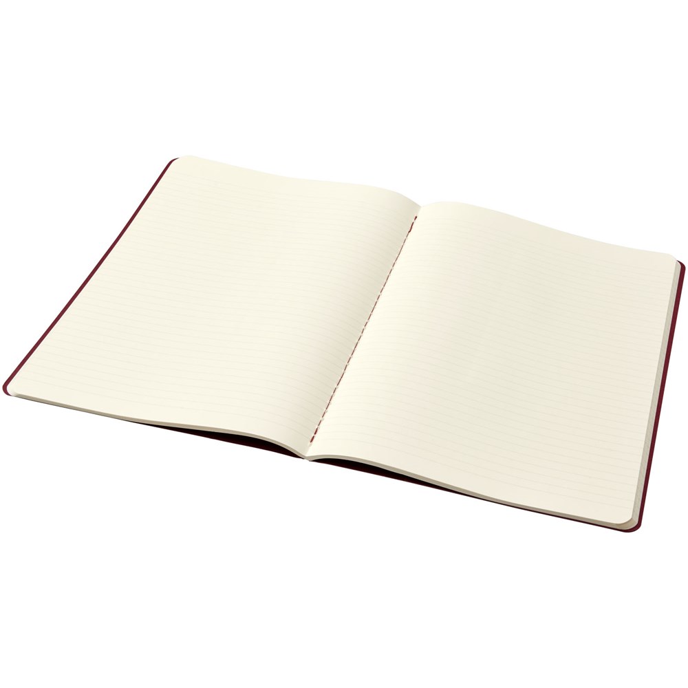 Bevat een kartonnen omslag met afgeronde hoeken. Zichtbare stiksels op de rug, met een flap voor losse notities. Bevat 120 70 gsm ivoorkleurige pagina's met lijntjes. De laatste 16 vellen zijn uitscheurbaar. Pagina's zijn ook verkrijgbaar met stippen, ruitjes en in effen.