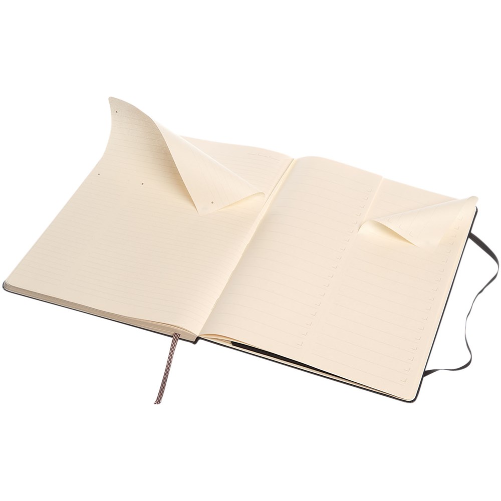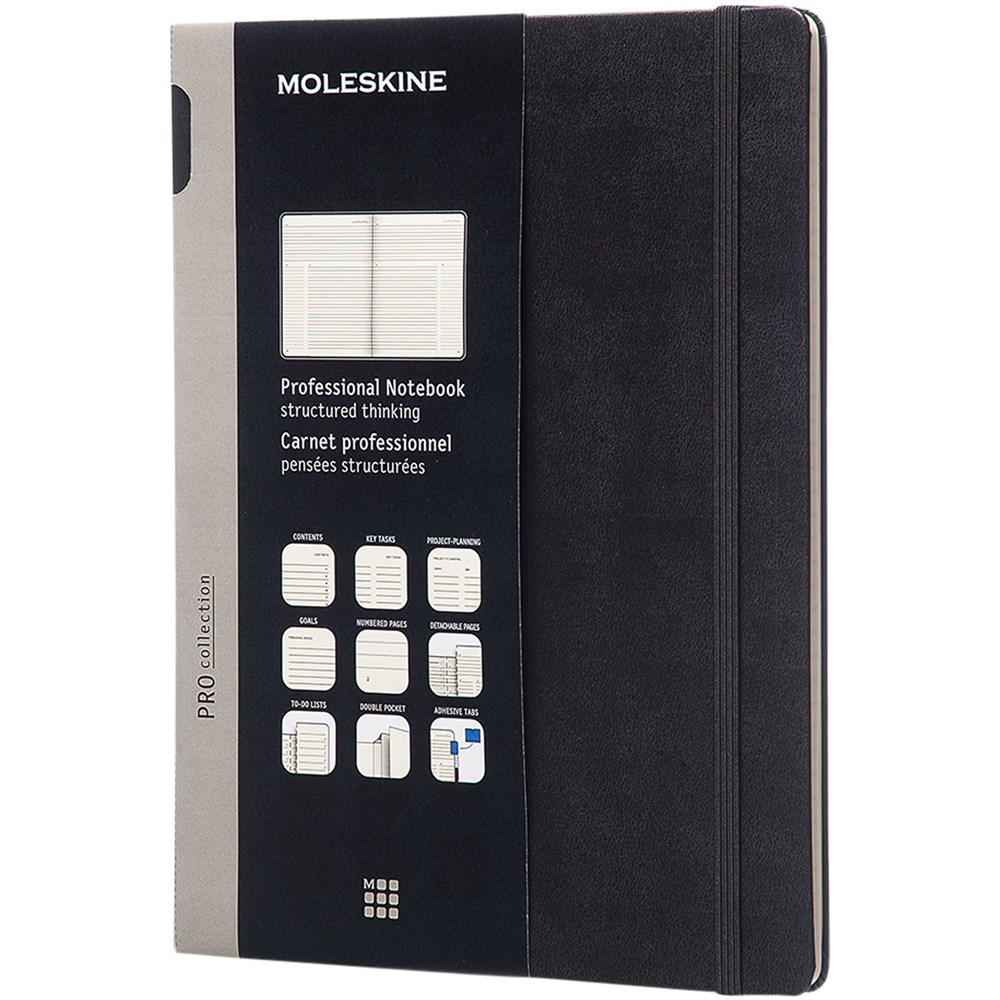 Het Pro Notebook heeft gestructureerde pagina's, genummerde pagina's en een inhoudsopgave voor het bijhouden van je notities. Voorzien van een harde omslag met afgeronde hoeken, ivoorkleurig, 70 g/m2 zuurvrij papier met een bladwijzer in een bijpassende kleur en een elastische sluiting. Het achterblad biedt ruimte voor contactgegevens ‘in geval van verlies’ en de laatste 8 pagina's zijn uitscheurbaar.