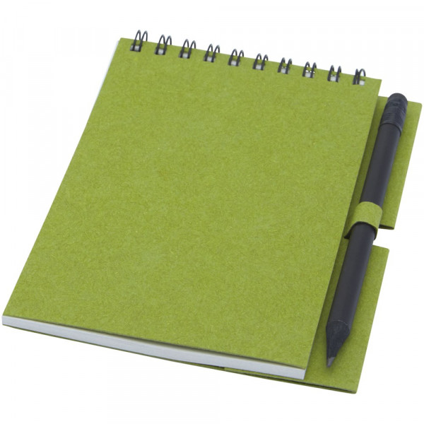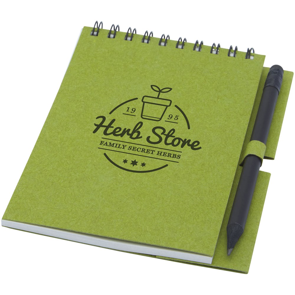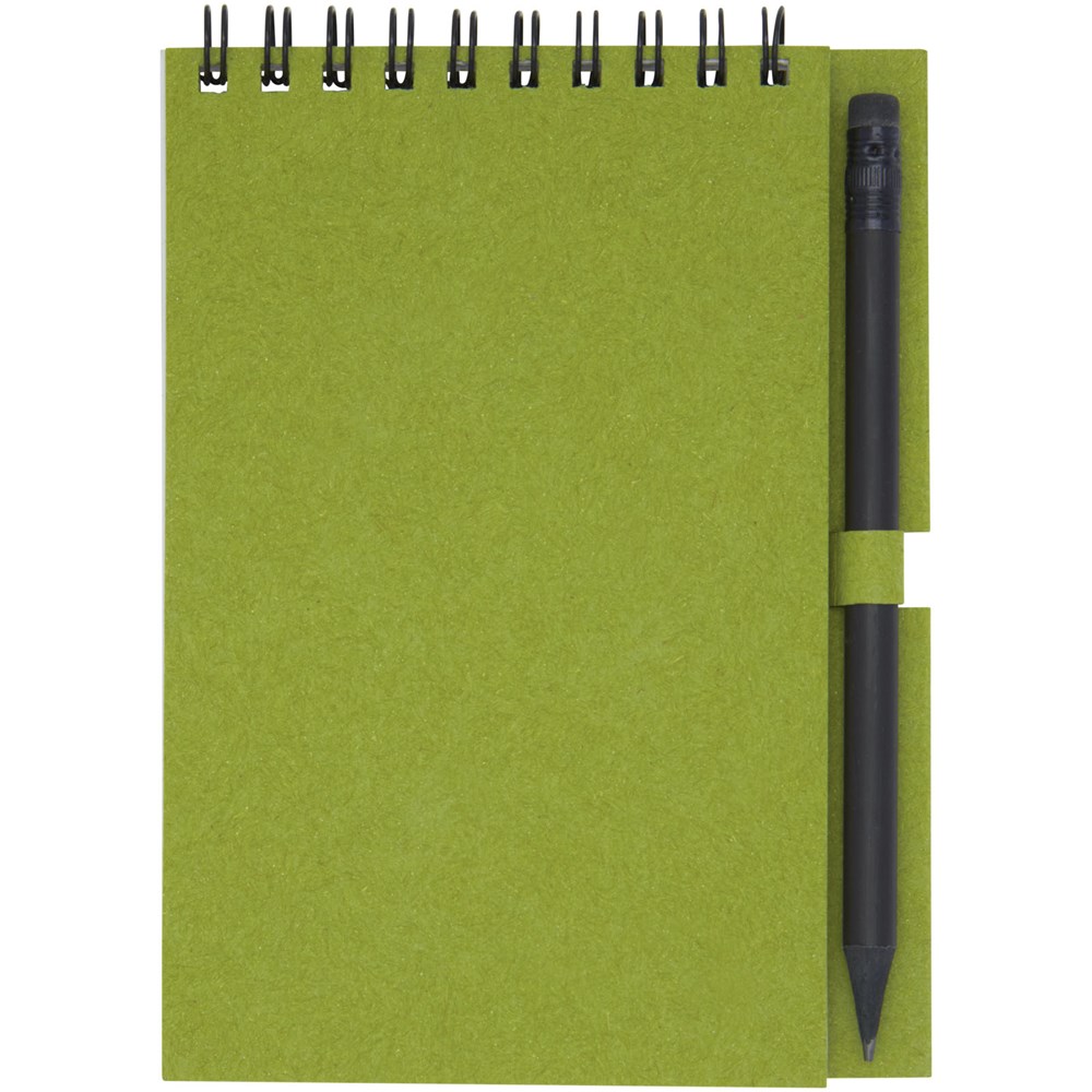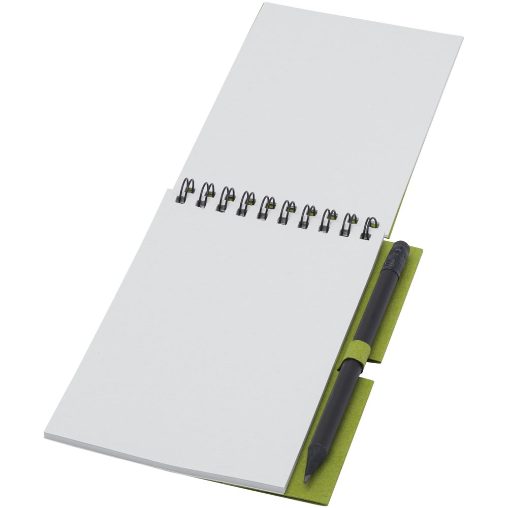 Gerecycled wire-O notitieboek met papieren kaft met 40 vellen, 80 g/m² blanco FSC gerecycled papier, en een zwart potlood. Het notitieboekje is gemaakt in Italië.