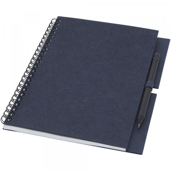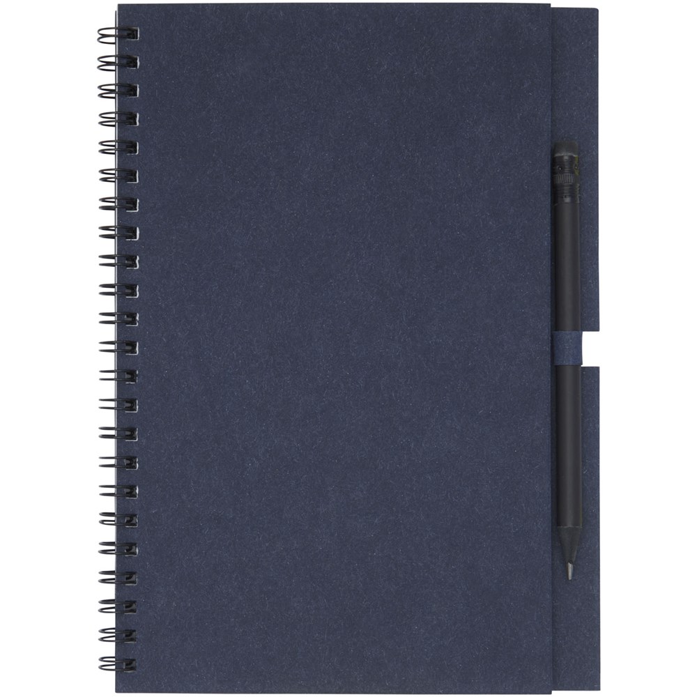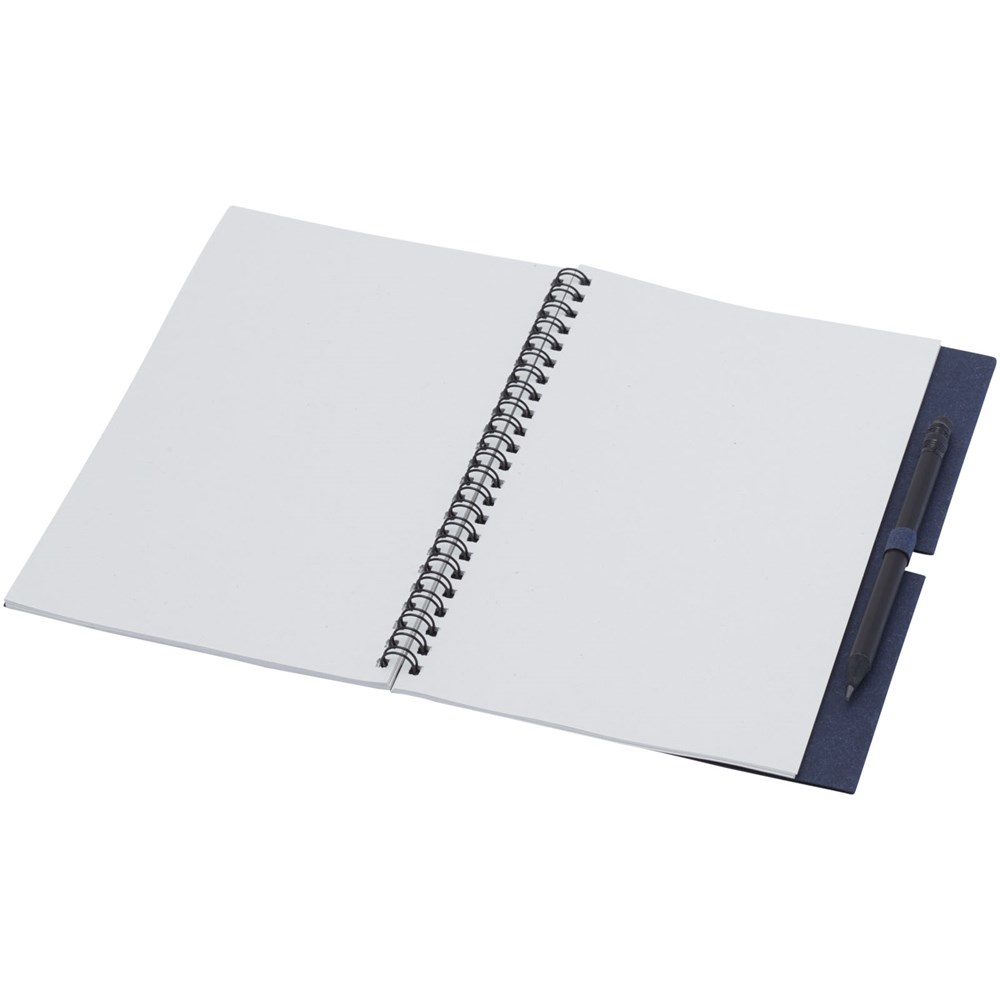 Gerecycled wire-O notitieboek met papieren kaft met 40 vellen, 80 g/m² blanco FSC gerecycled papier, en een zwart potlood. Het notitieboekje is gemaakt in Italië.