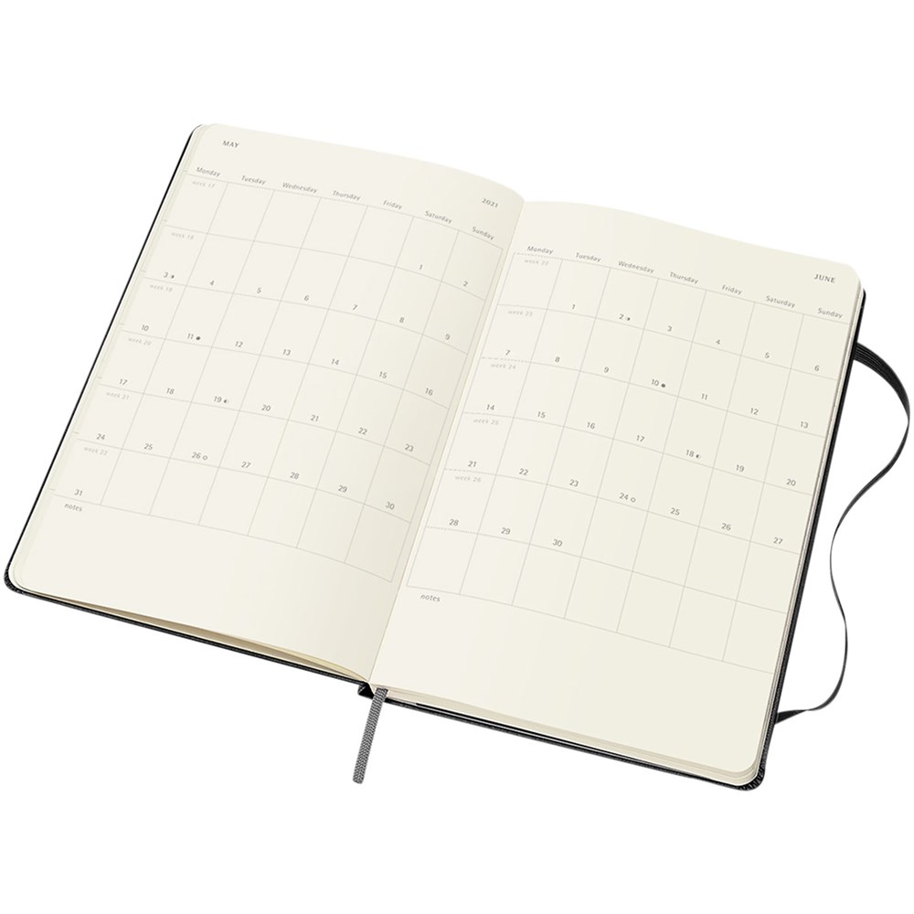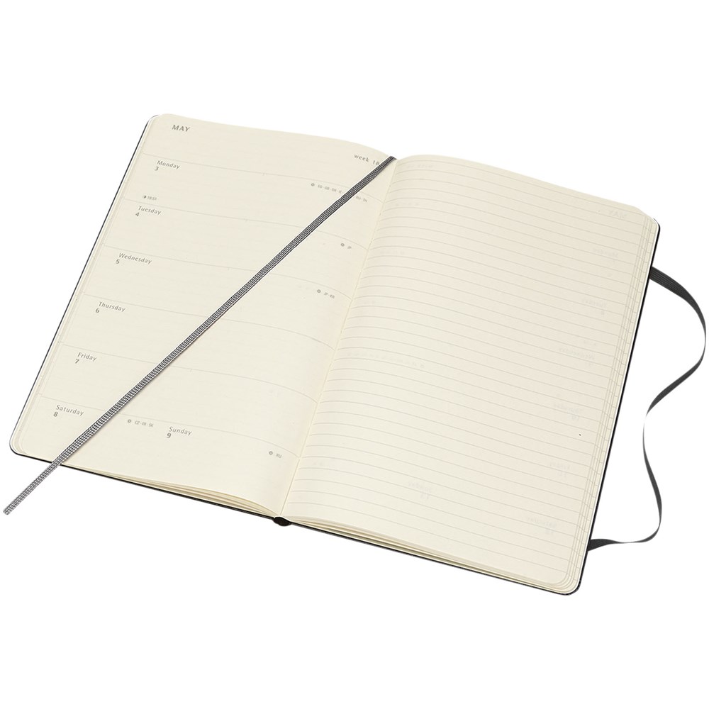 Wekelijkse planner met harde kaft van Moleskine voor januari t/m december 2021, zo ingedeeld dat de wekelijkse afspraken links staan en een gelinieerde pagina voor opmerkingen en ideeën rechts. Voorzien van 70 g/m² ivoorkleurig zuurvrij papier, een zwarte elastische sluiting, paginalintmarkering en een uitklapbare envelop aan de binnenzijde van de achterkaft.