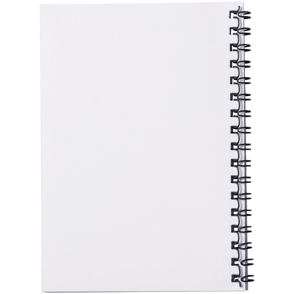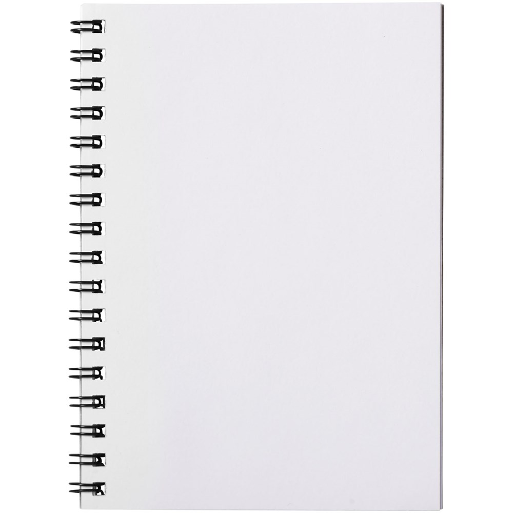 Desk-Mate® spiraal A6 notitieboek. Bevat vellen blanco papier van 80 g/m2. Standaard geleverd met 50 vellen, ook verkrijgbaar met 100 vellen. Notitieboek beschikt over een 500 micron transparant polypropyleen omslag (250g/m2).