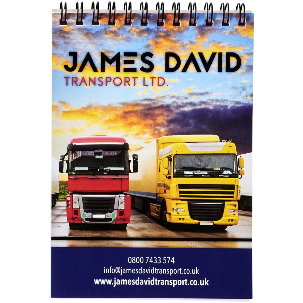 Desk-Mate® spiraal A6 notitieboek. Dit notitieboek heeft een witte of zwarte spiraal. Verkrijgbaar in verschillende maten. Bevat een omslag van glanskarton (250 g/m2) en (80 g/m2) blanco papier. Standaard geleverd met 50 vellen, ook verkrijgbaar met 80 vellen. Decoratie mogelijk op de omslag en op elk blad.