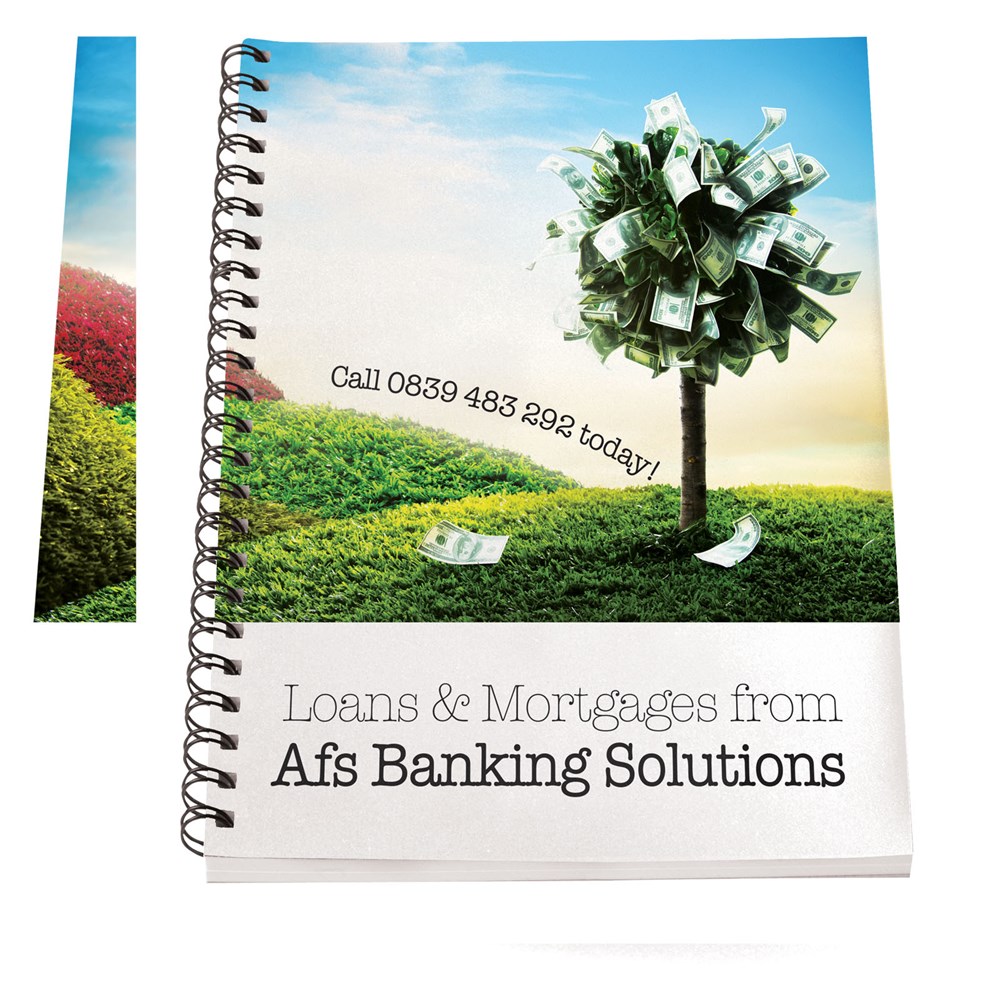 Desk-Mate® A4 spiraal notitieboek. Bevat 50 bladen (80g/m2) blanco papier en een (450g/m2) omslag. De omslag is scheur- en waterdicht. Witte kleur spiraal. Decoratie is mogelijk op de omslag en op elk blad.