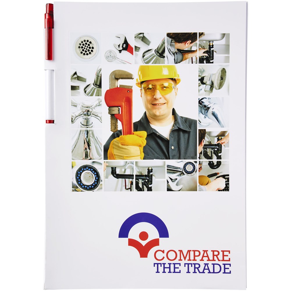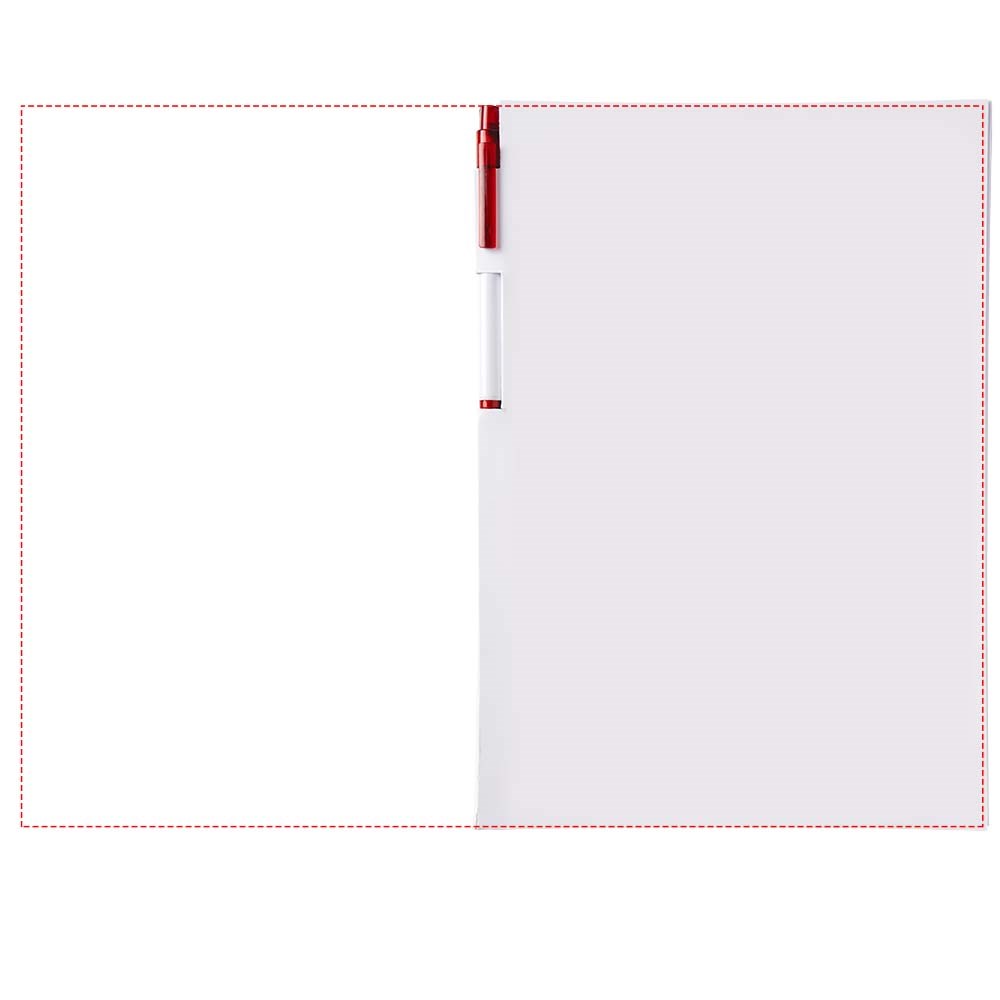 Essential conference set in A4-formaat. Bevat een A4 kladblok met 50 bladen (80g/m2) blanco papier en een ballpointpen in de rug. De conference set heeft een harde omslag (350g/m2). Volledig gekleurde decoratie mogelijk aan beide zijden van de omslag en op elk blad.
