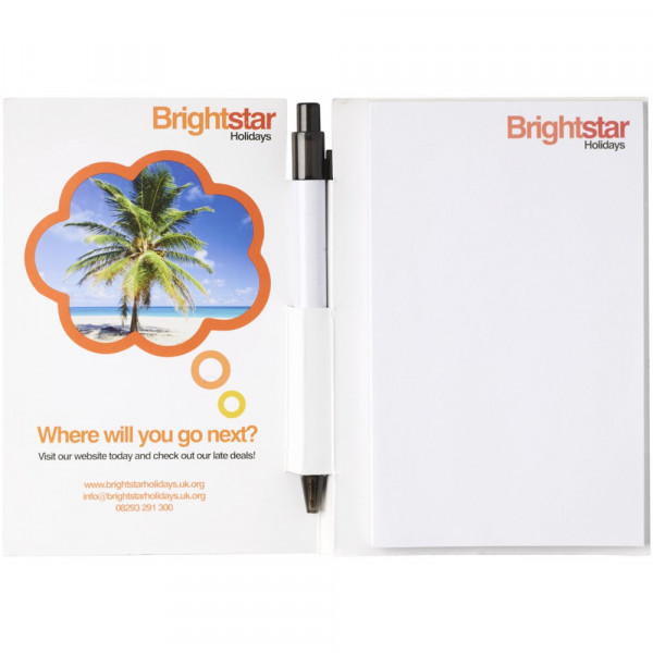 Essential conference set in A5-formaat. Bevat een A5 kladblok met 50 bladen (80g/m2) blanco papier en een ballpointpen in de rug. De conference set heeft een harde omslag (350g/m2). Volledig gekleurde decoratie mogelijk aan beide zijden van de omslag en op elk blad.