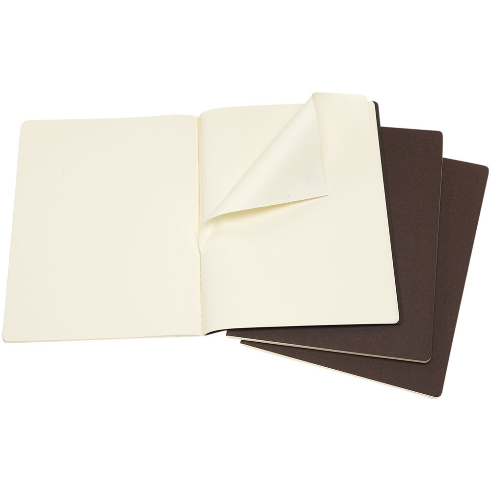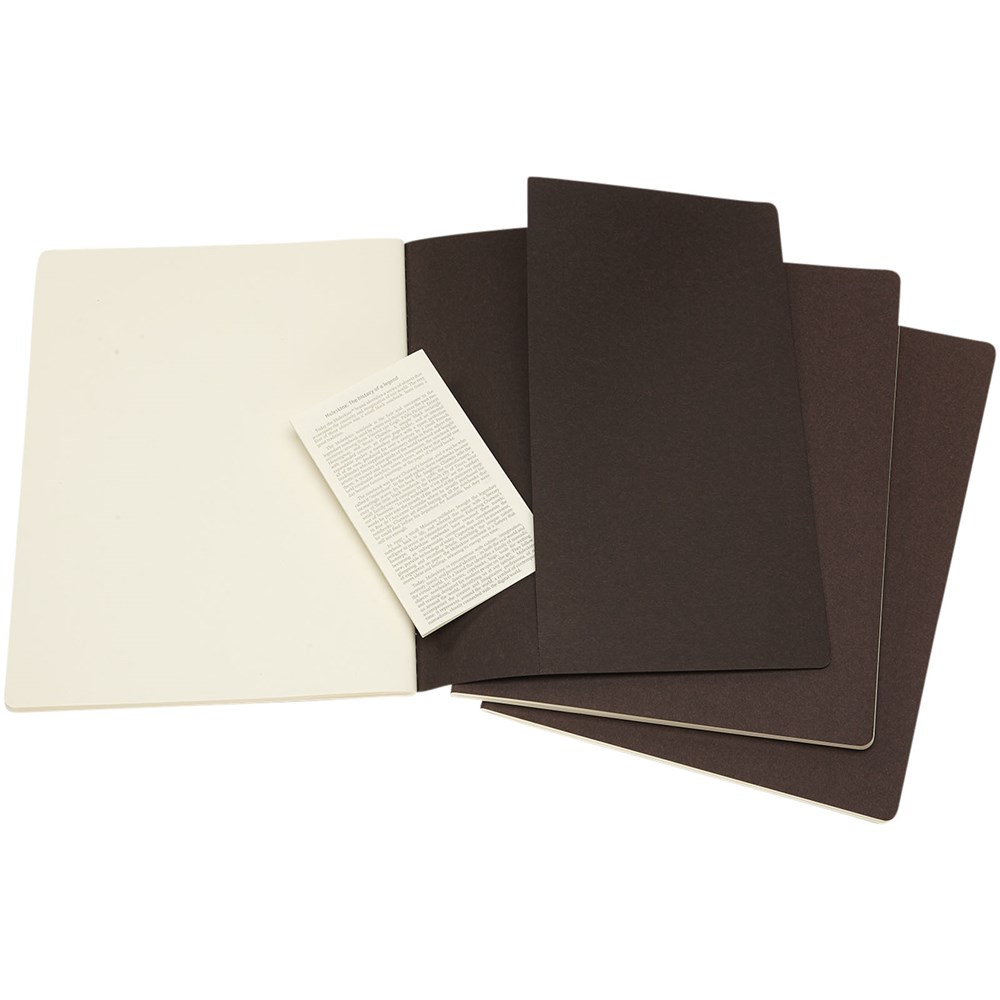 Bevat een kartonnen omslag met afgeronde hoeken. Zichtbare stiksels op de rug, met een flap voor losse notities. Bevat 120 70 gsm ivoorkleurige effen pagina's. De laatste 16 vellen zijn uitscheurbaar. Pagina's zijn ook verkrijgbaar met lijntjes, stippen en ruitjes.