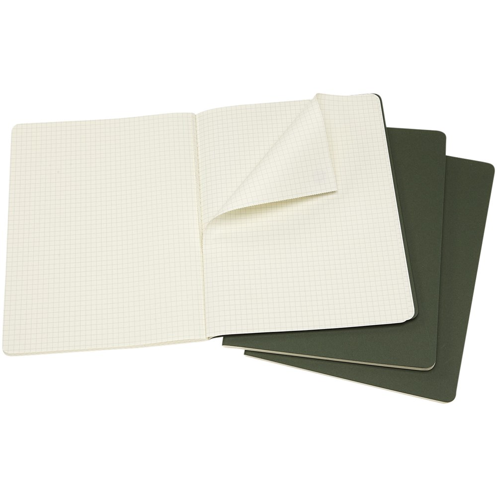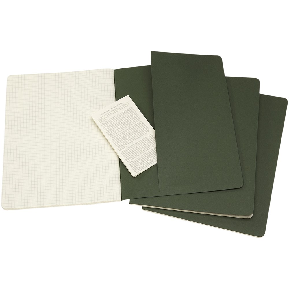 Bevat een kartonnen omslag met afgeronde hoeken. Zichtbare stiksels op de rug, met een flap voor losse notities. Bevat 120 70 gsm ivoorkleurige pagina's met ruitjes. De laatste 16 vellen zijn uitscheurbaar. Pagina's zijn ook verkrijgbaar met ruitjes, stippen en in effen.