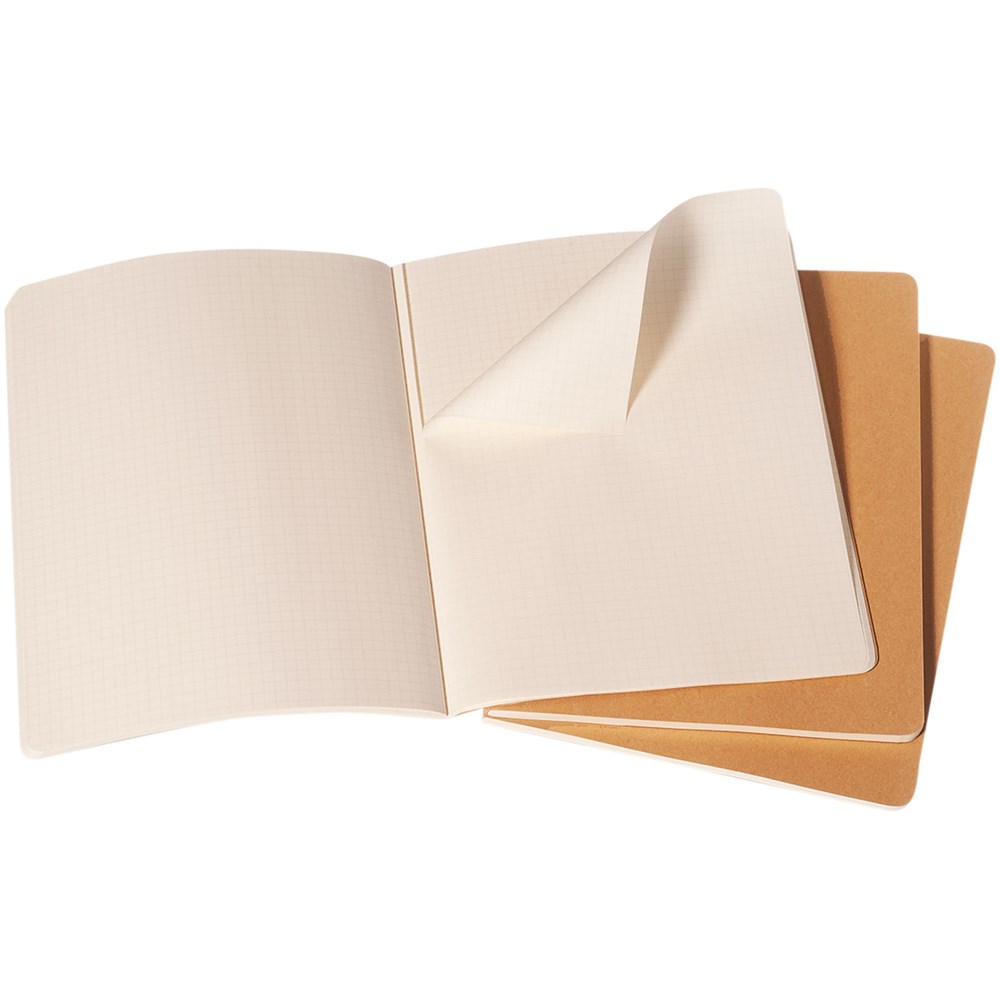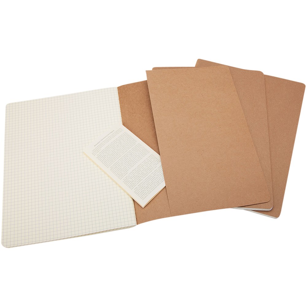 Bevat een kartonnen omslag met afgeronde hoeken. Zichtbare stiksels op de rug, met een flap voor losse notities. Bevat 120 70 gsm ivoorkleurige pagina's met ruitjes. De laatste 16 vellen zijn uitscheurbaar. Pagina's zijn ook verkrijgbaar met ruitjes, stippen en in effen.