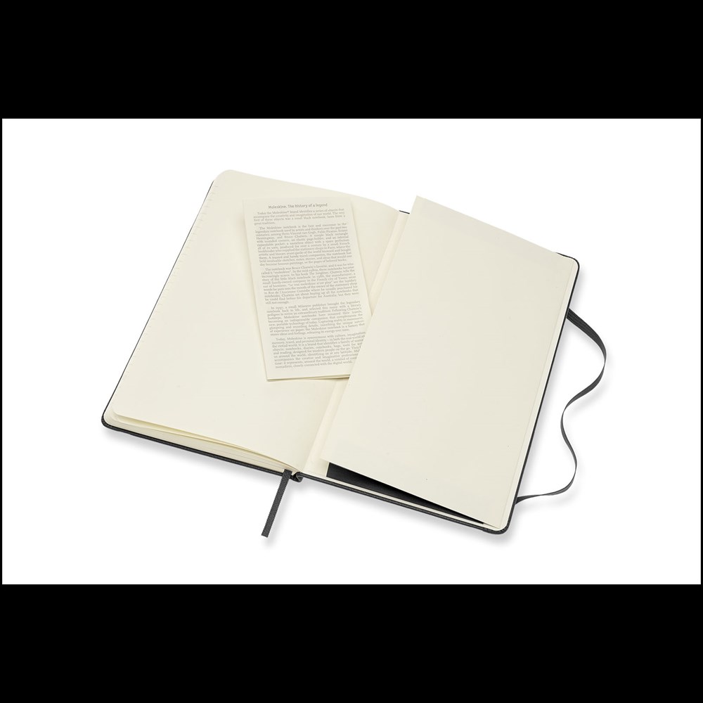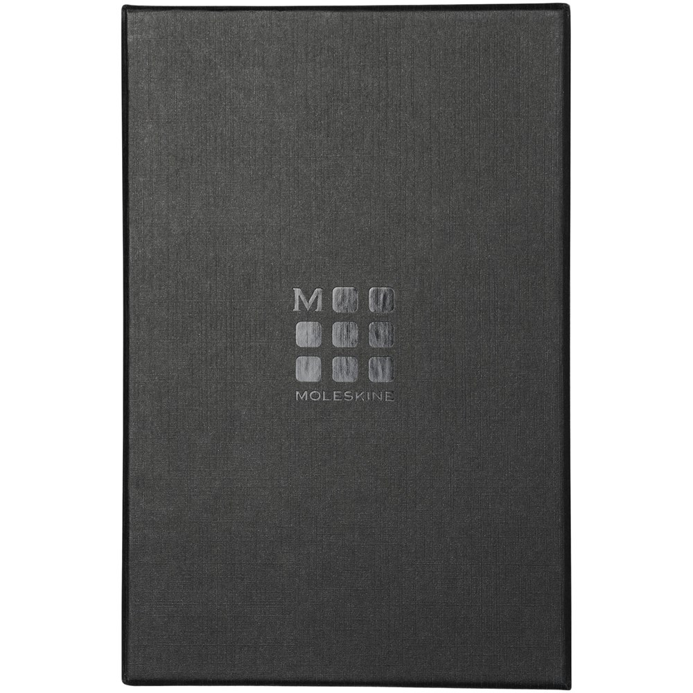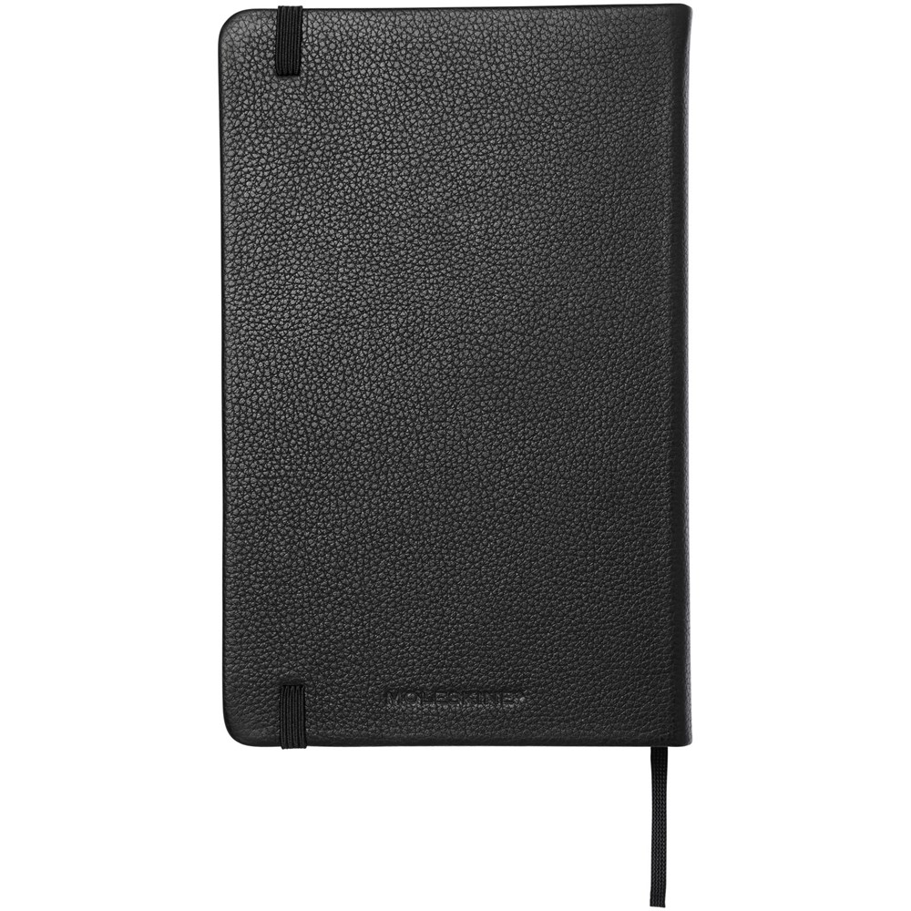 Premium leren notitieboek verkrijgbaar in 4 kleuren en aangeboden in een zwarte Moleskine geschenkverpakking. Met afgeronde hoeken, elastische sluiting en een bladwijzer. Met uitschuifbaar vakje aan de achterkant en bevat 176 pagina's gelinieerd papier in 100 g/m² ivoorkleurig papier. 'In geval van verlies' staat op het schutblad afgedrukt.