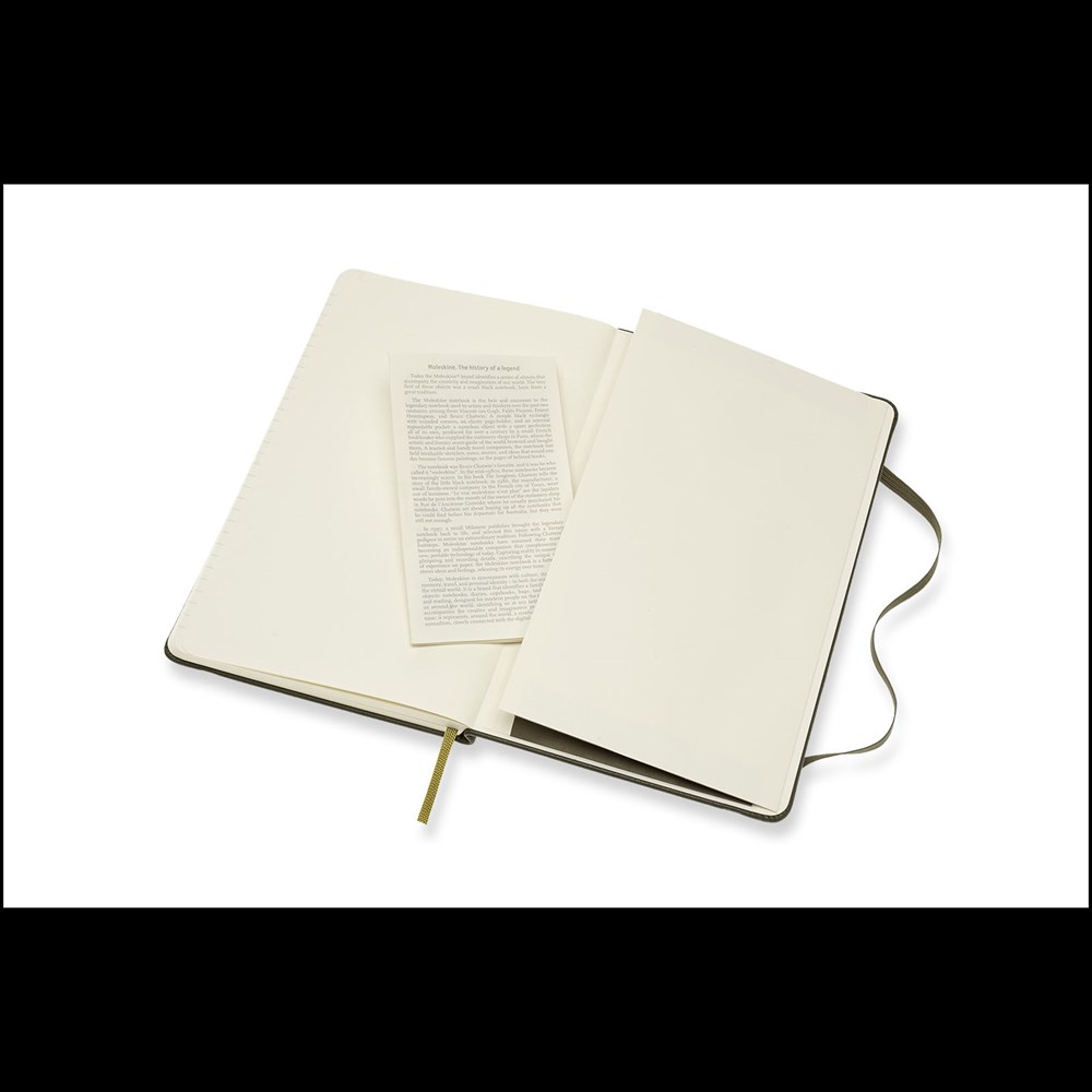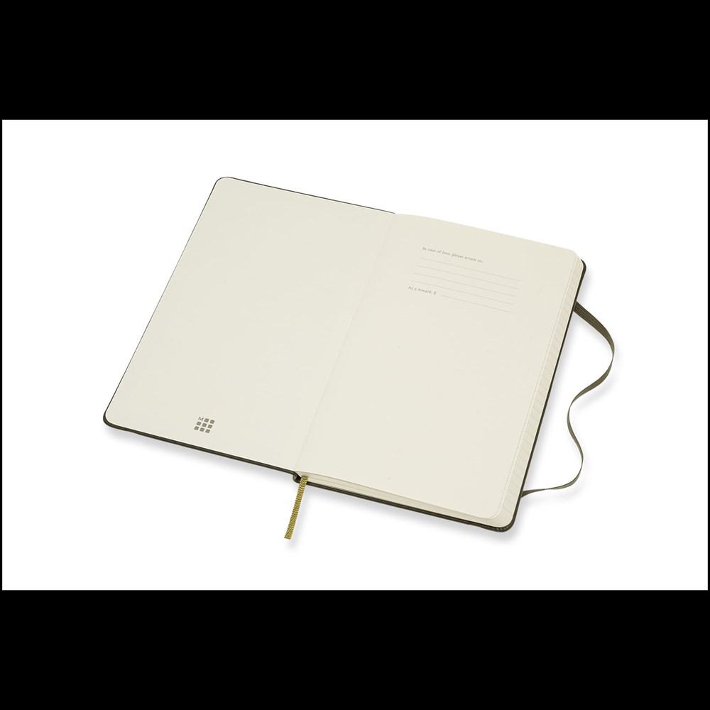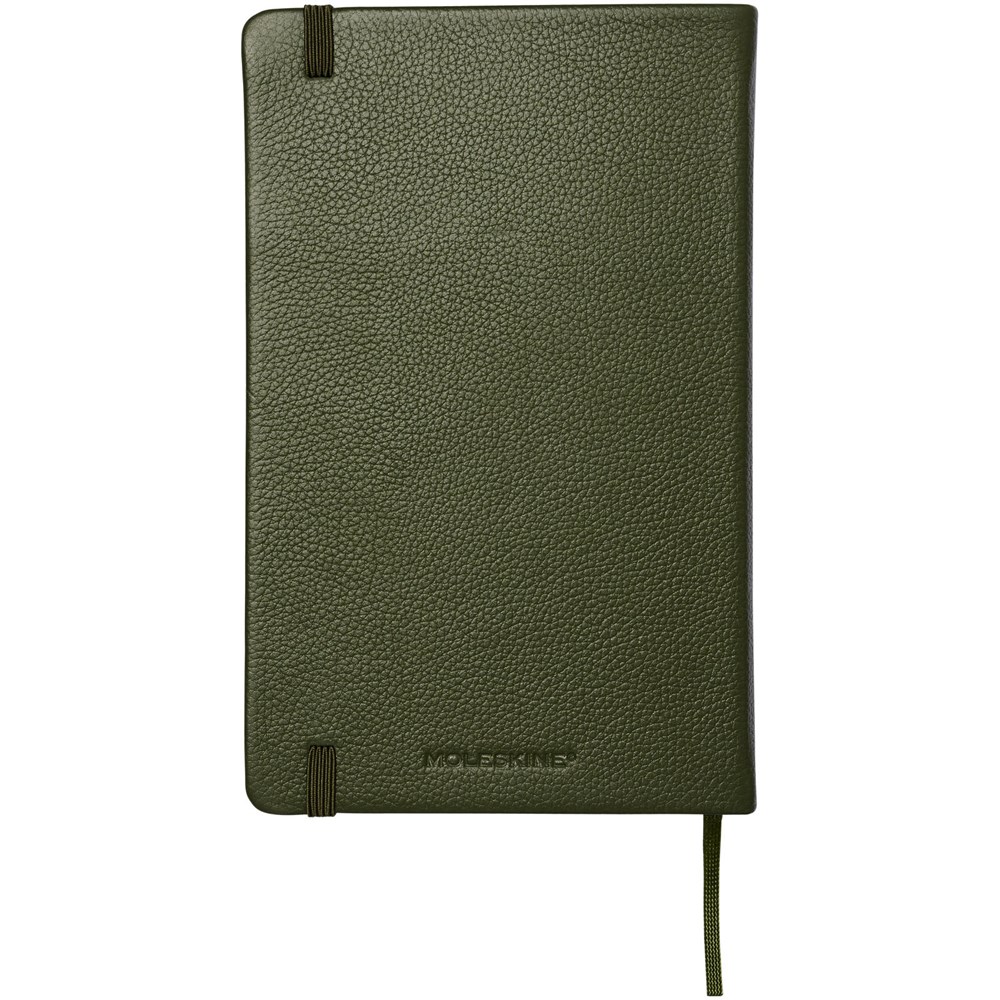 Premium leren notitieboek verkrijgbaar in 4 kleuren en aangeboden in een zwarte Moleskine geschenkverpakking. Met afgeronde hoeken, elastische sluiting en een bladwijzer. Met uitschuifbaar vakje aan de achterkant en bevat 176 pagina's gelinieerd papier in 100 g/m² ivoorkleurig papier. 'In geval van verlies' staat op het schutblad afgedrukt.
