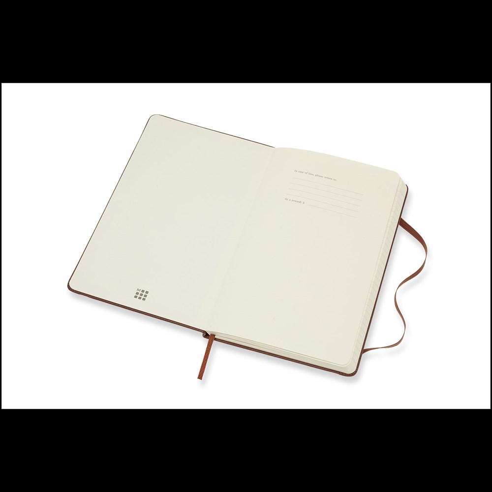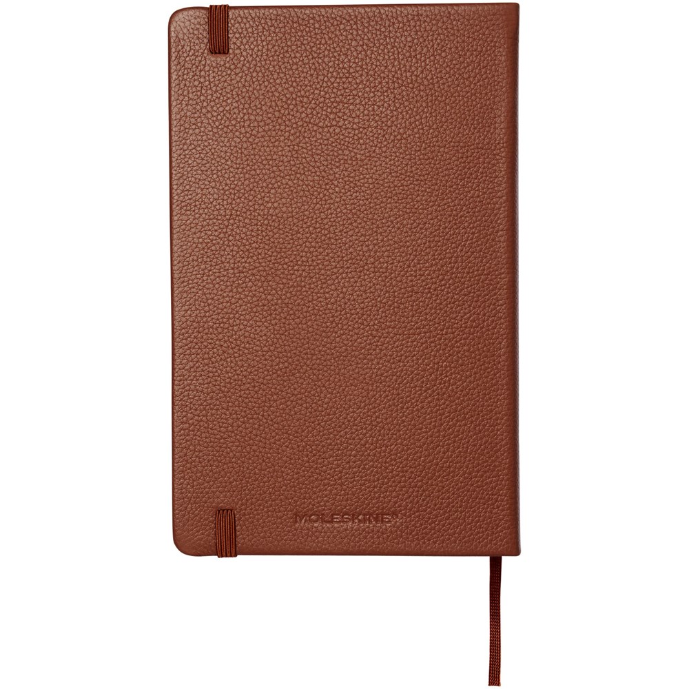 Premium leren notitieboek verkrijgbaar in 4 kleuren en aangeboden in een zwarte Moleskine geschenkverpakking. Met afgeronde hoeken, elastische sluiting en een bladwijzer. Met uitschuifbaar vakje aan de achterkant en bevat 176 pagina's gelinieerd papier in 100 g/m² ivoorkleurig papier. 'In geval van verlies' staat op het schutblad afgedrukt.
